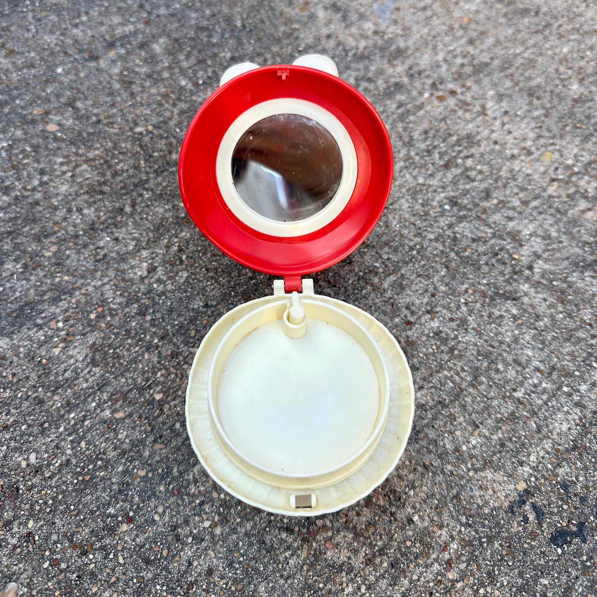 Vintage 1982 Smurfs Musical Jewelry Box. Winds up and plays what I believe to be “Beautiful Dreamer.” The mushroom opens to reveal a small jewelry box and mirror. There is some discoloration but other than that it is in great shape!