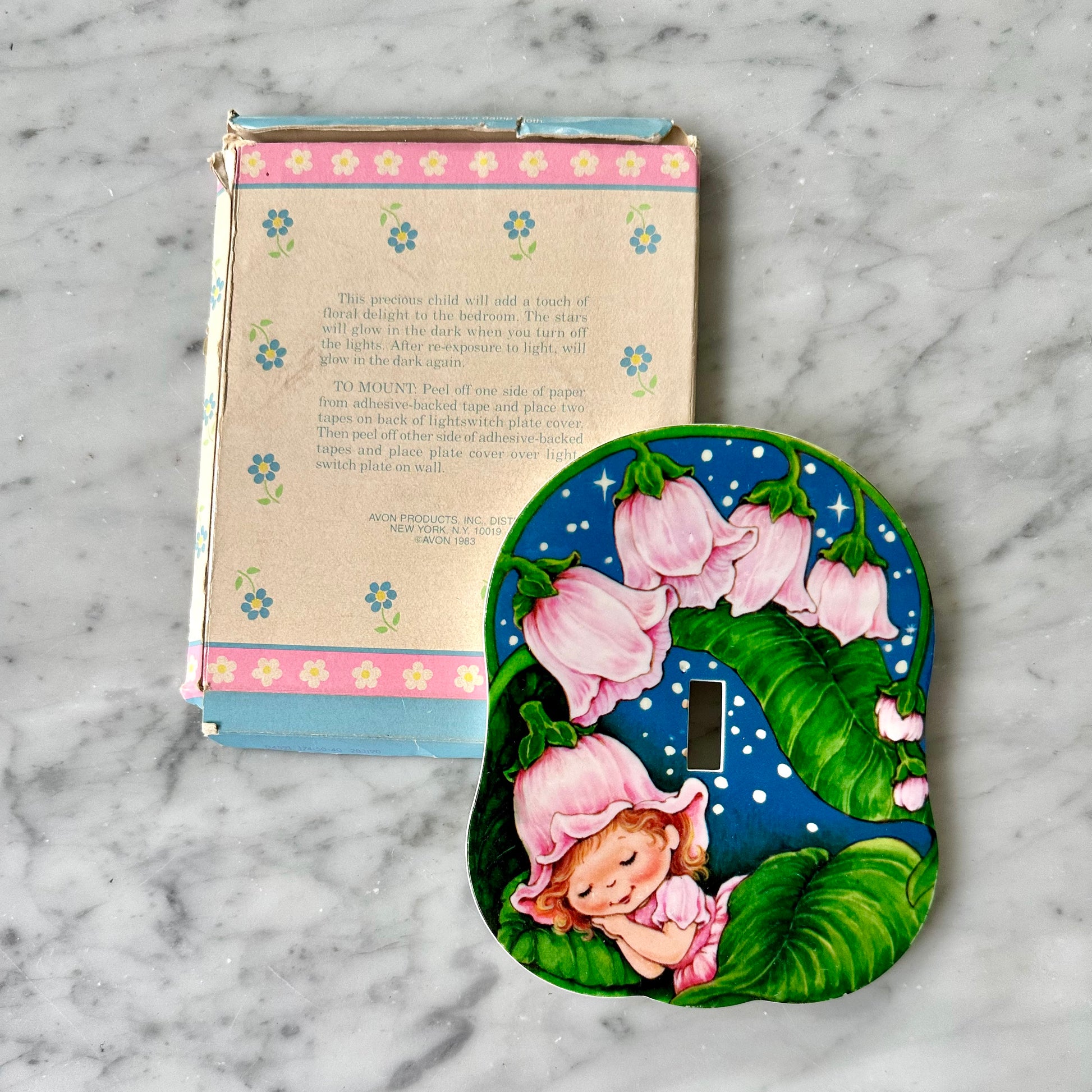 Vintage 1983 Avon Little Blossom Glow-in-the-Dark Light Switch Plate. This comes new in its box. The box shows signs of wear from being in storage for over 40 years but the product itself is in perfect condition.