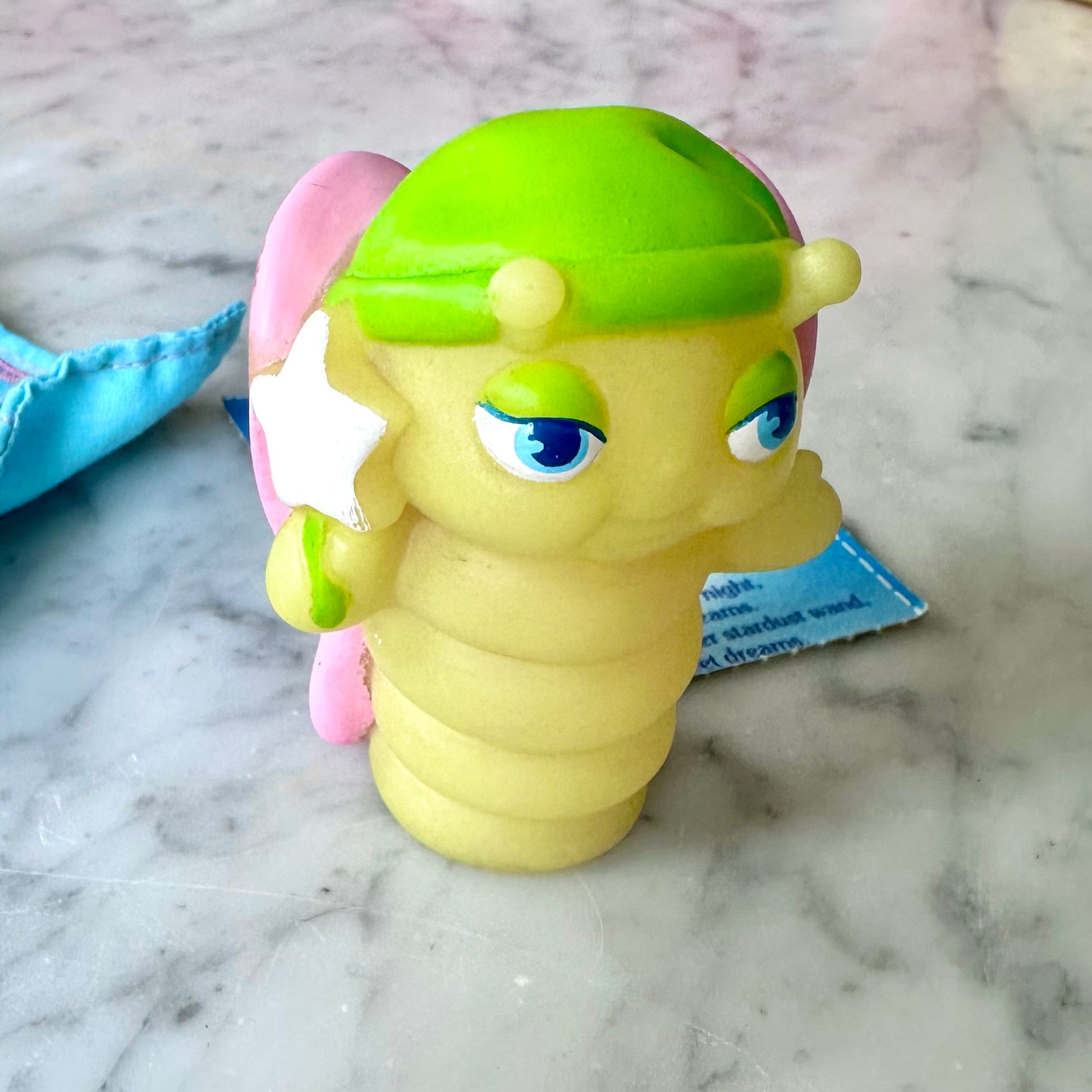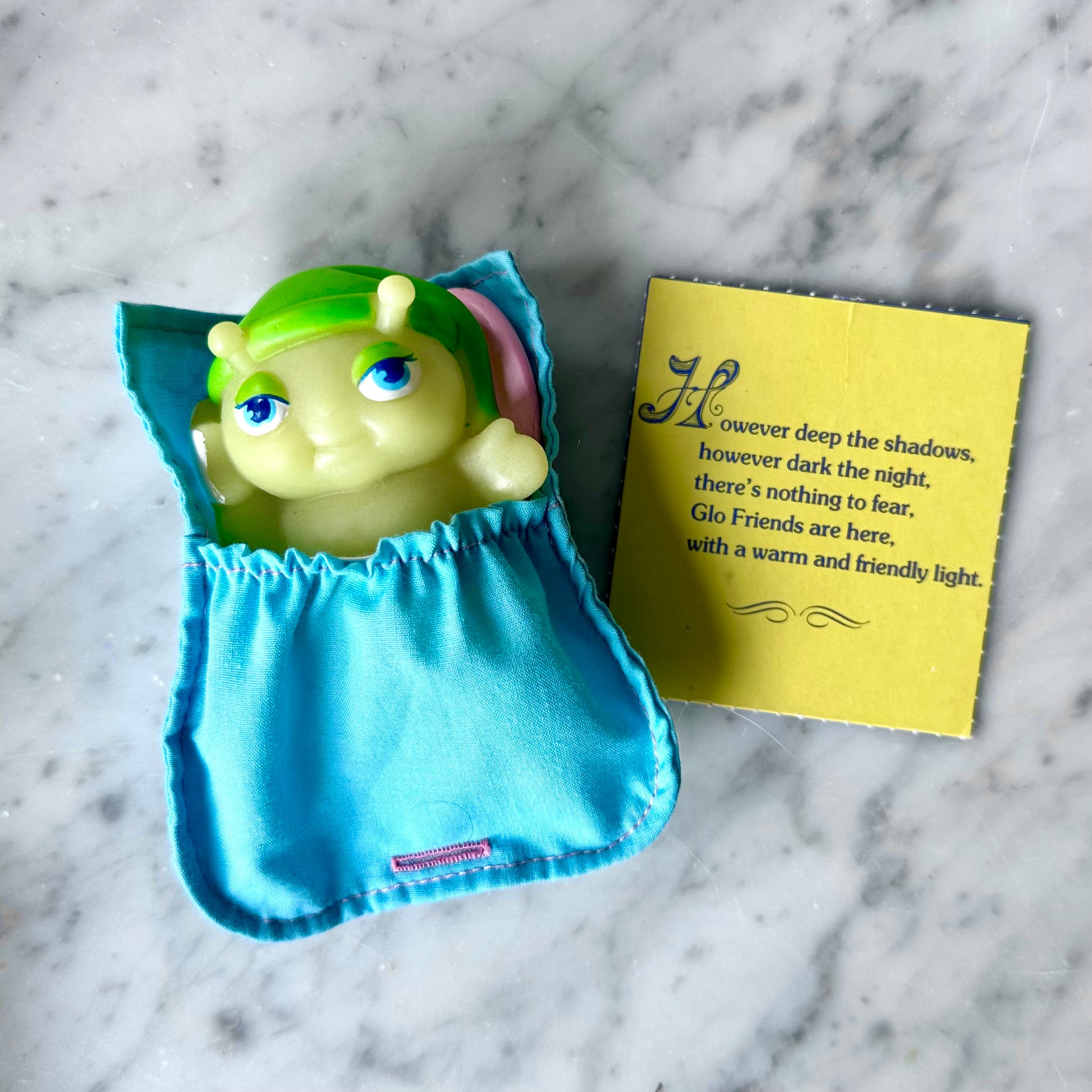 Vintage 1985 Glo Butterly with baby blue sleeping bag and card that was originally in the packaging. This is in played with condition. Card has some bends and the figure has some minor scuffs. Glo-Butterly glows in the dark!