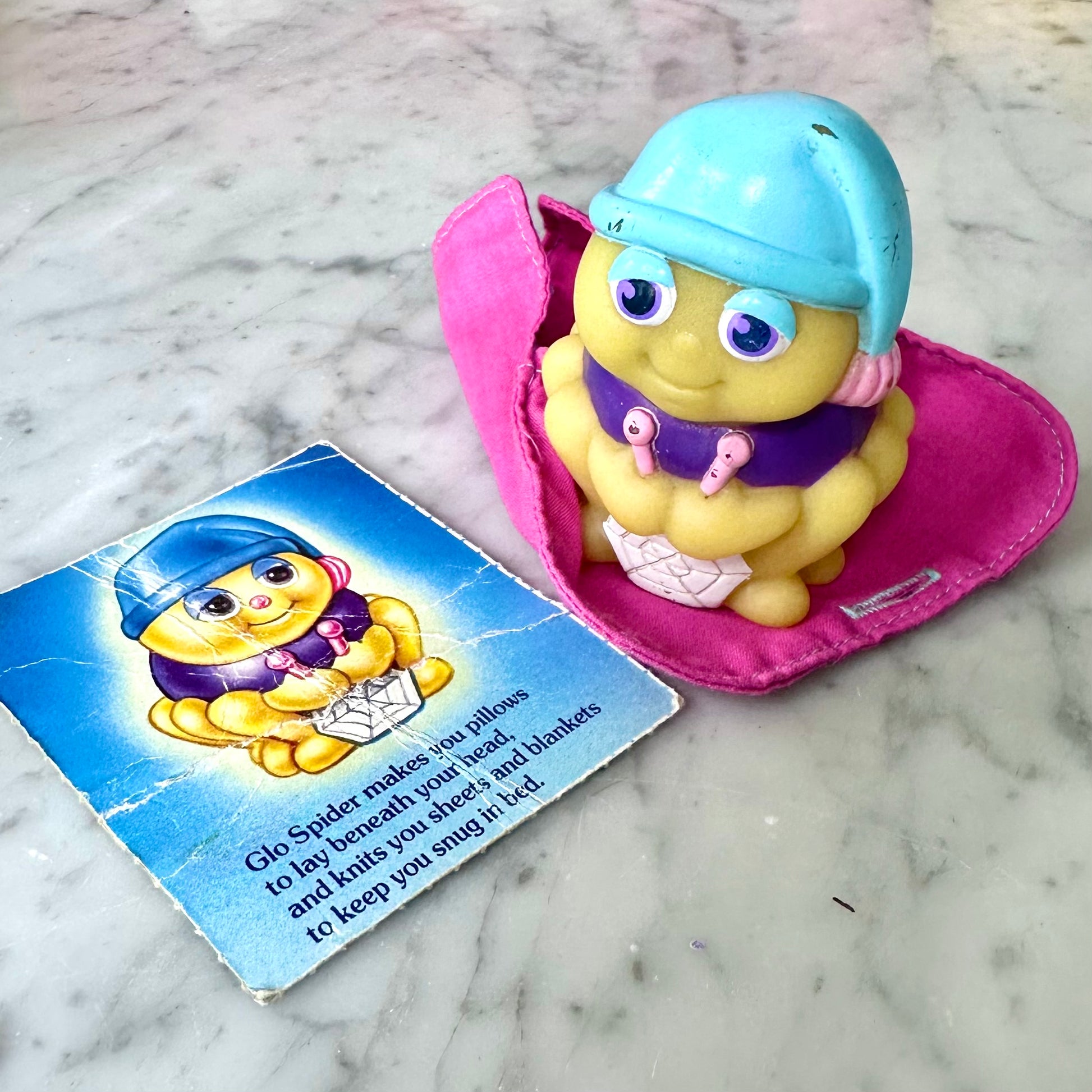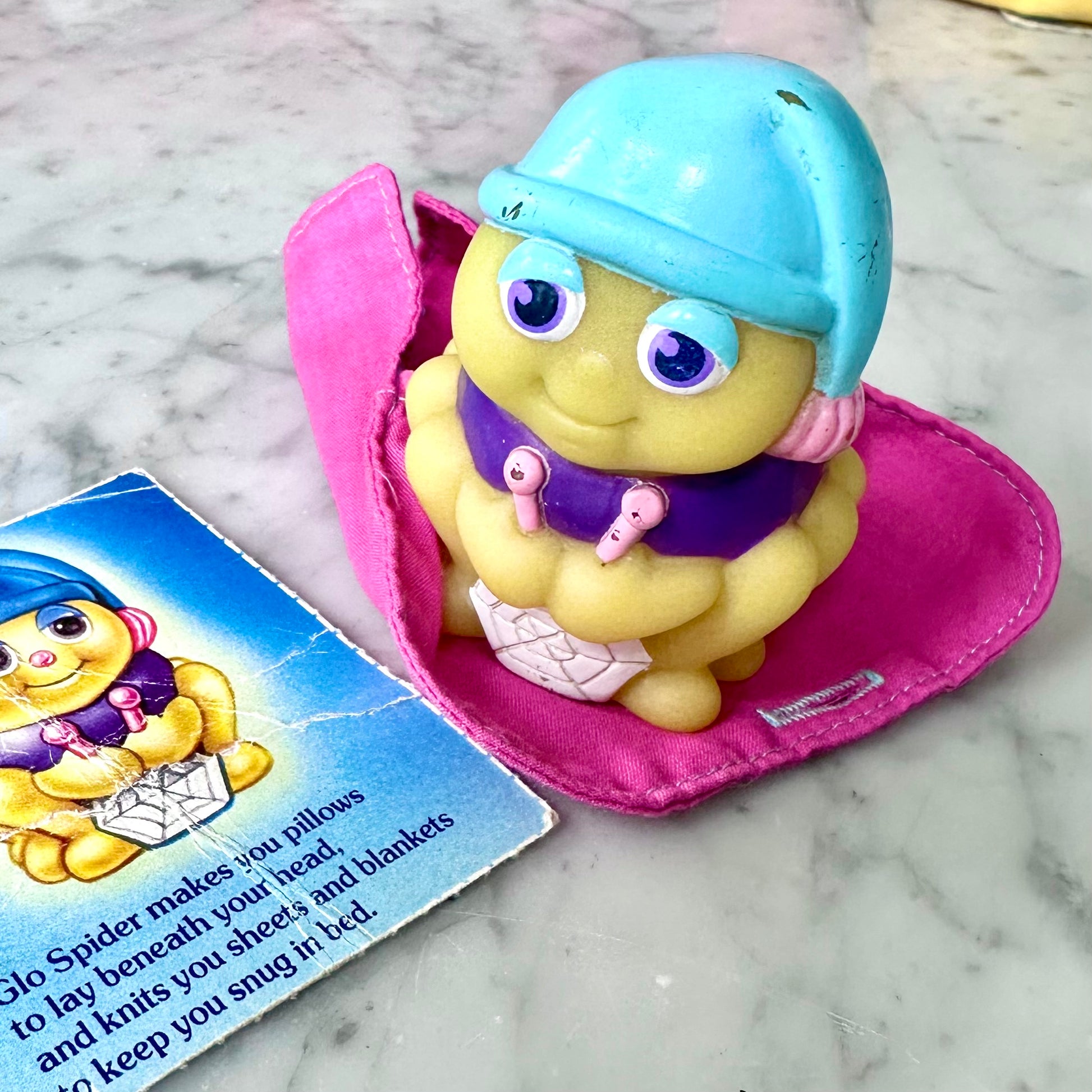 Vintage 1985 Glo Spider with magenta sleeping bag and card that was originally in the packaging. This is in played with condition. Card has some bends and the figure has some minor scuffs. Glo-Spider glows in the dark!