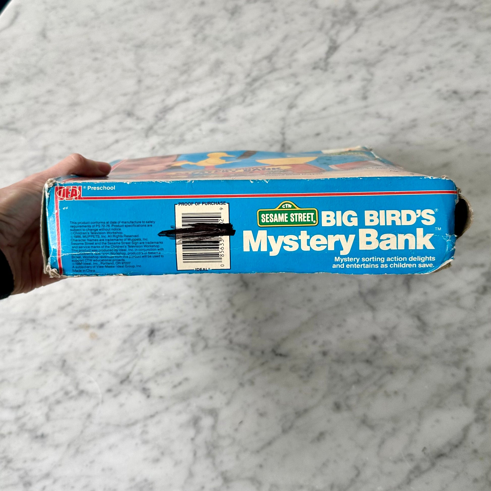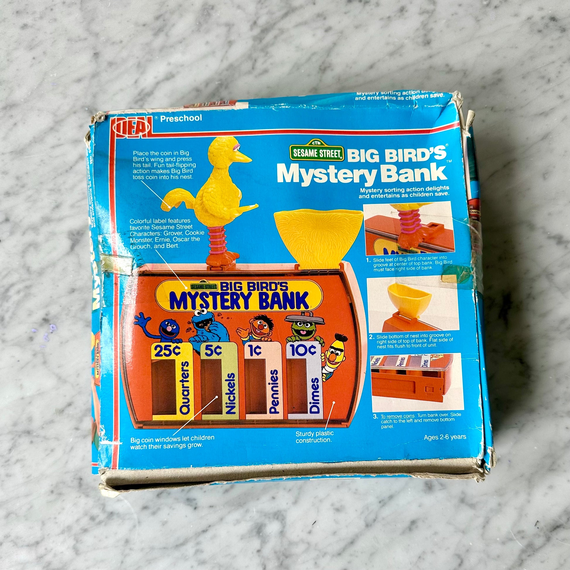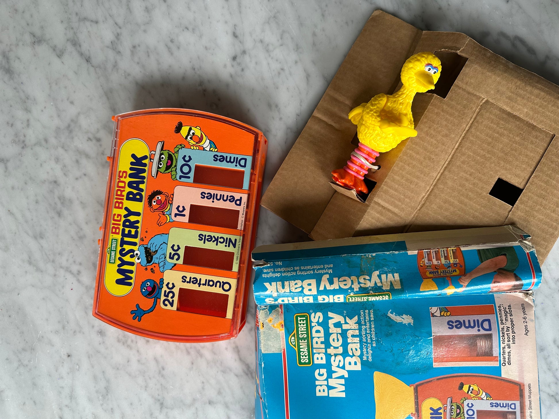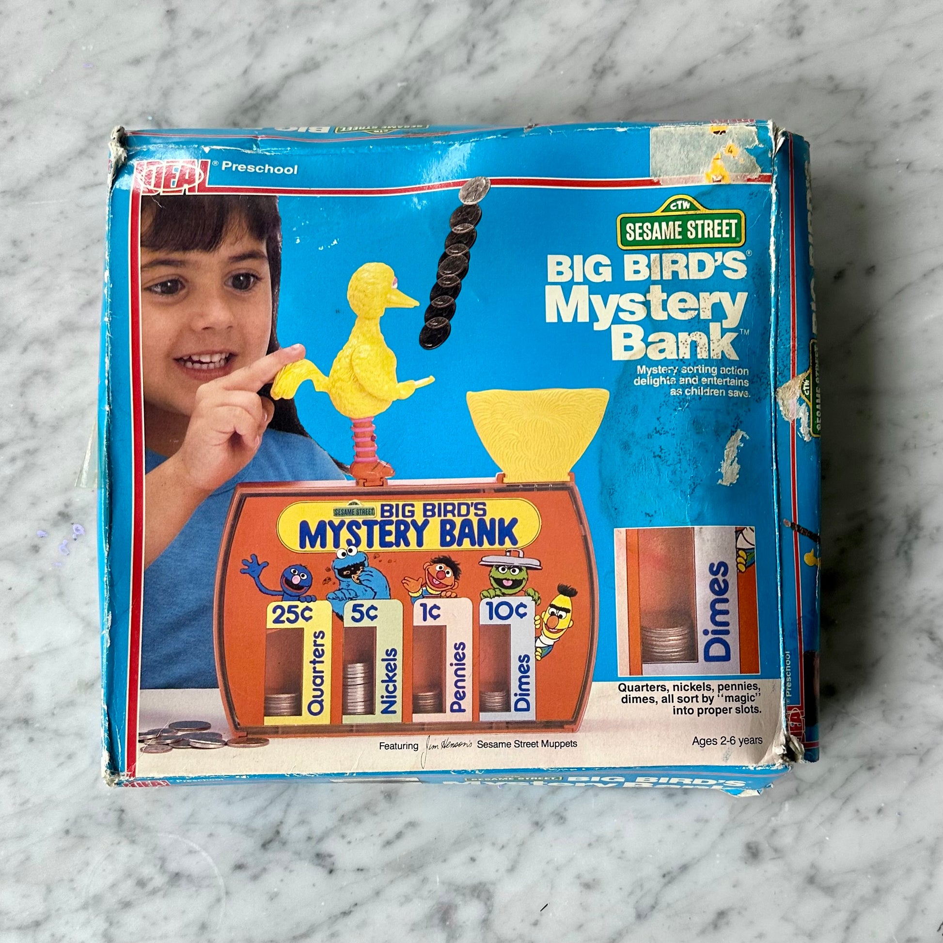 Vintage 1986 Sesame Street Mystery Bank-Mystery Sorting action. This comes in its original box that is pretty beat up but the toy itself is like new.