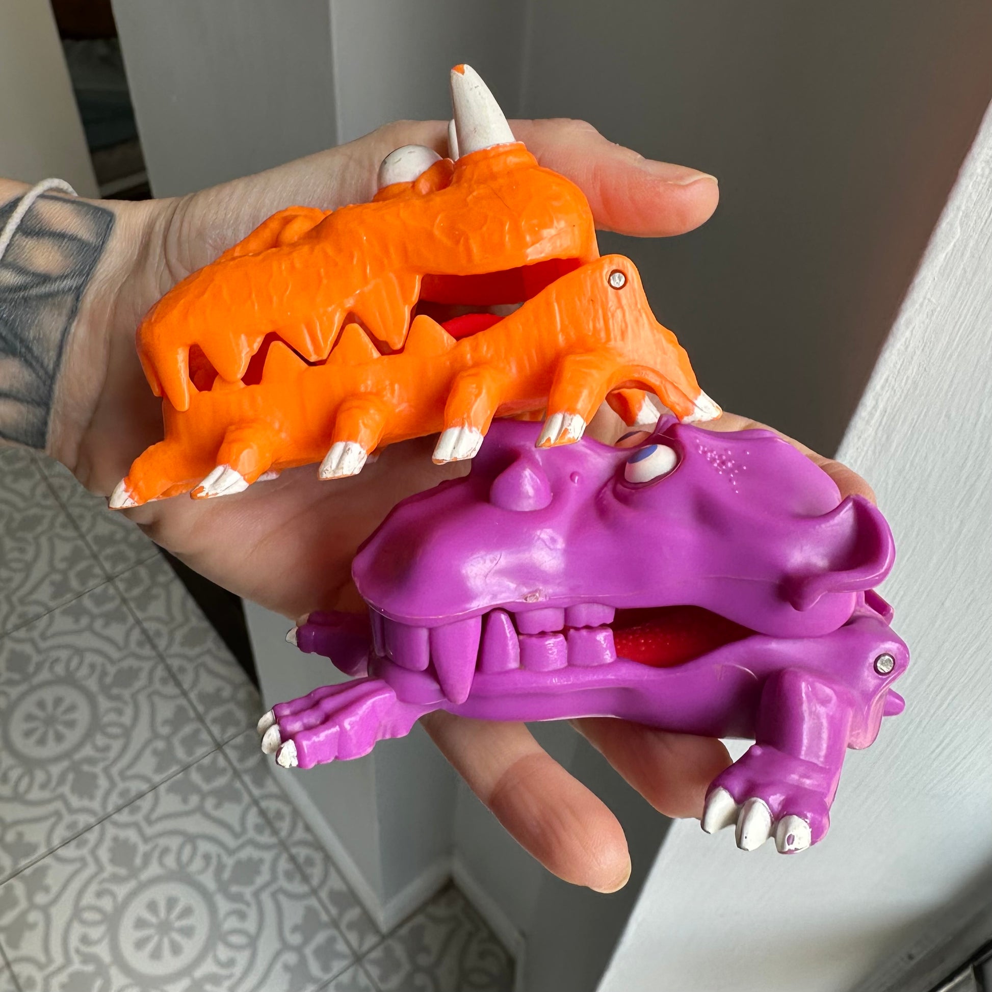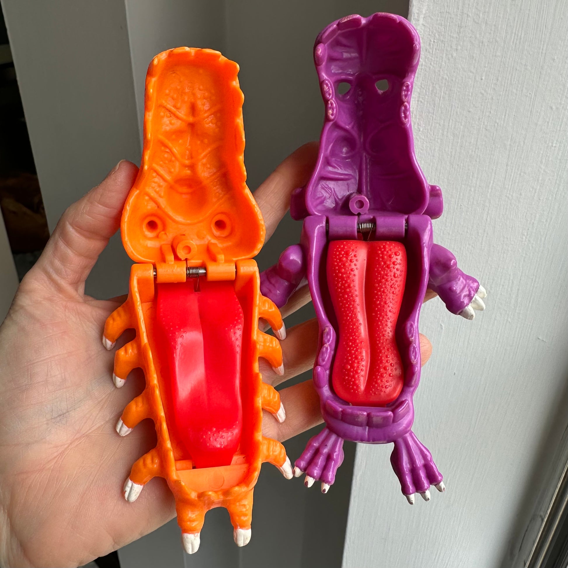 Vintage 1986 The Real Ghostbusters Mini Traps. Open their mouths up all the way to keep them open and when you place a ghost on their tongue, it triggers their mouth to snap closed. These have a few scuffs and are in played with condition. Please see photos for details.