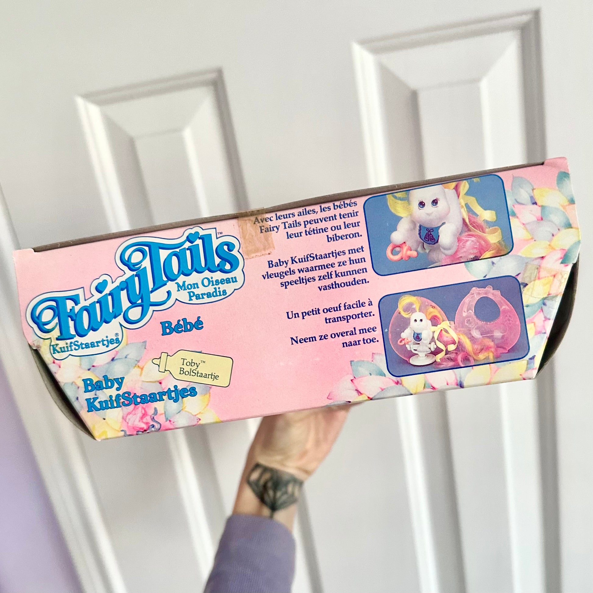 Vintage 1987 French Hasbro Fairy Tails Baby Fliers “Toby” brand new in box, never opened. The plastic has very slight yellowing due to age. There is a tiny spot on the cheek from being pressed in the box.