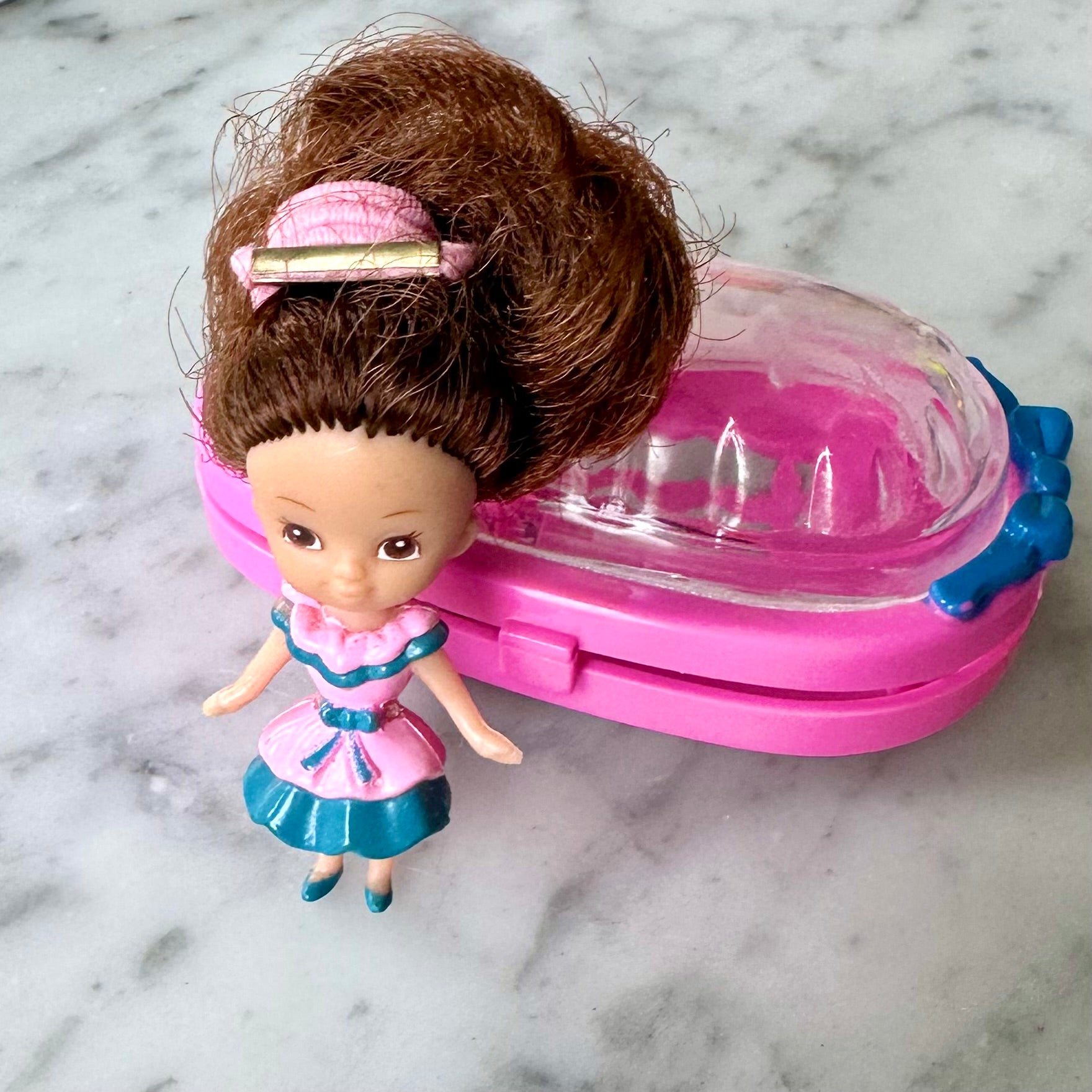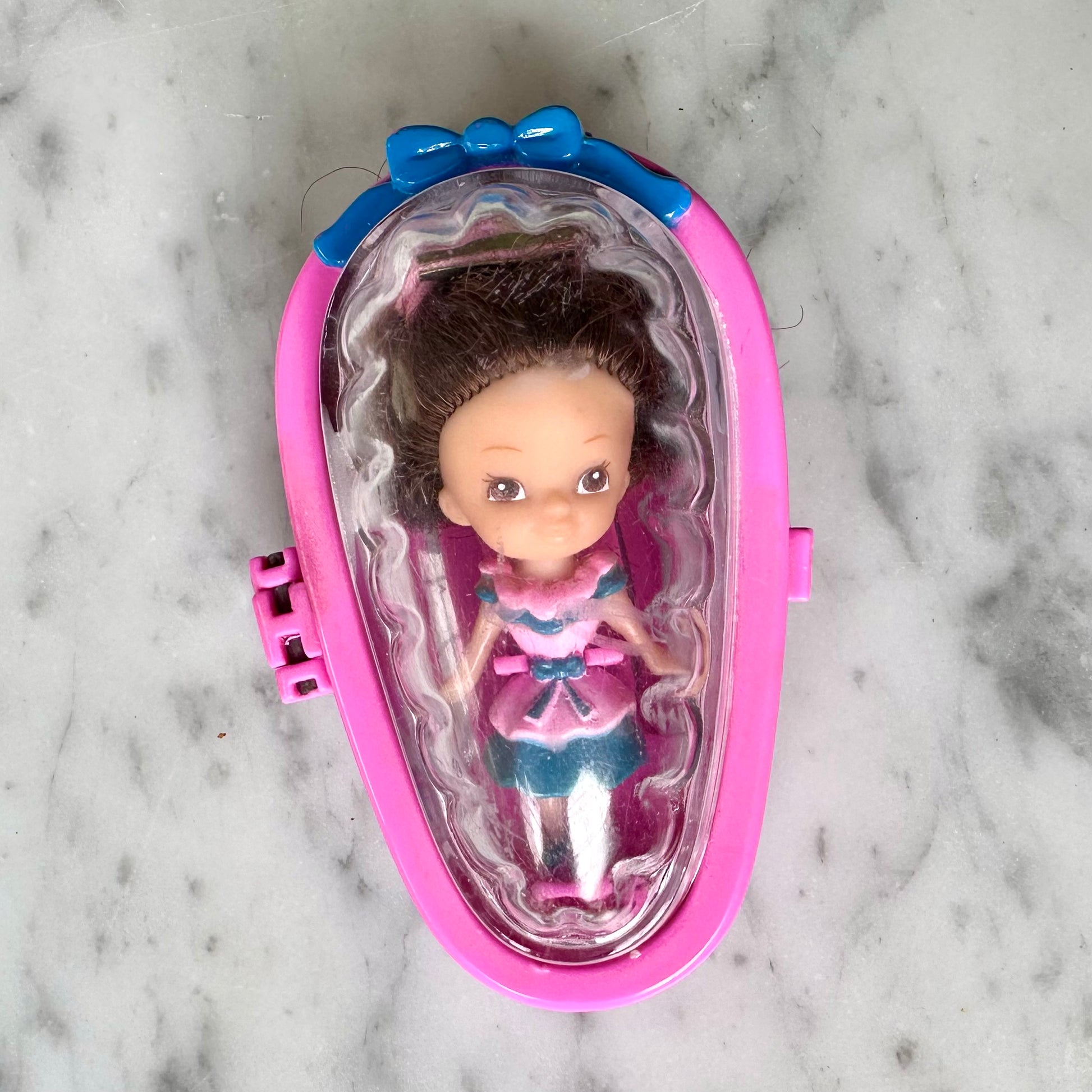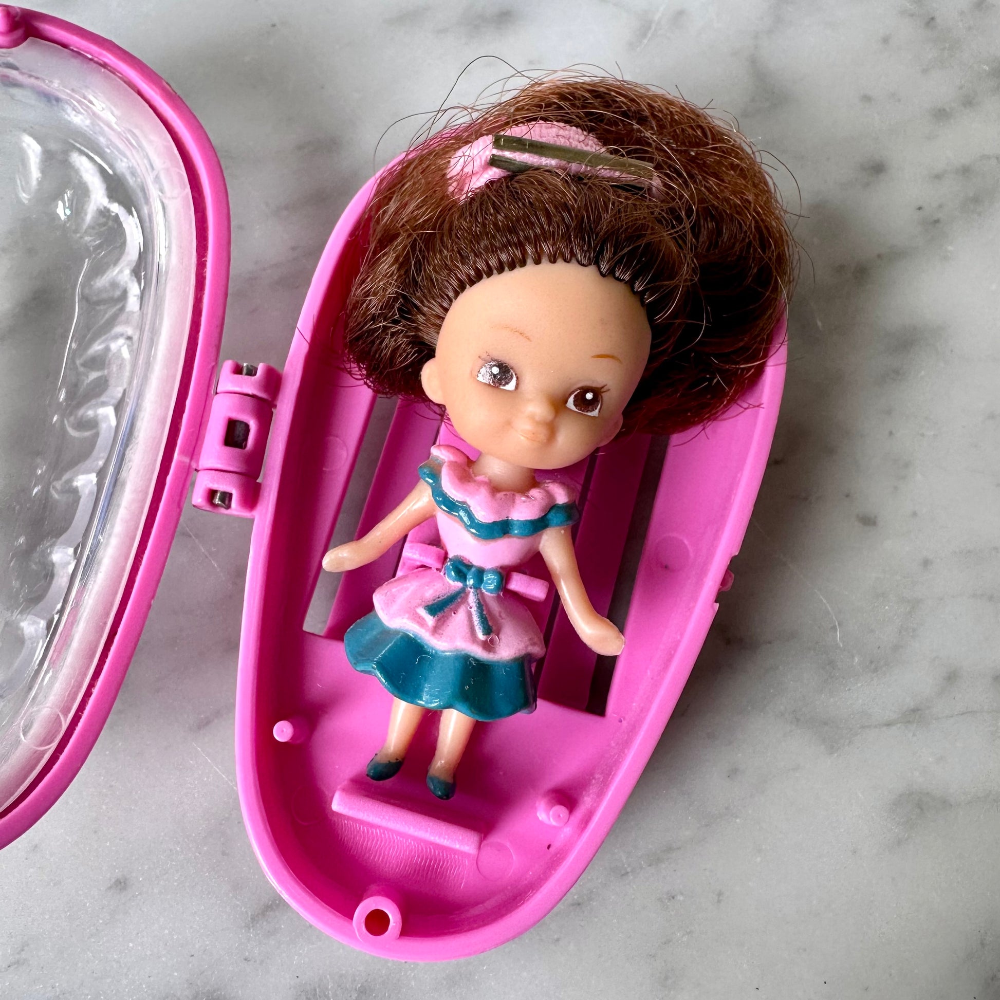 Vintage 1989 Liddle Kiddles Dupe. His doll is marked “1989 m.i.i. China.” The doll case looks to have dried glue on the left side of the clear window.