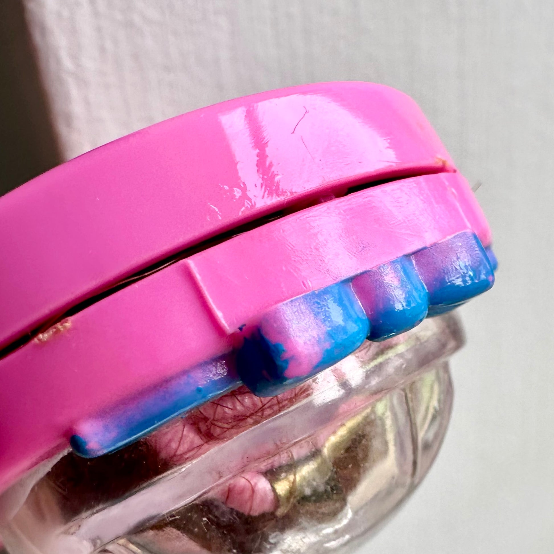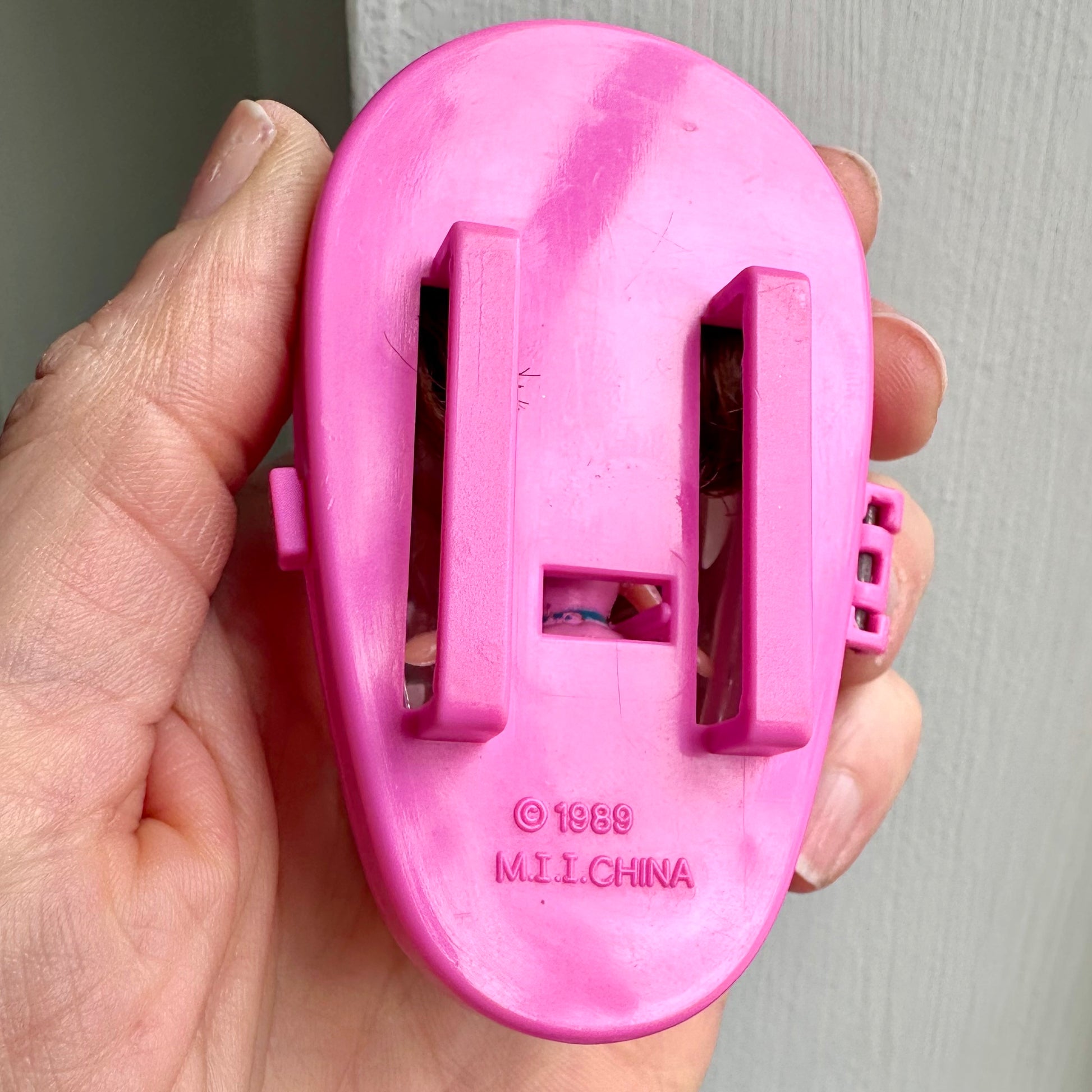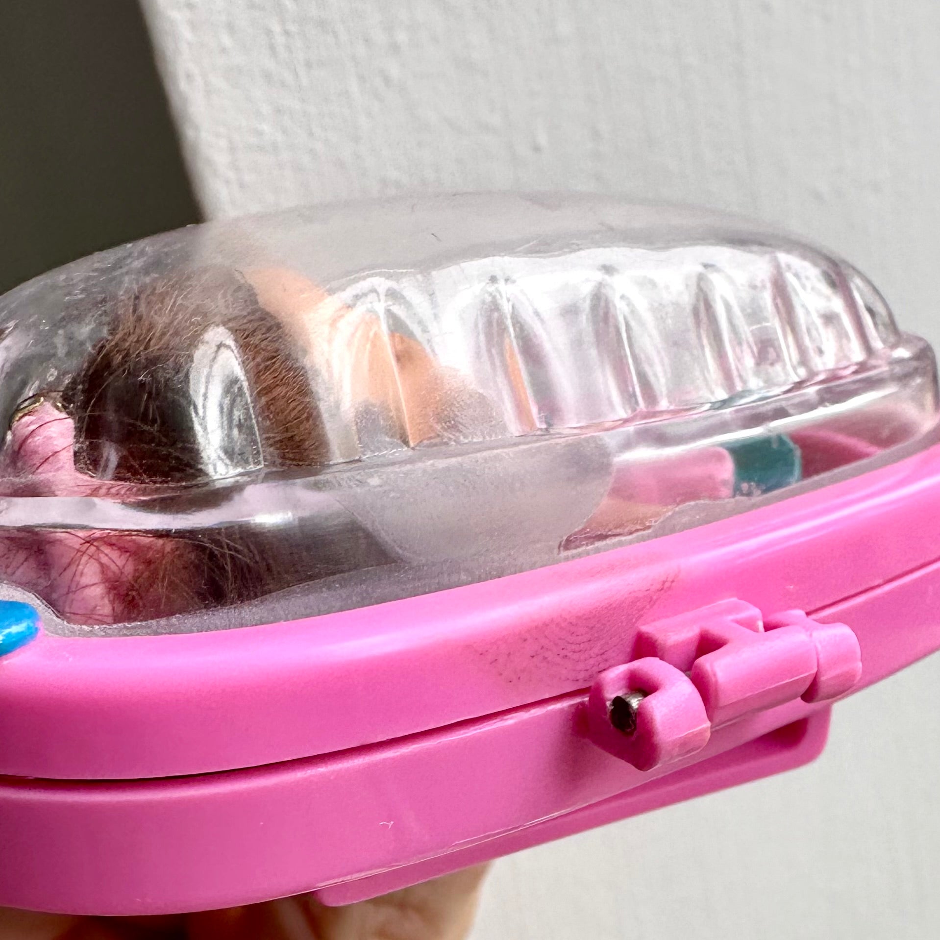 Vintage 1989 Liddle Kiddles Dupe. His doll is marked “1989 m.i.i. China.” The doll case looks to have dried glue on the left side of the clear window.