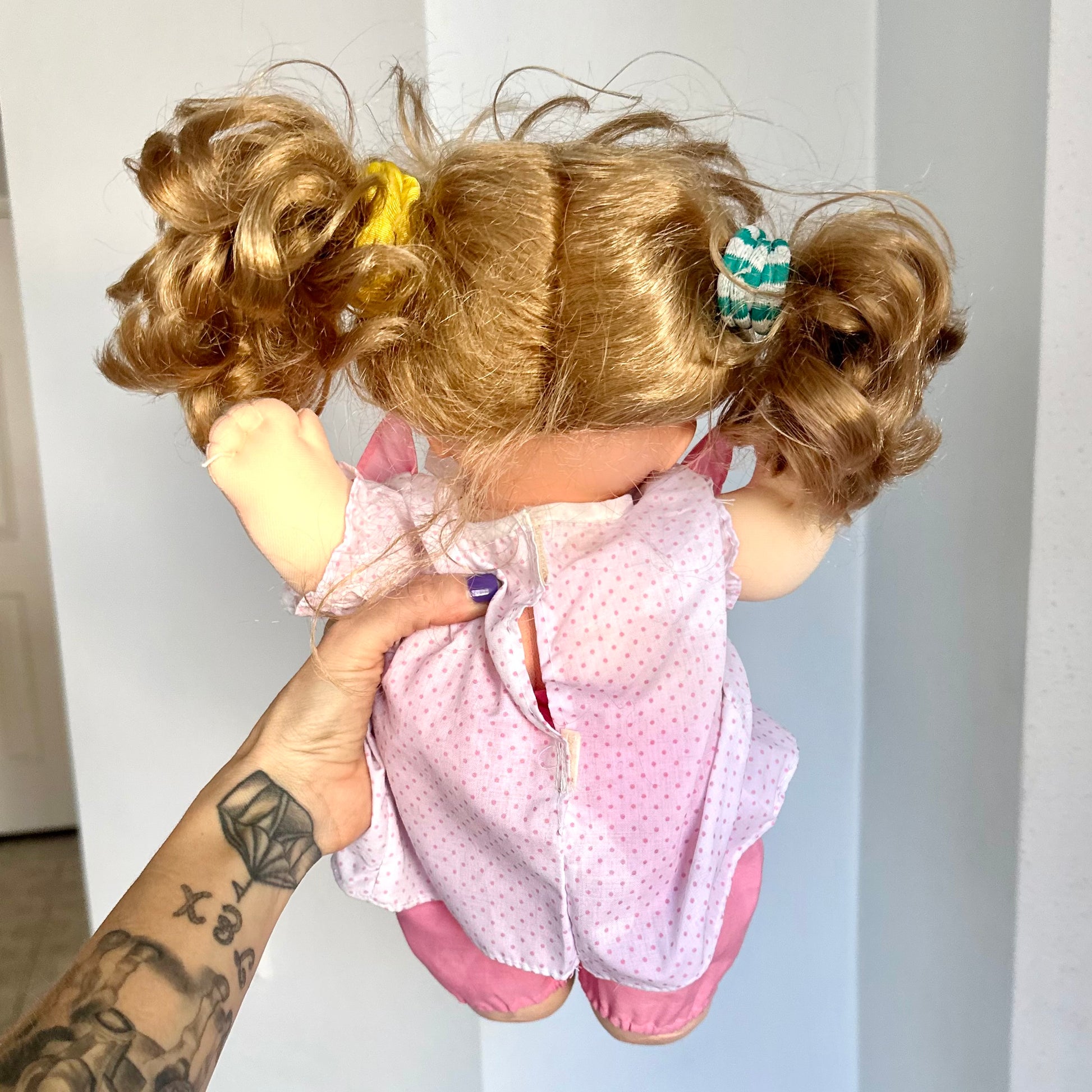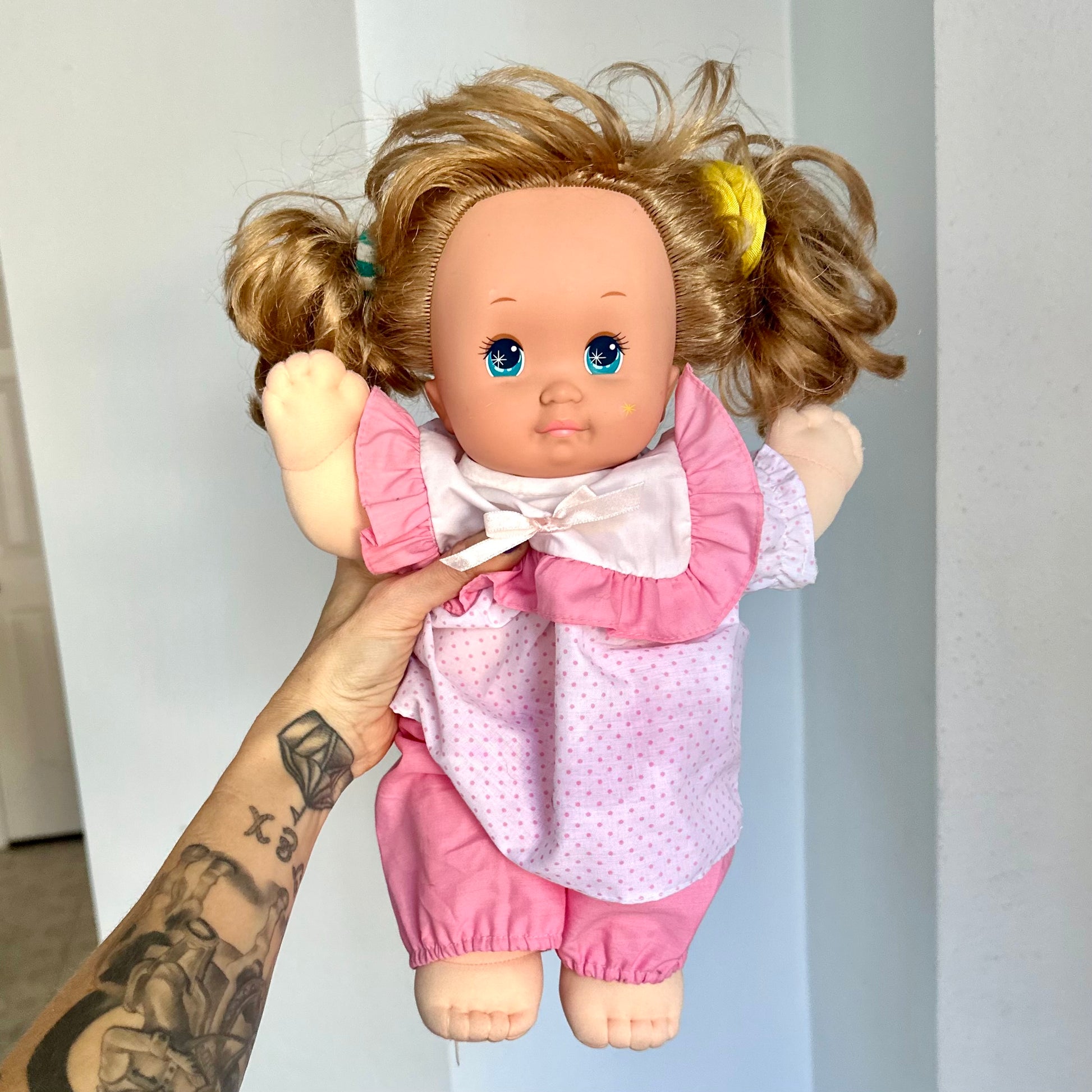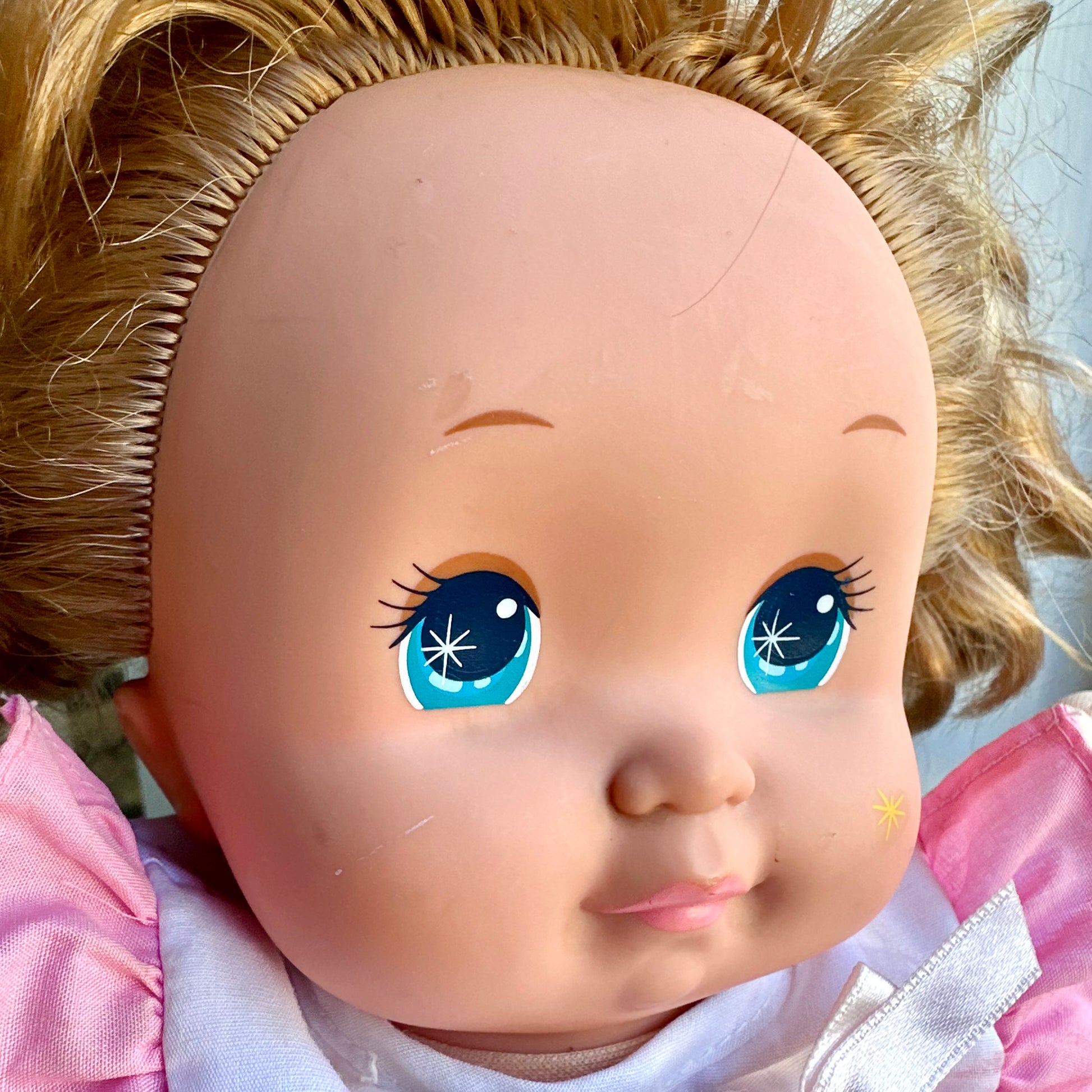 Vintage 1989 Mattel Magic Nursery Baby Doll. This doll has some light scuffs on her face and could use a hair brush but other than that she is in lovely condition. She comes from a smoke free home. Please see photos as part of the description.