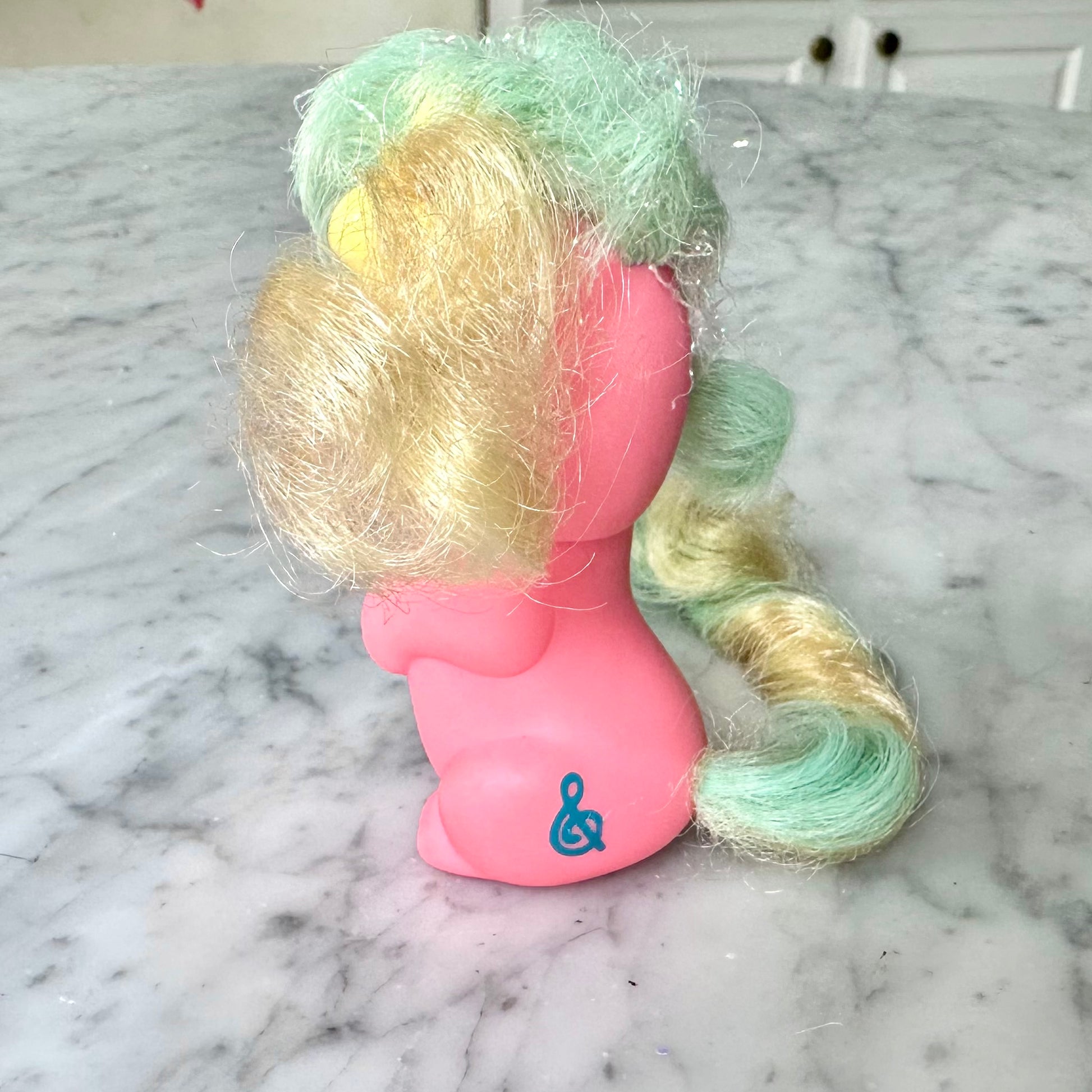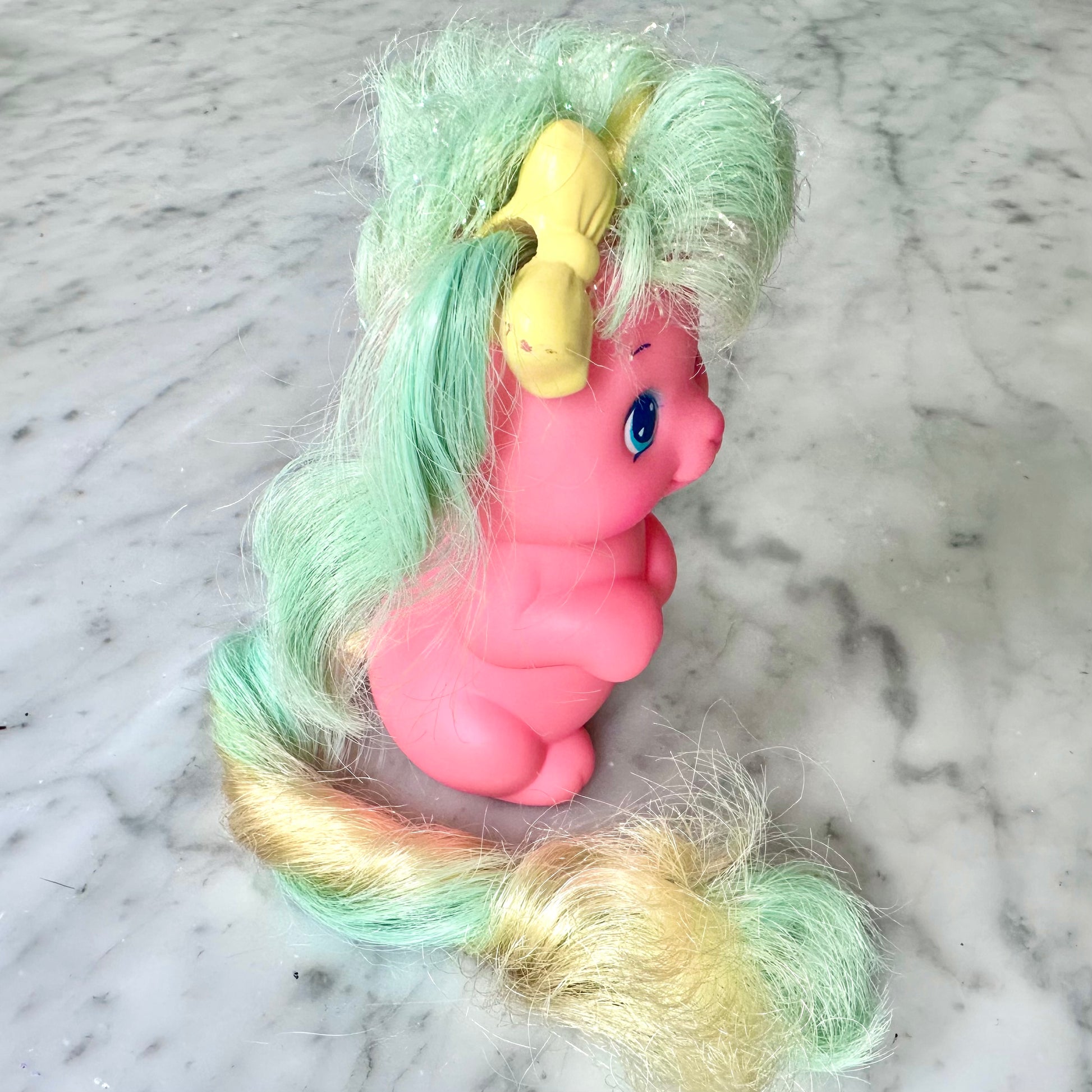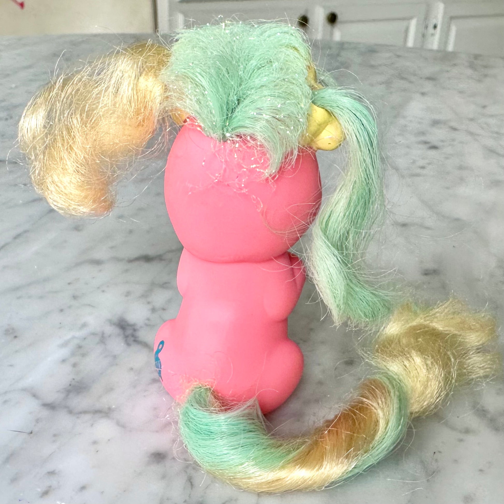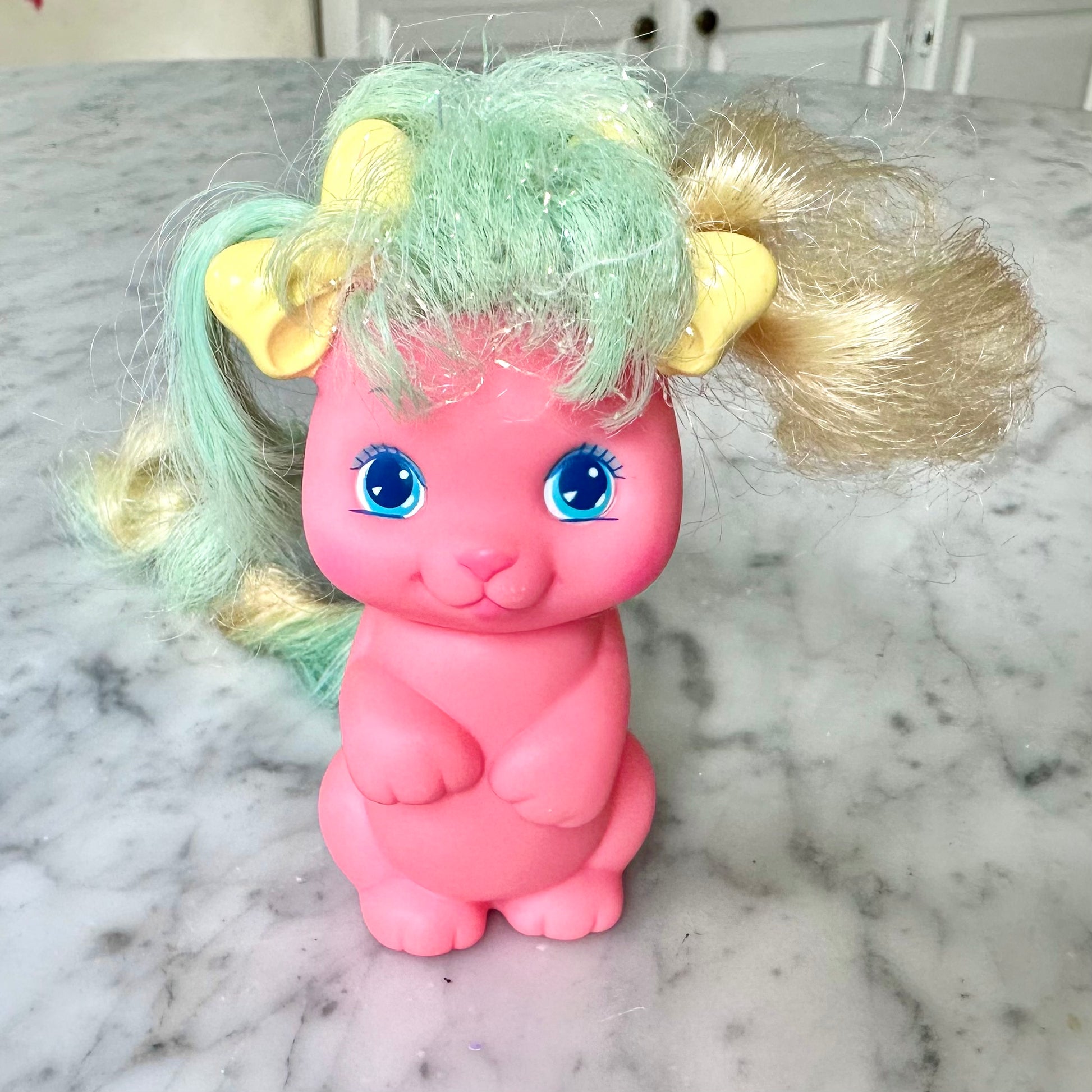 Vintage 1989 Mattel My Little Pretty Glitter N Grow Puppy “Melody.” The previous owner wrote their initial on the bottom of her. There are a few scuffs on the paint on the bows. Please see photos for details.