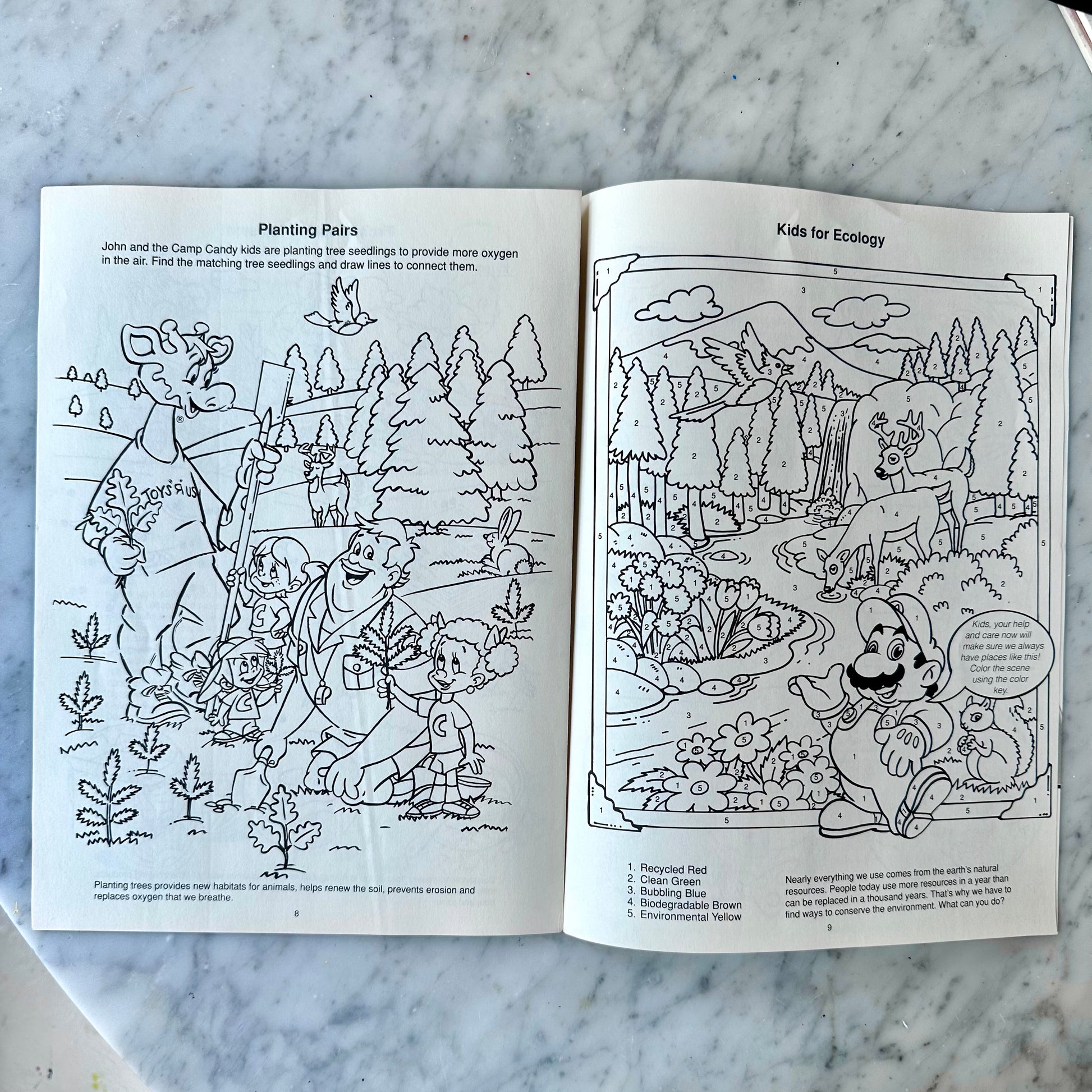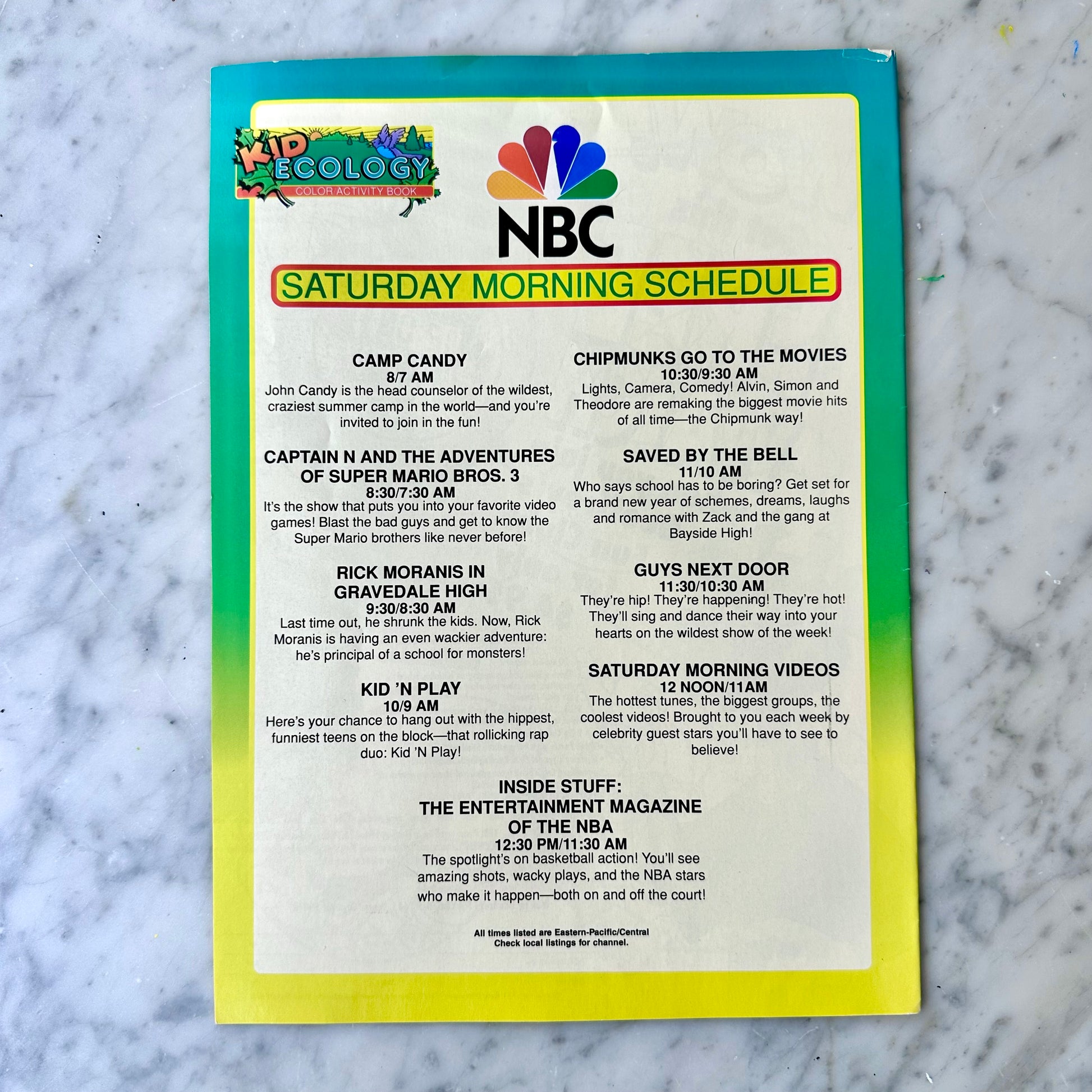 Vintage 1990 Kid Ecology Color/Activity Book-Geoffrey’s Secret Word Game. This is new with some light wear but all in all in good condition! All pages are new and haven’t been colored in. On the back is the 1990 NBC Saturday Morning Cartoon Line Up!