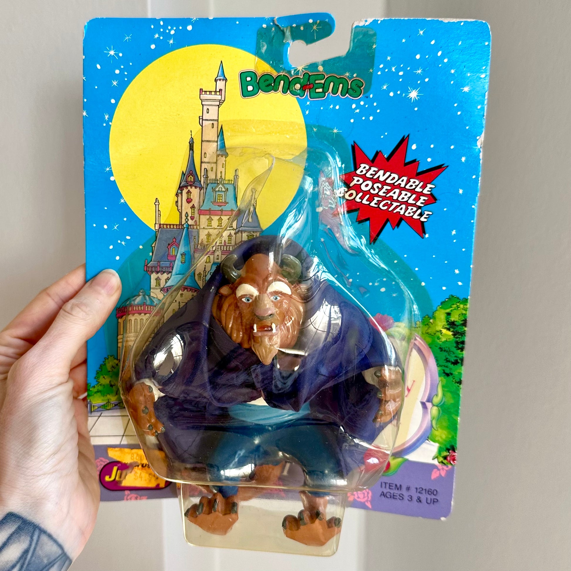 Vintage 1992 Justoys Bendems Disney's Beauty And The Beast "Beast" Figure- new in package. The plastic on the package has changed color from time and has a dent. The toy itself is in perfect condition.