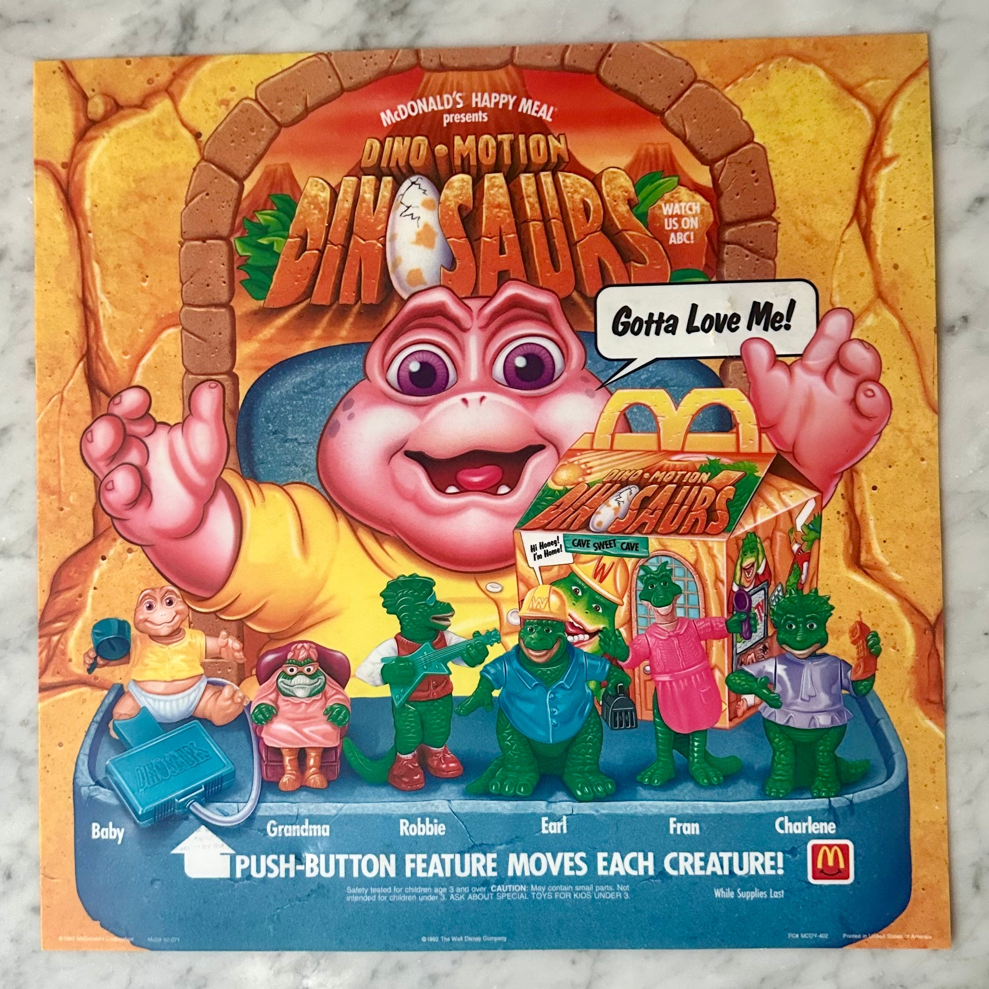 Vintage 1992 McDonald’s Dinosaurs Happy Meal Translite Advertising Sign. There are a few small flaws that I have shown in photos. This is a seriously cool collectors piece! 22" x 22”