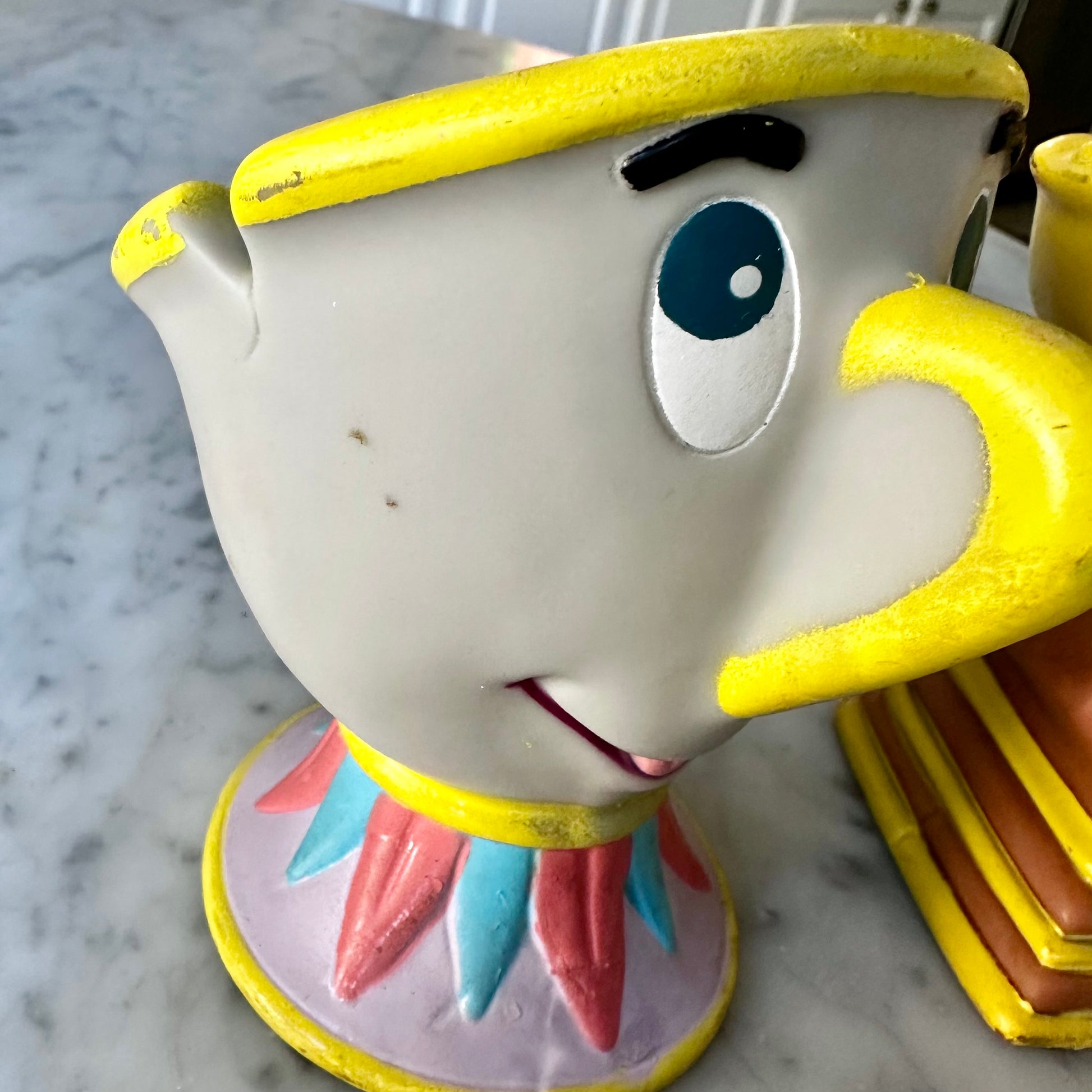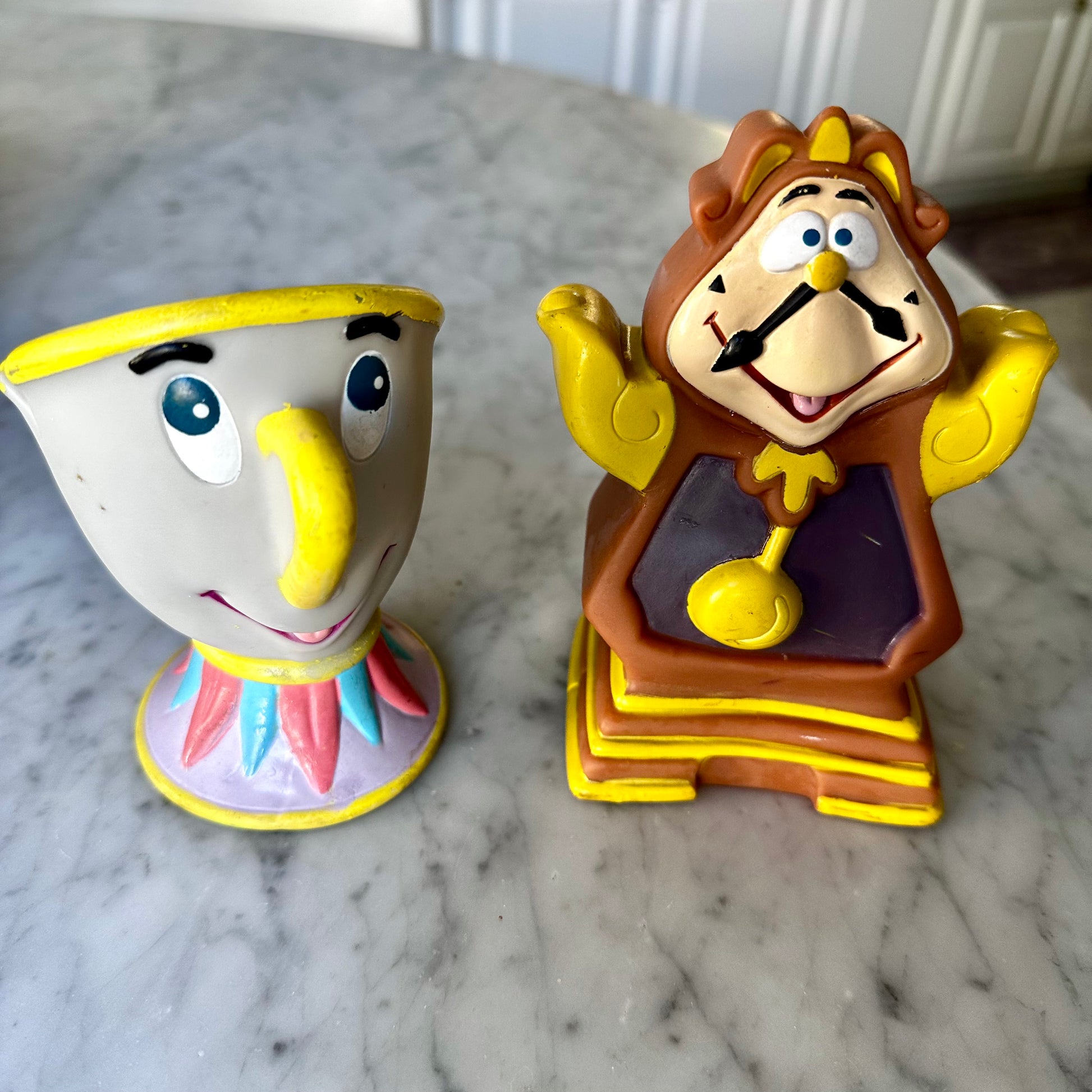 Vintage 1992 Pizza Hut Beauty and the Beast Cogsworth and Chip Puppets. Chip has a stain inside the cup and they both have some scuffs. Please see photos for details.
