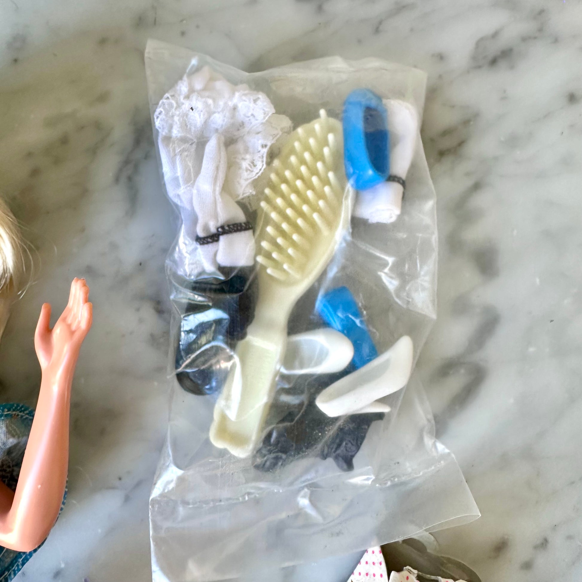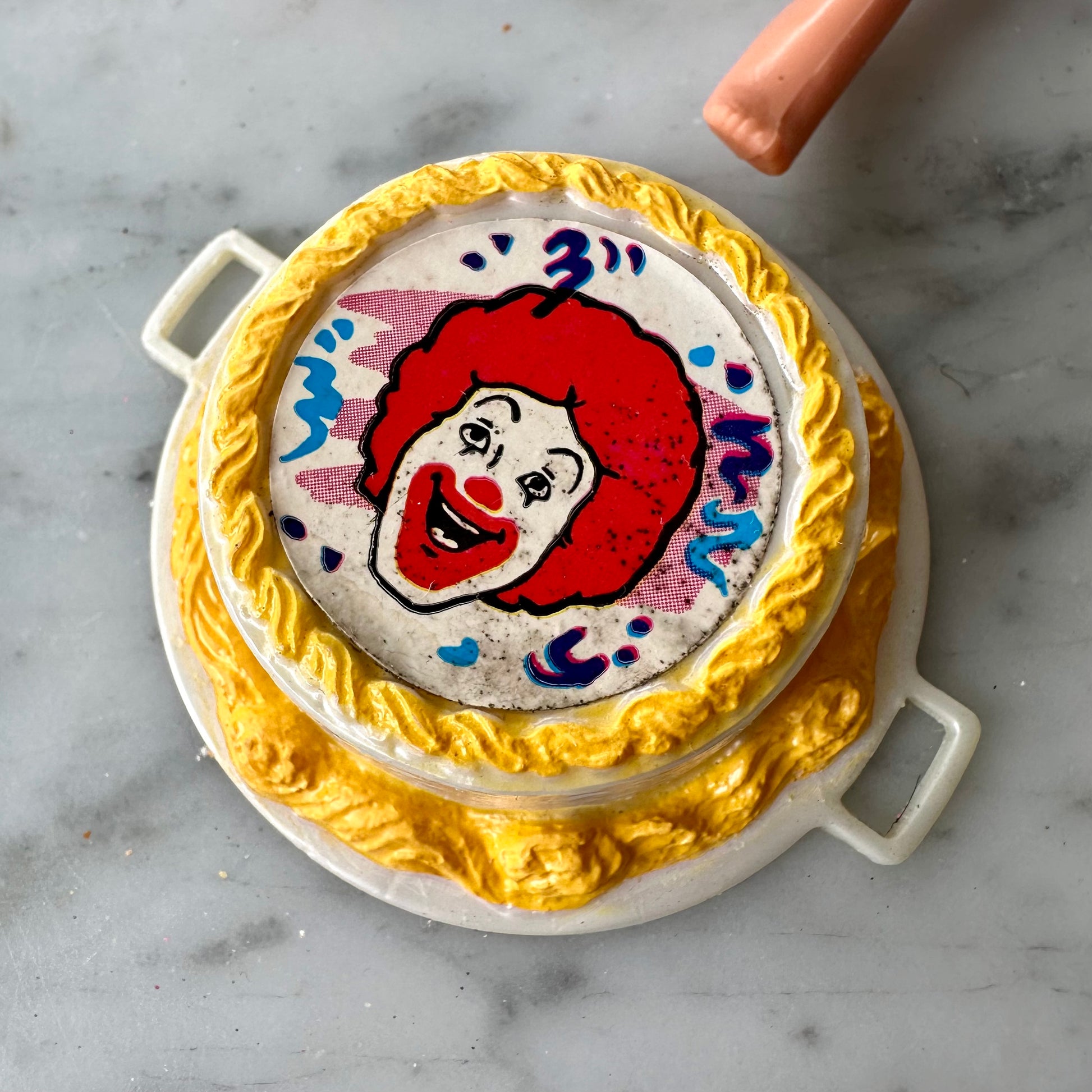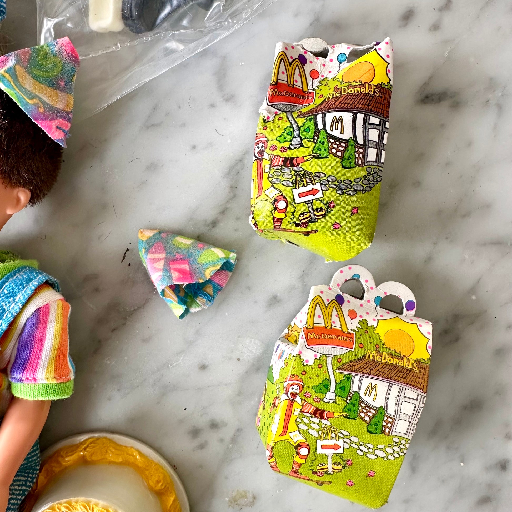 Vintage 1993 Barbie Birthday Fun At McDonald’s. This comes with three of its original dolls: Barbie, Todd, and Stacie. It also comes with a McDonald’s cake (it does have stains on the sticker,) two Happy Meals (see photos for condition,) two party hats, sealed socks and shoes for all three dolls, and a party bag that hasn’t been punched tout. The dolls have some stains on their legs. Please see all photos for details.