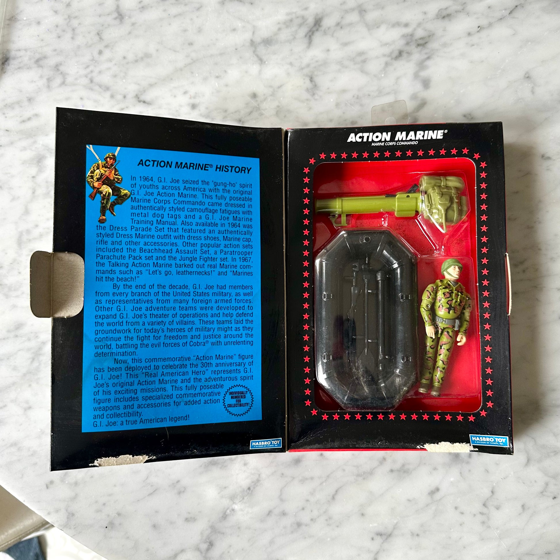 Vintage 1993 GI Joe Commemorative Collection Action Marine in original box. The box shows signs of water damage but the toy itself is in like-new condition.