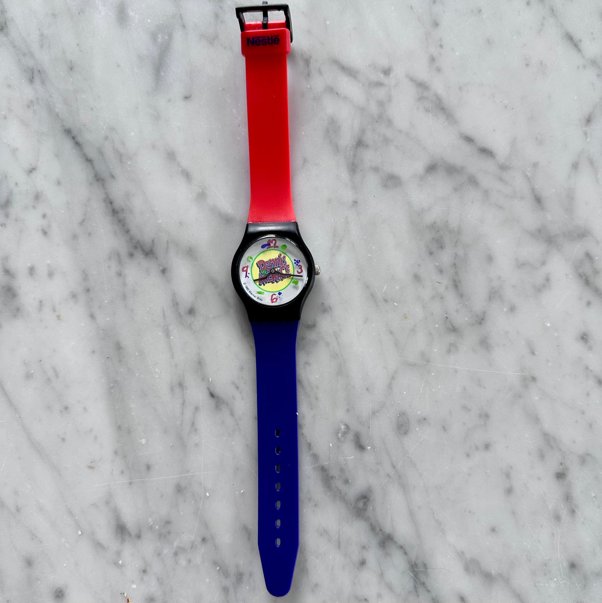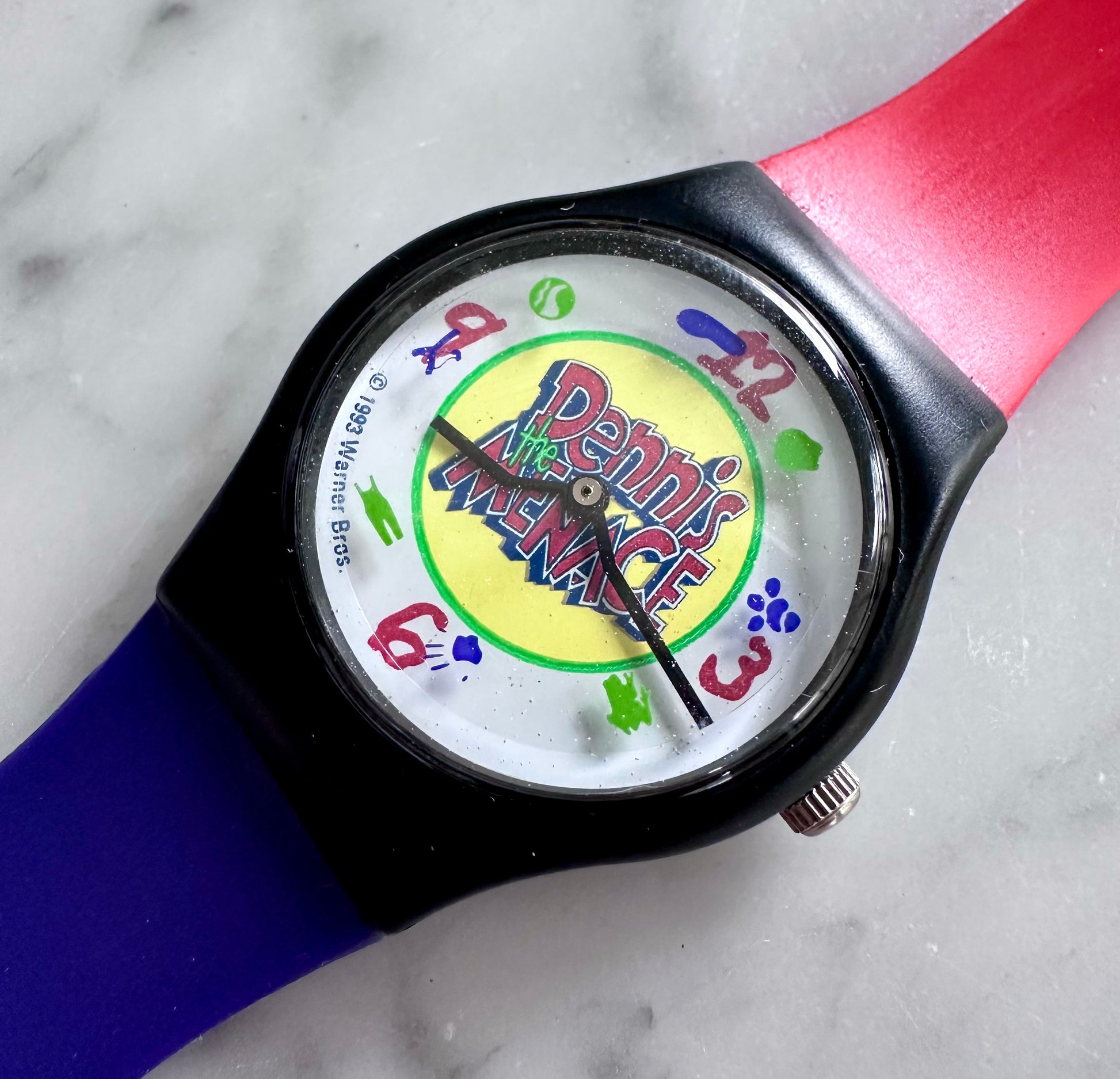 Vintage 1993 Warner Brothers Nestle Dennis The Menace wrist watch. This watch was a promo that you would mail off for as a Proko in 1993 when the Dennis the Menace movie came out. This watch needs a new battery.