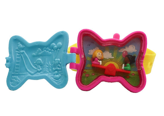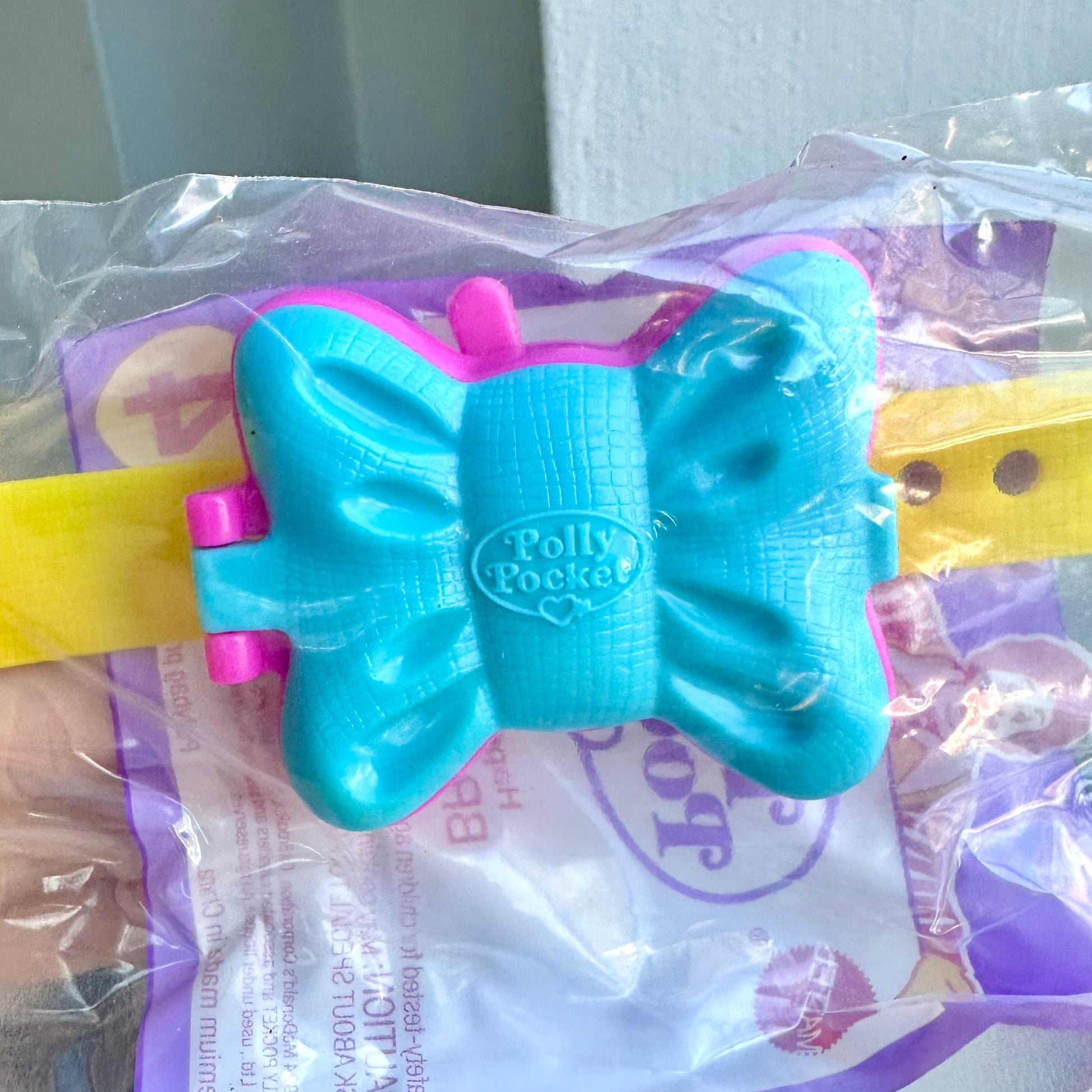 Vintage 1994 McDonald’s Polly Pocket bracelet, new in package. When you open the blue top of the bow it reveals two dolls that seesaw up and down.