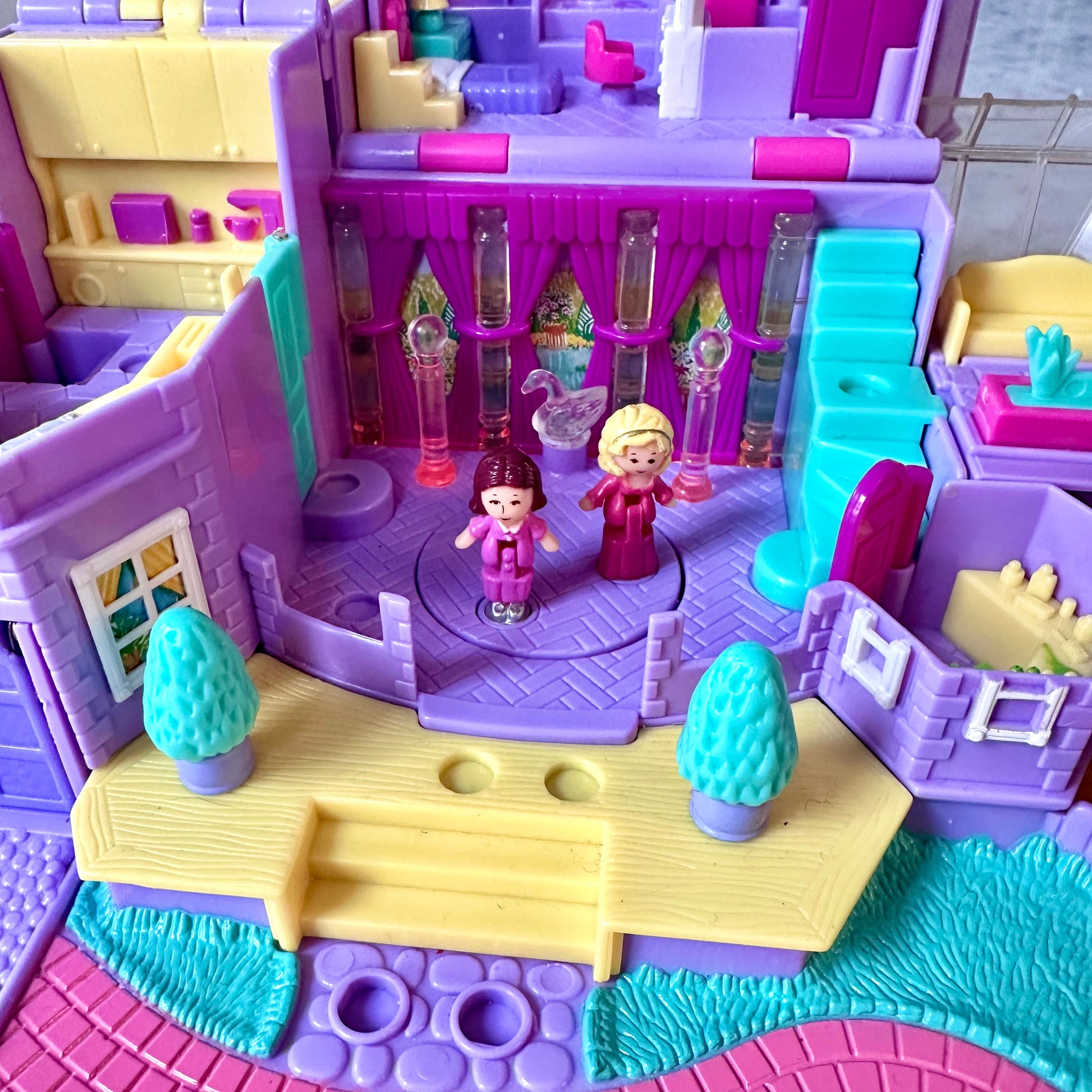 Vintage 1994 Polly Pocket Light Up Magical Mansion. This playset has working lights but they are a little finicky. This comes with all of its original pieces: 2 Polly, 1 Laura, and 1 Rachel dolls, 1 horse, 1 car, 1 carriage, and 5 flags. The garage door opens when you push the bush next to it and the dance floor spins when the other bush is twisted. Please see all photos for details.