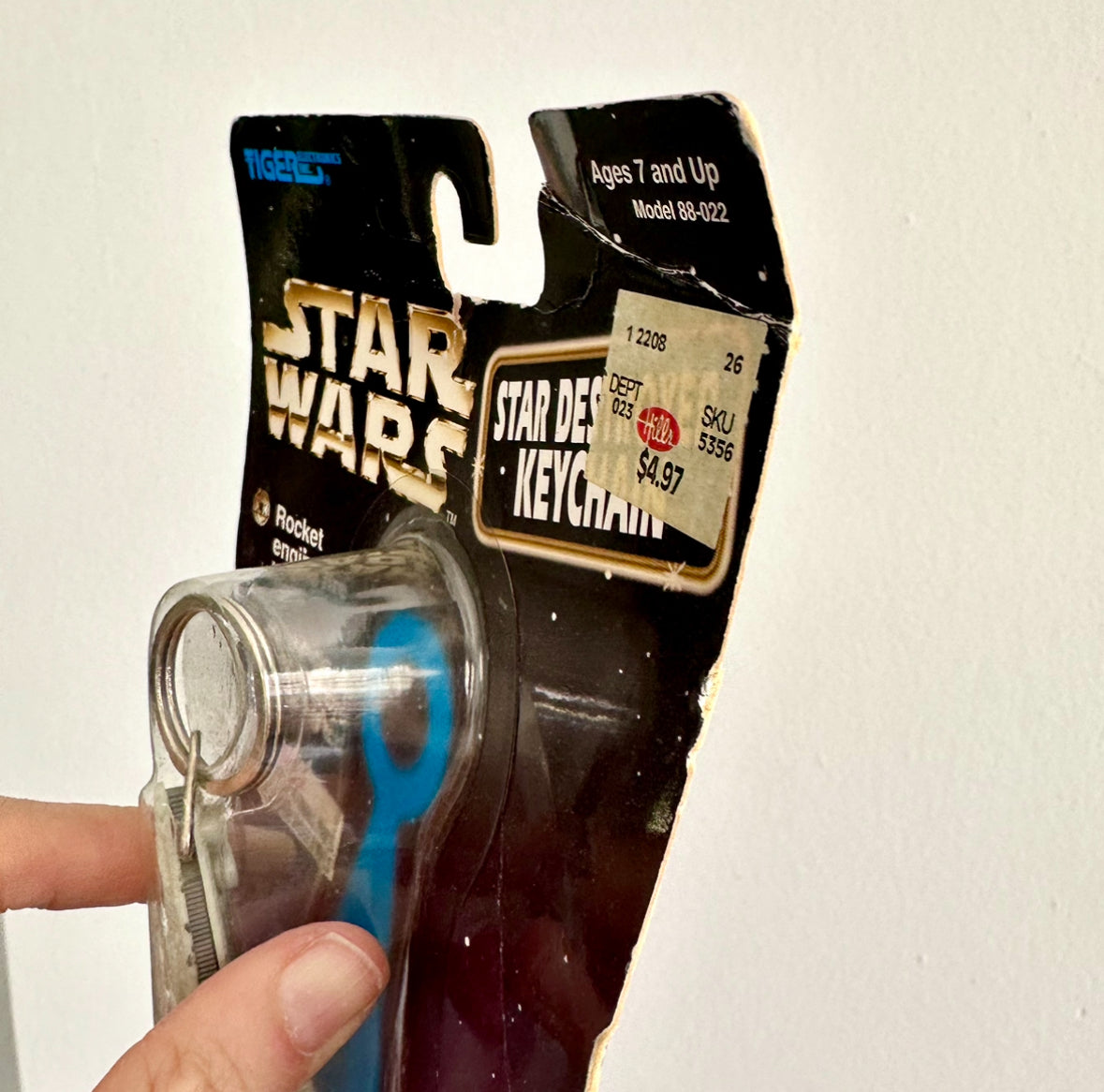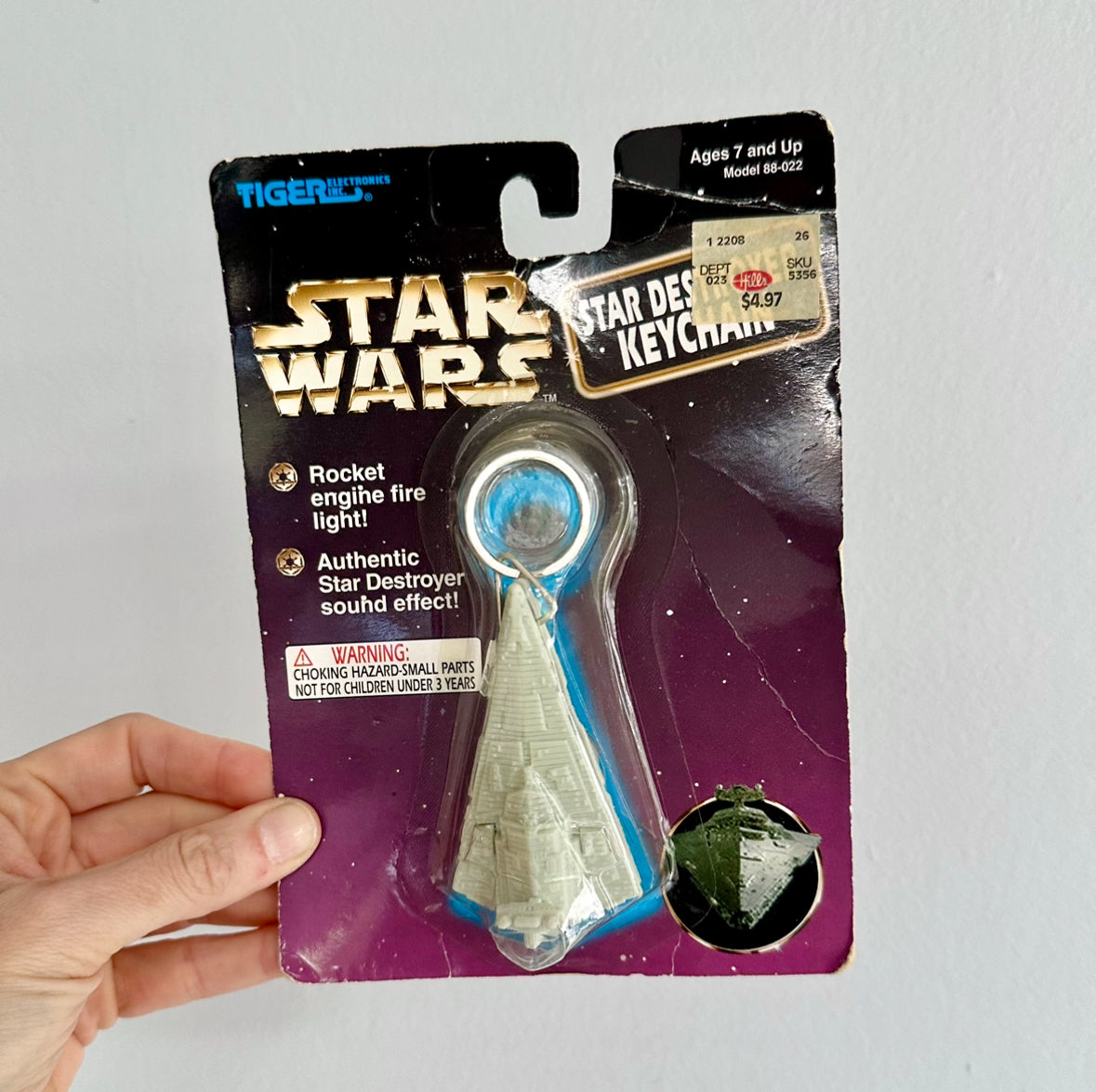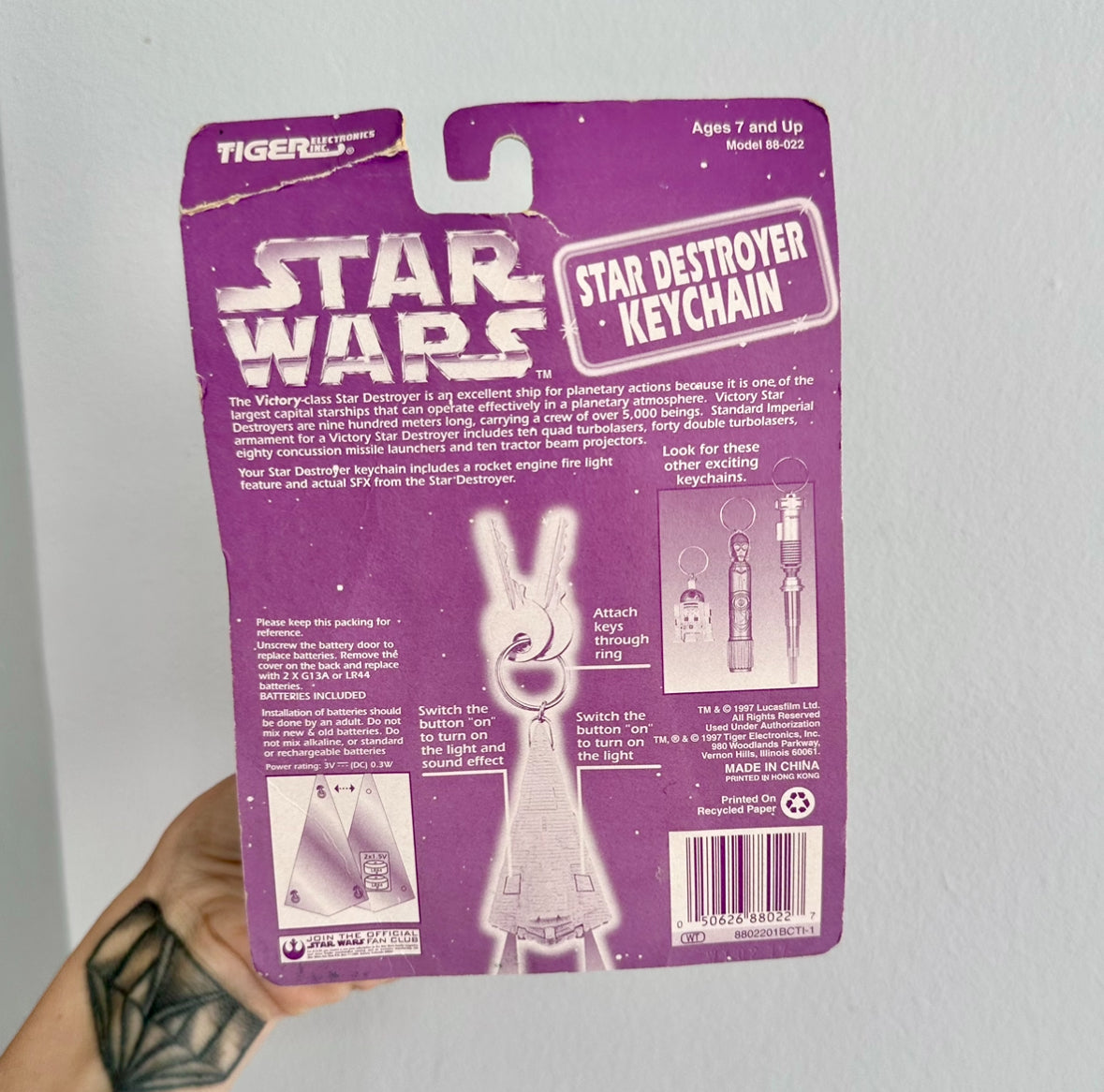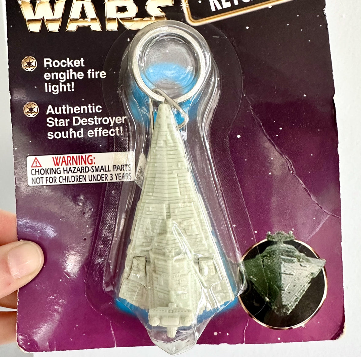 Vintage 1997 Tiger Star Wars Star Destroyer Keychain still in box. The box is a little beat up but the keychain is in new condition. Not sure if the light still works.