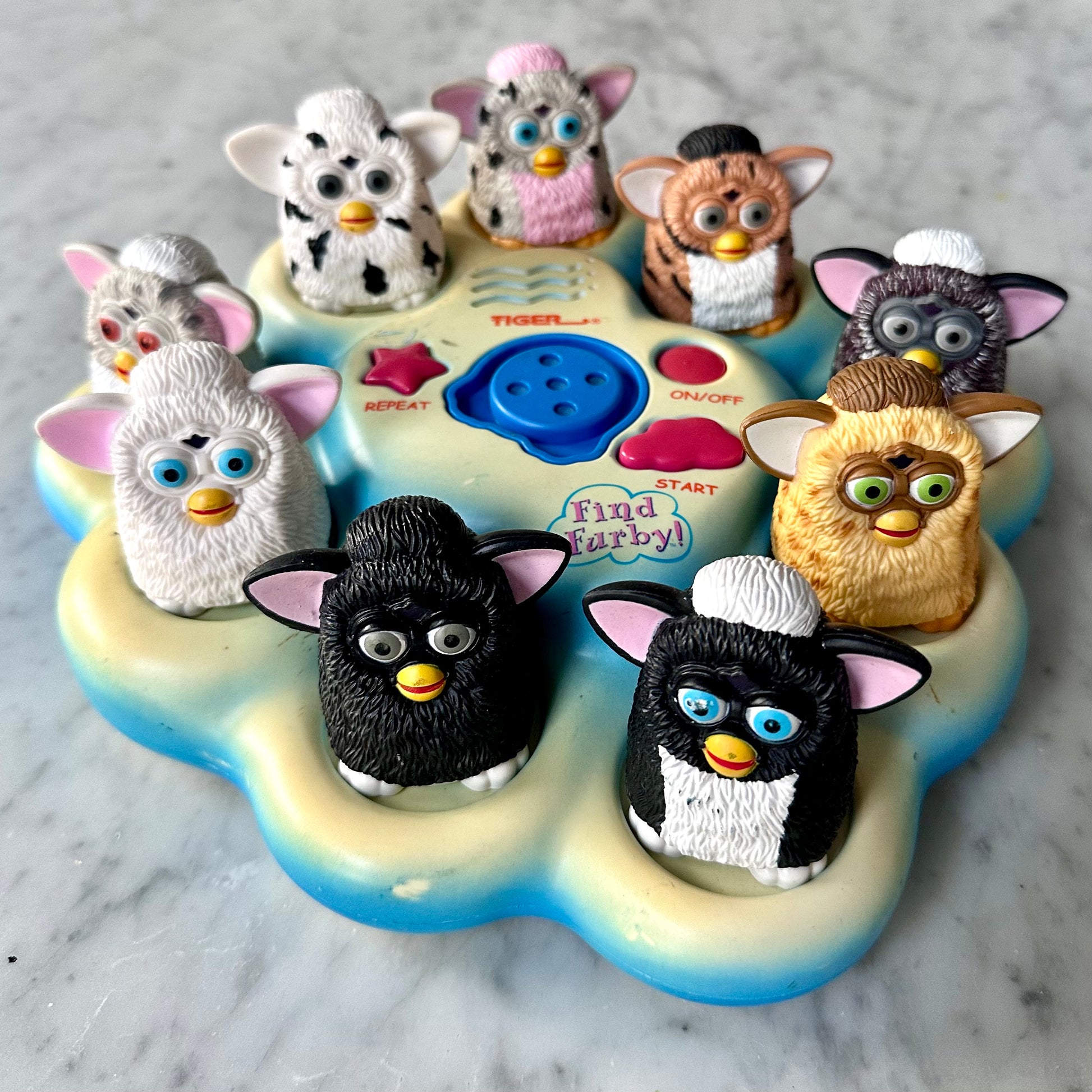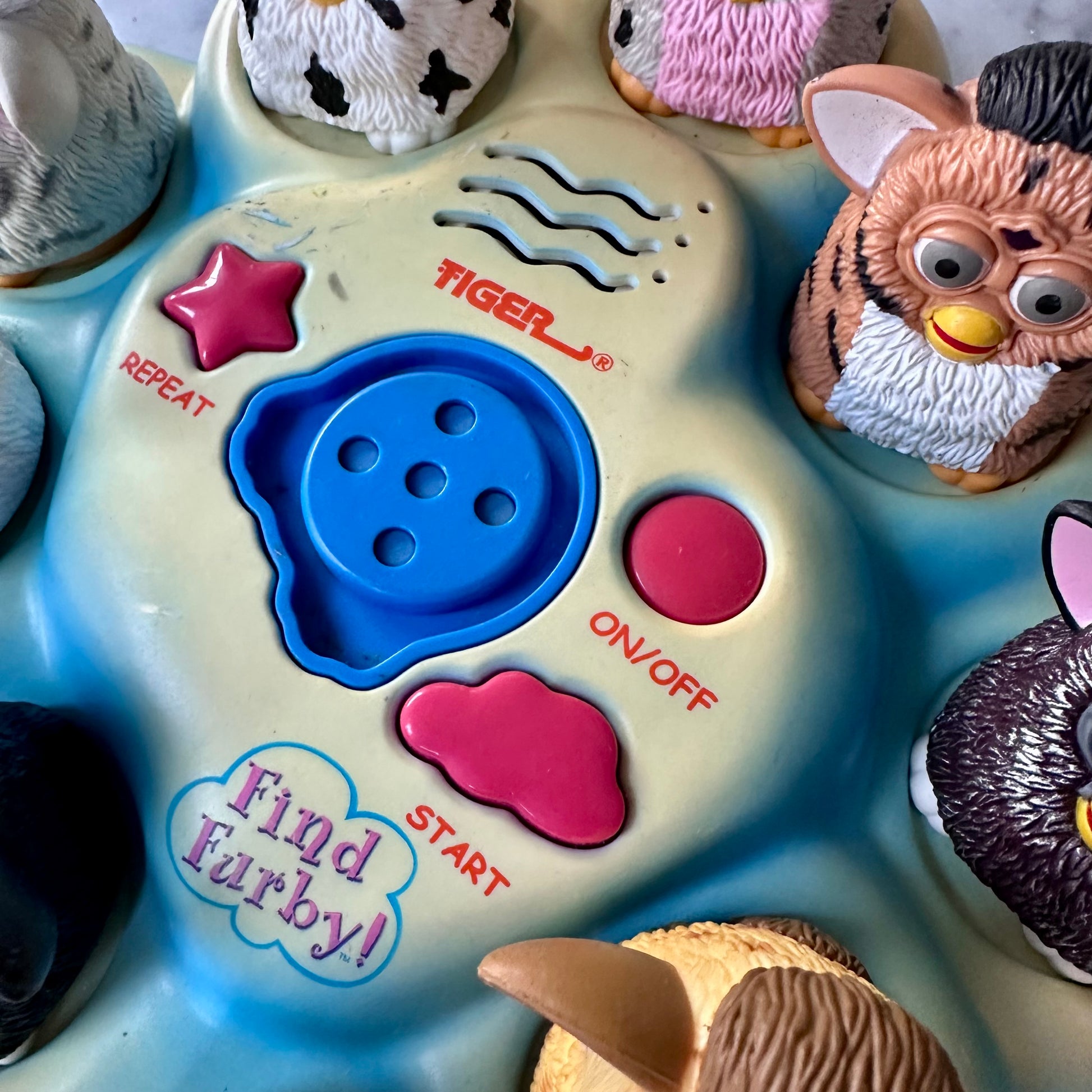 Vintage 1999 Tiger Electronics Find Furby! Game. This game is in working condition. There are some scuffs on the Furby pieces as well as the platform. Please see photos for details. Batteries not included.