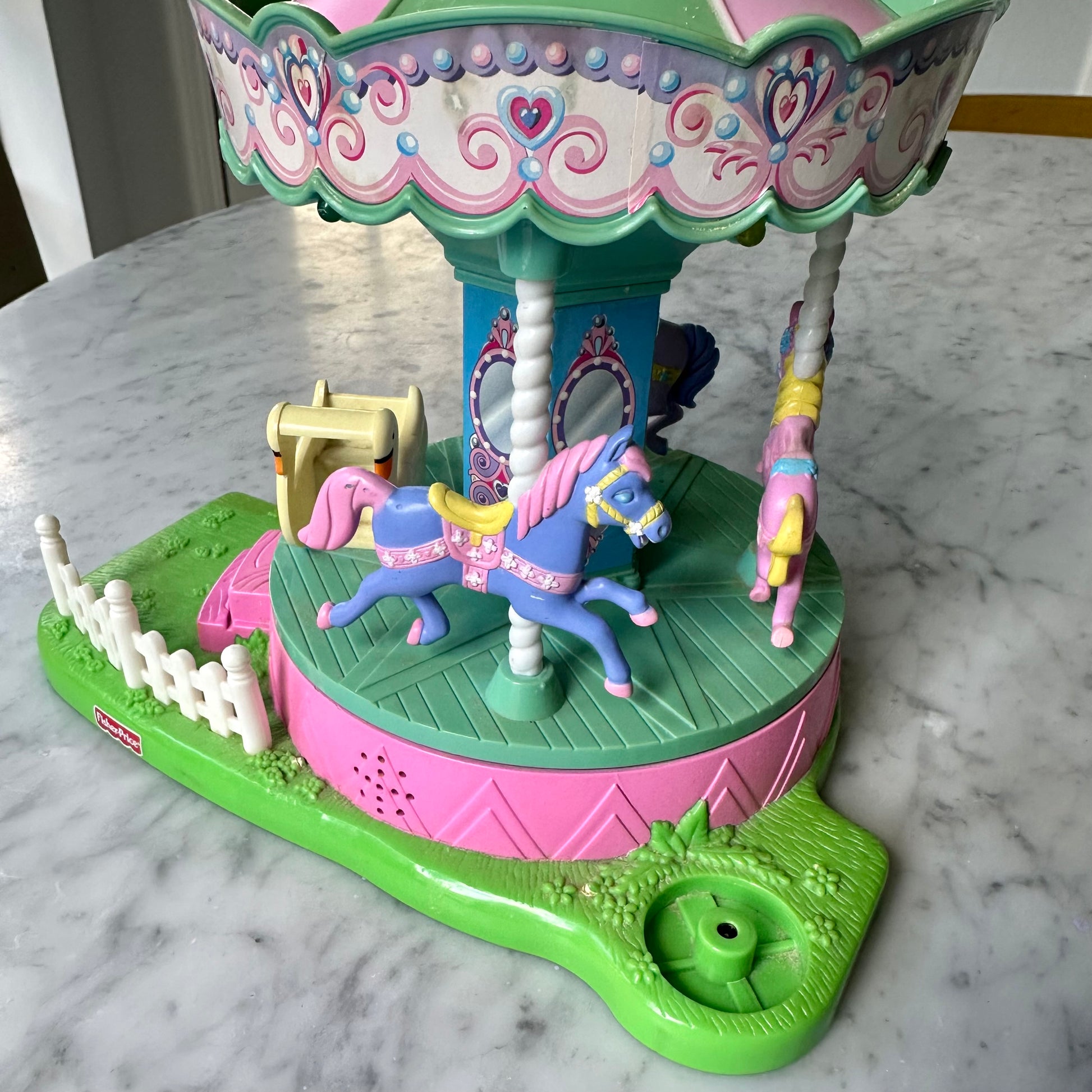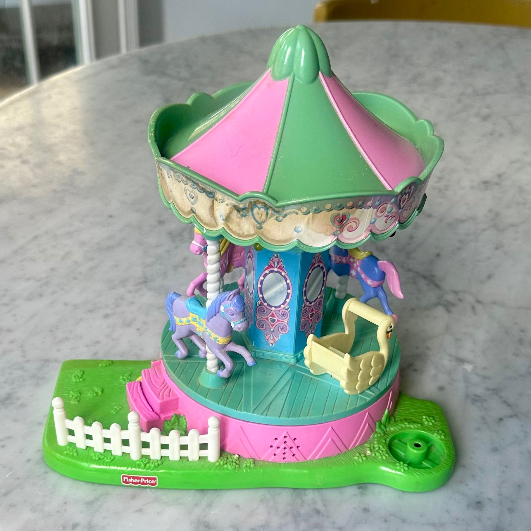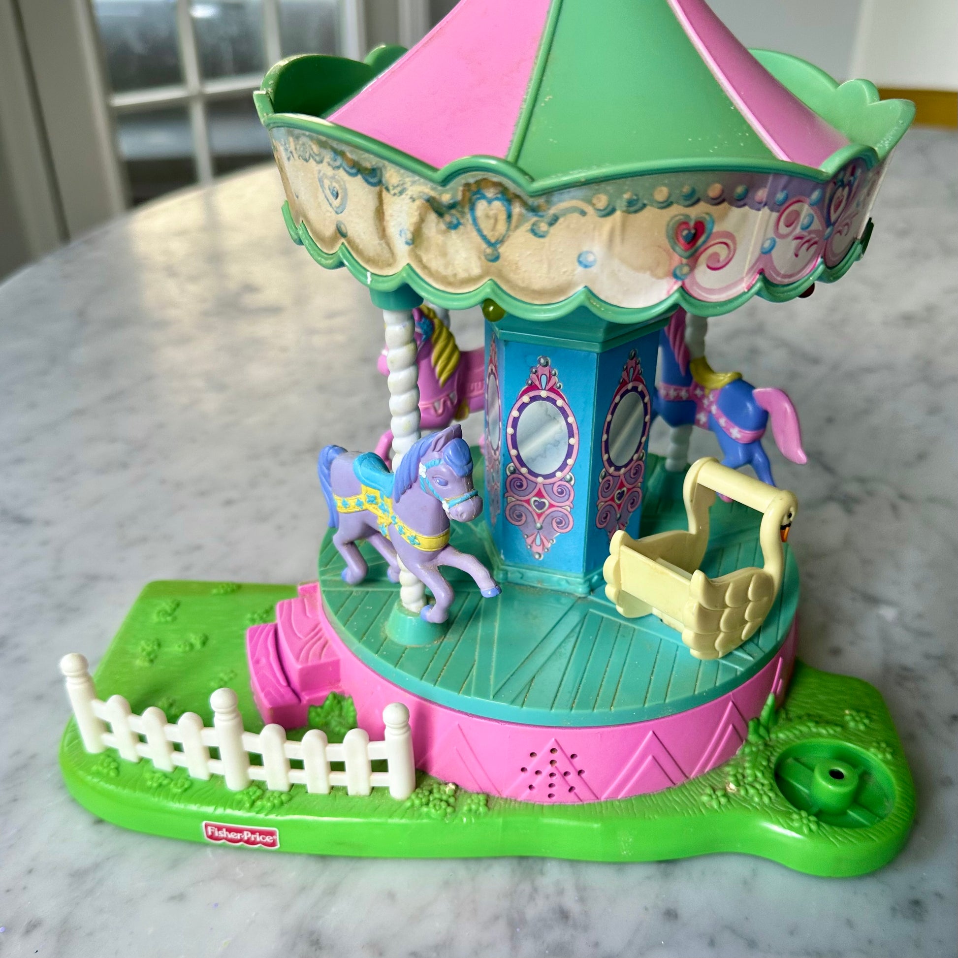 Vintage 2005 Fisher Price Merry Go Round Loving Family Sweet Streets Carousel. This is so cute and would make a great addition to any kawaii lovers room. This has working lights and music, please see video. This has water damage to the sticker along the top of the carousel, there is also sun fading to the plastic, and it is missing its ticket booth. Please see all photos for details.