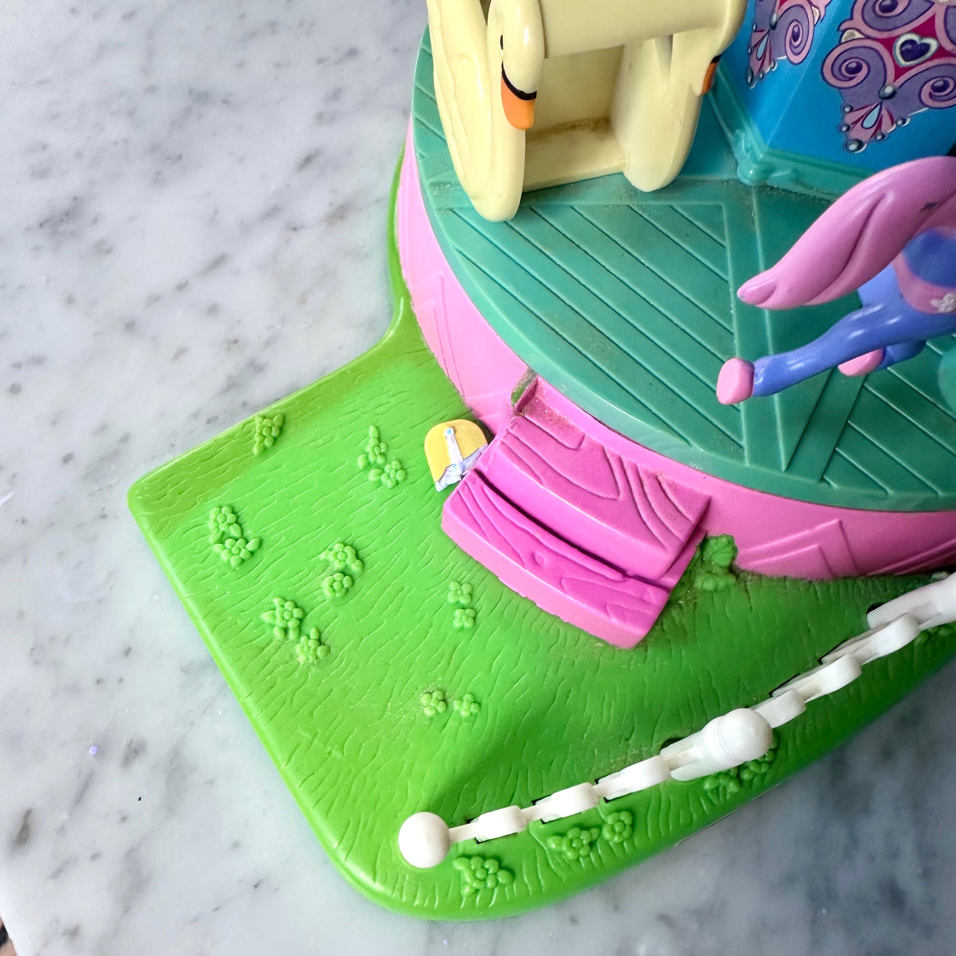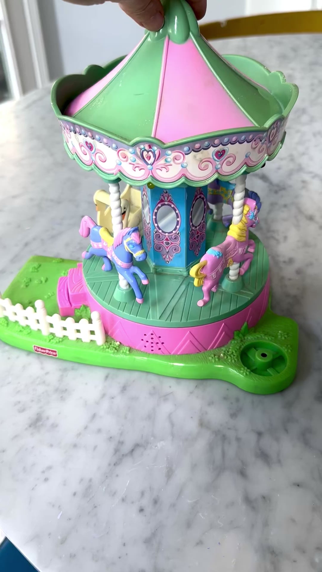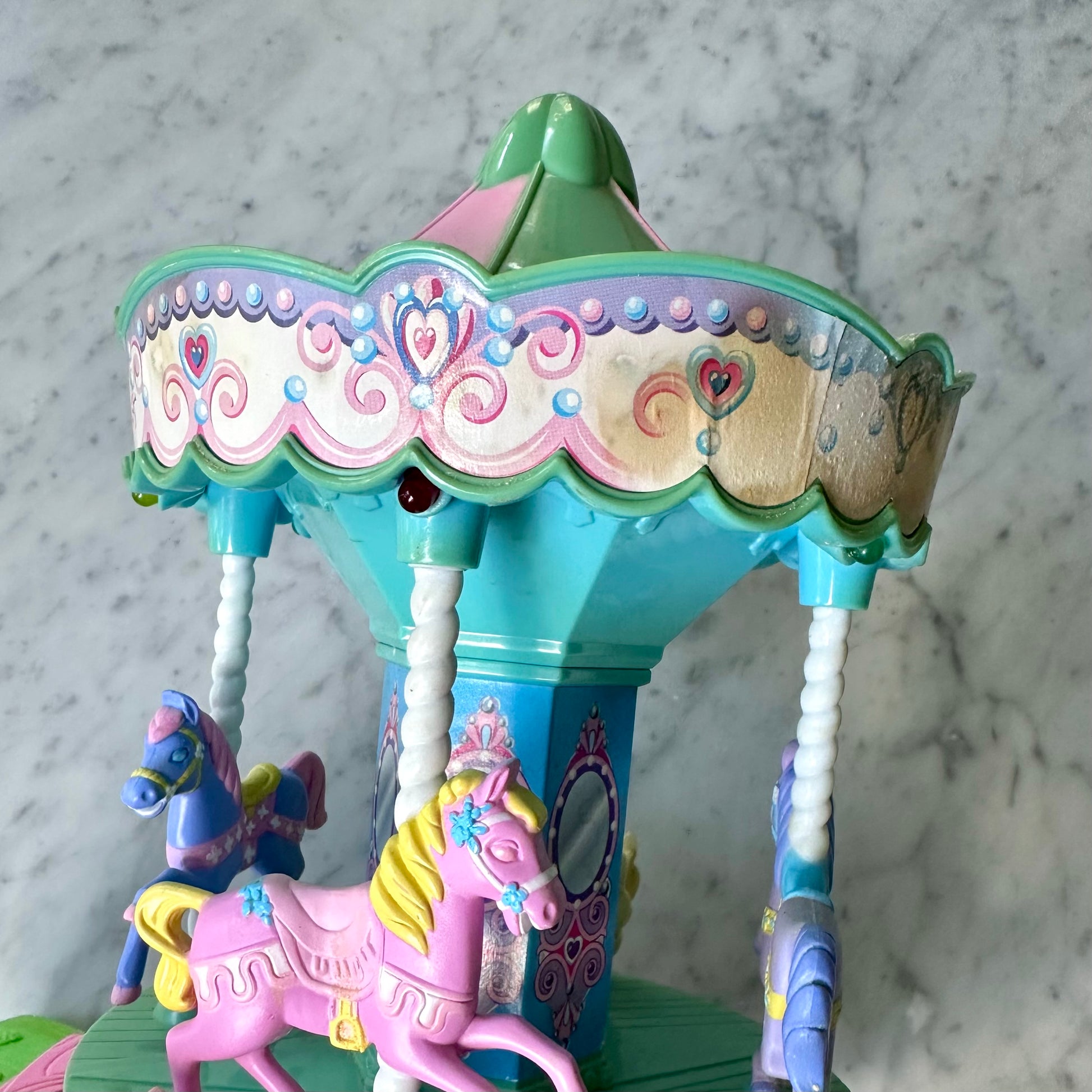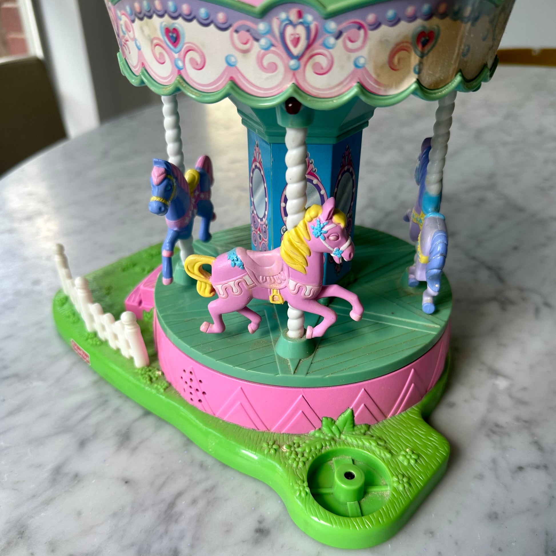 Vintage 2005 Fisher Price Merry Go Round Loving Family Sweet Streets Carousel. This is so cute and would make a great addition to any kawaii lovers room. This has working lights and music, please see video. This has water damage to the sticker along the top of the carousel, there is also sun fading to the plastic, and it is missing its ticket booth. Please see all photos for details.