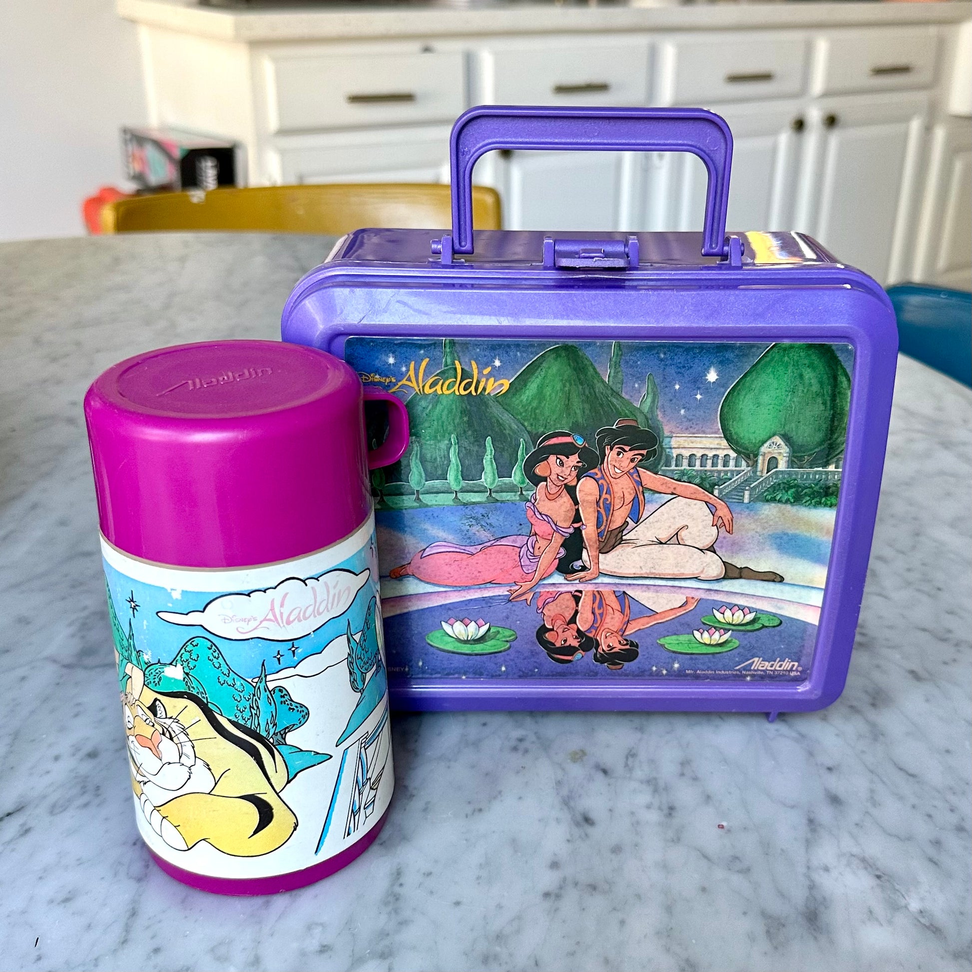 Vintage 90’s Disney Aladdin Lunchbox with Thermos. The thermos is faded and the lunchbox has some light dots on the sticker. Please see all photos as part of the description.
