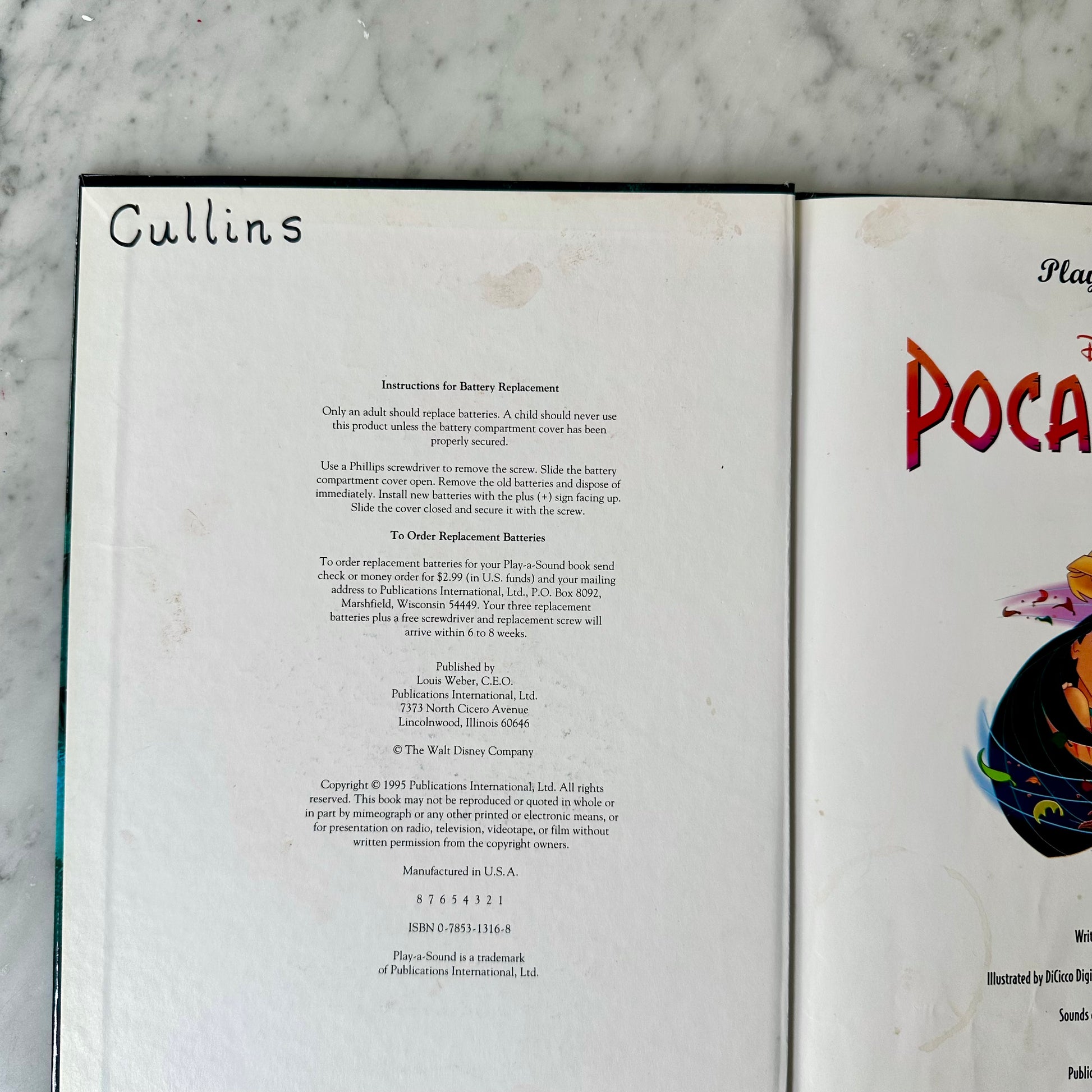 Vintage 90’s Disney’s Pocahontas Play-a-Sound Book. The sound no longer works, it may just need a new battery. There is a name written on the inside of the cover as well as light stains on the cover page.