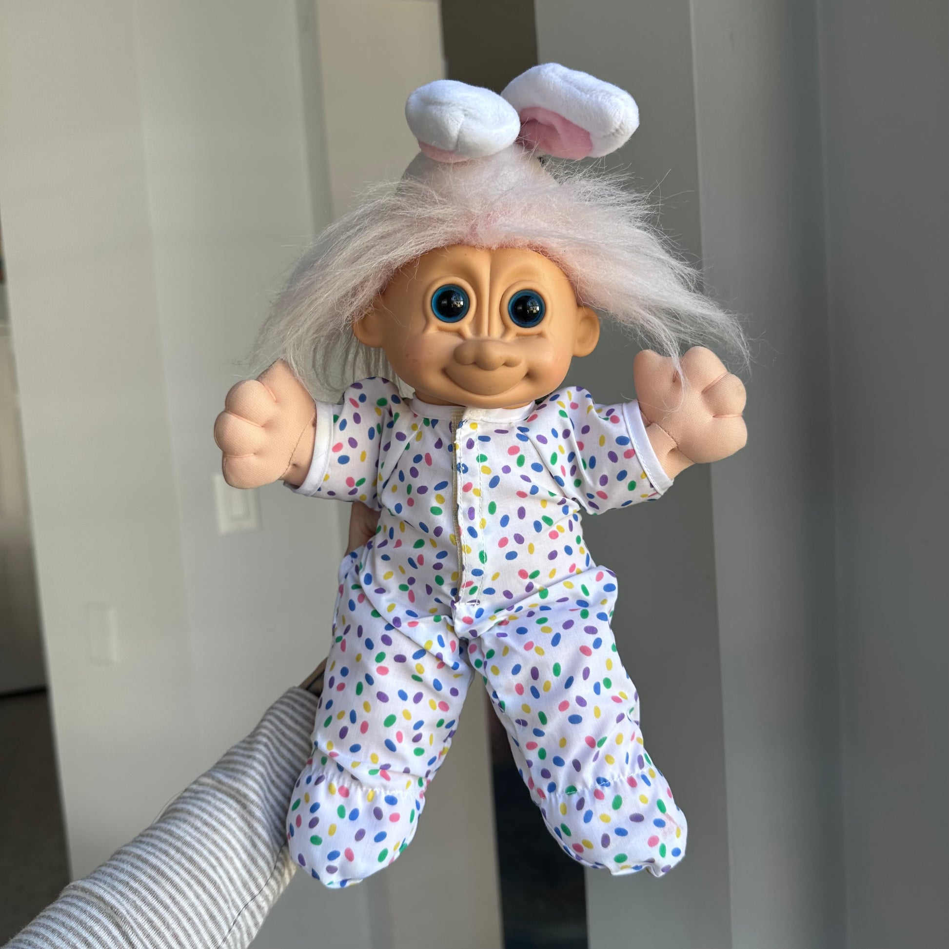 Vintage 90’s Russ Bunny Troll Plush. This guy comes in sweet polka dot pj’s with a little Velcro booty flap. This measures 12” and comes from a smoke free home.