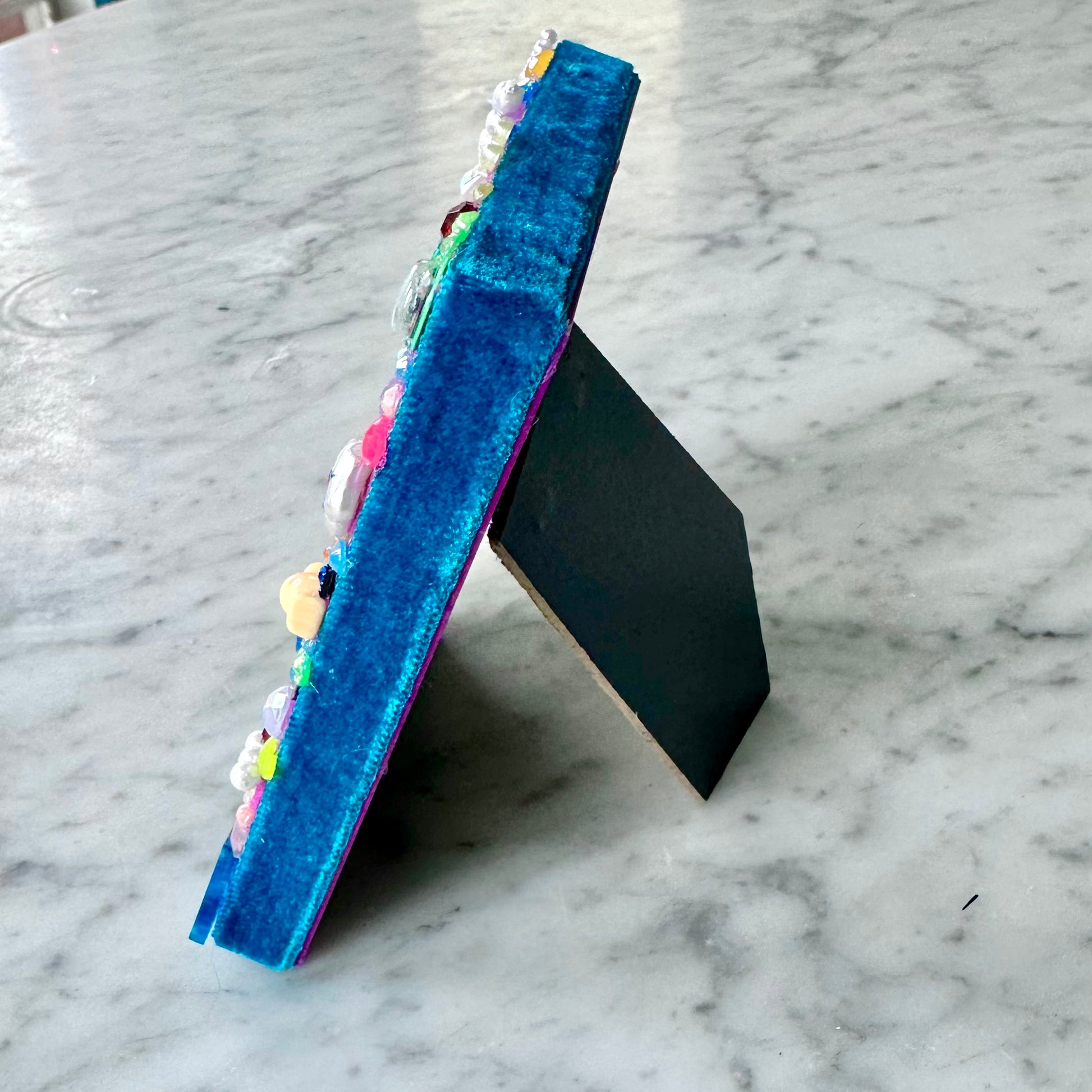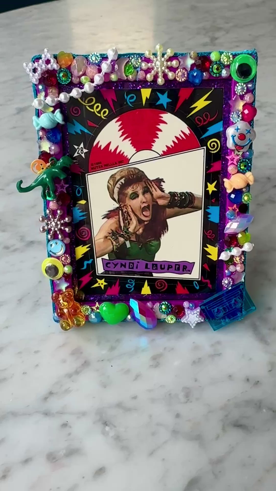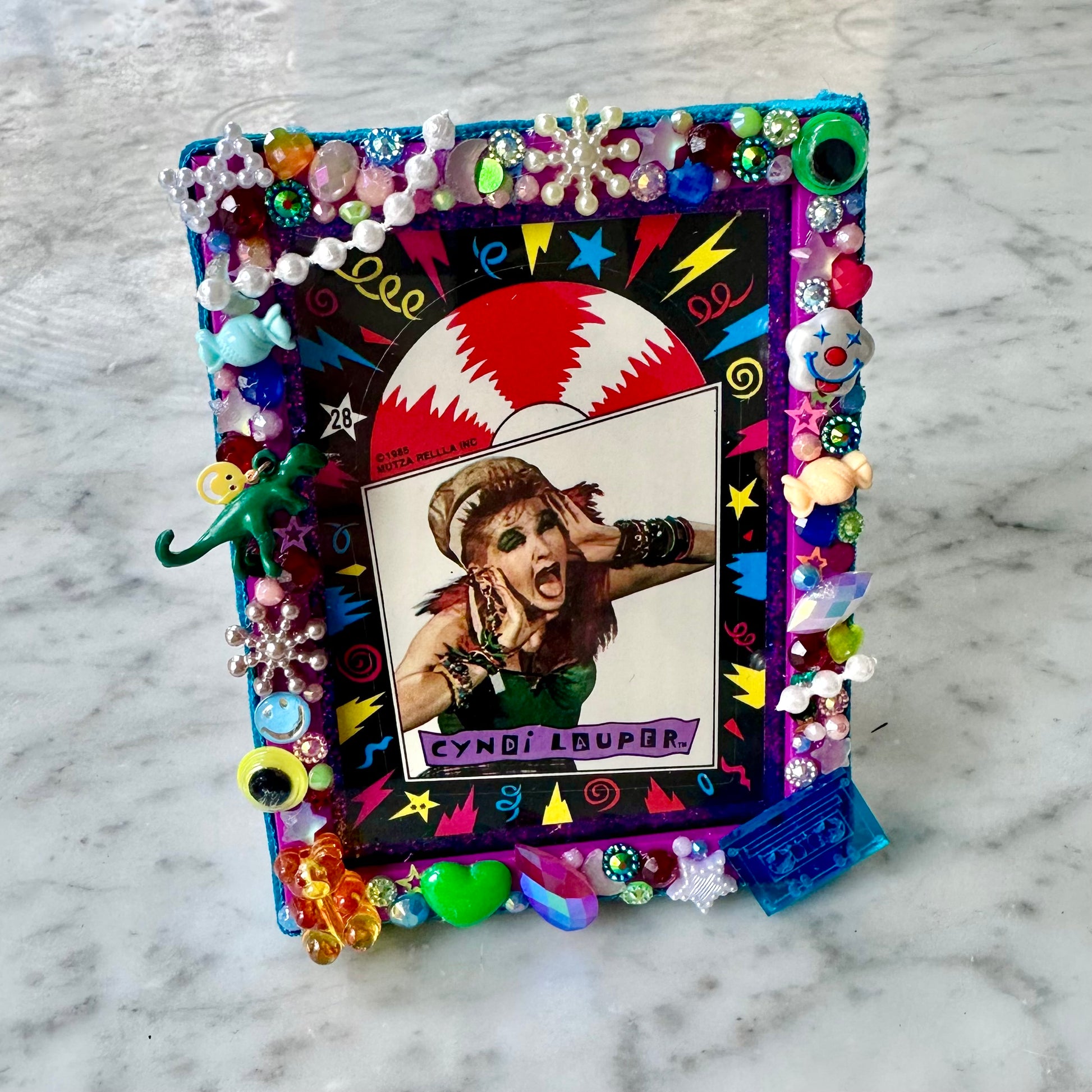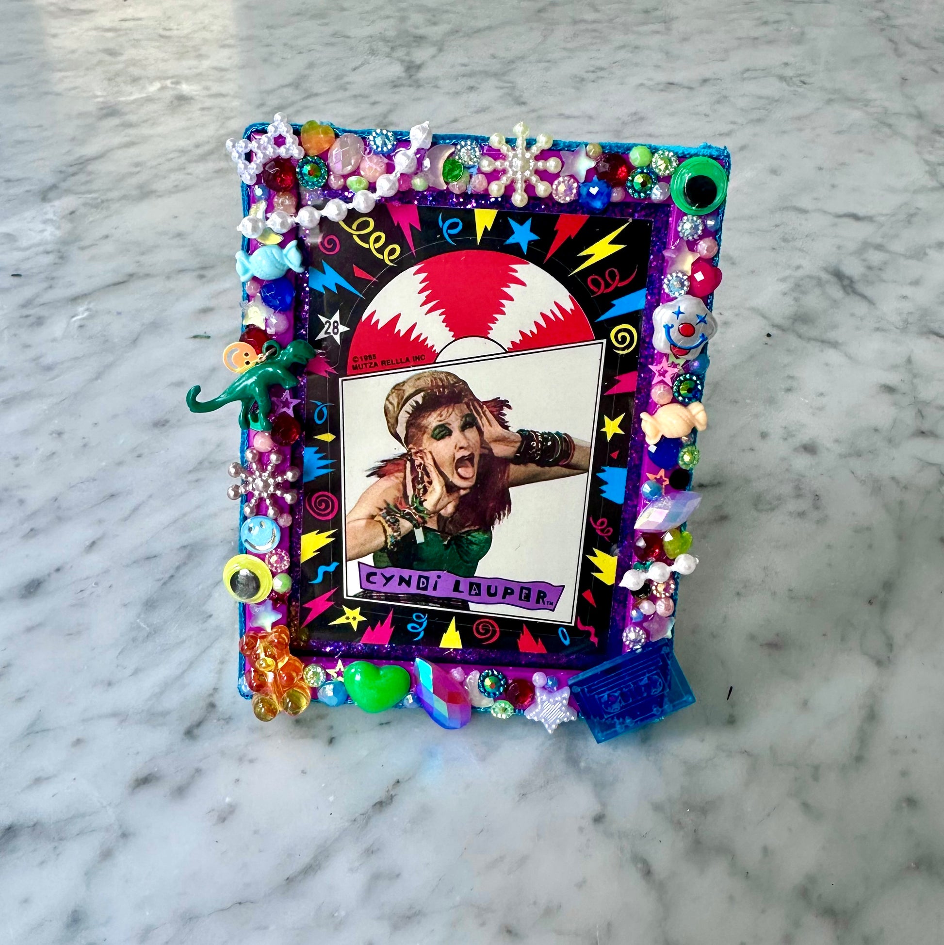 Vintage 80’s Cyndi Lauper sticker card matted on a deep purple glitter backing, in a 4.5” x 3.5” standing frame that I wrapped in velvet ribbon and adorned with tons of vintage (and newer) beads, charms, toys, sequins, etc!