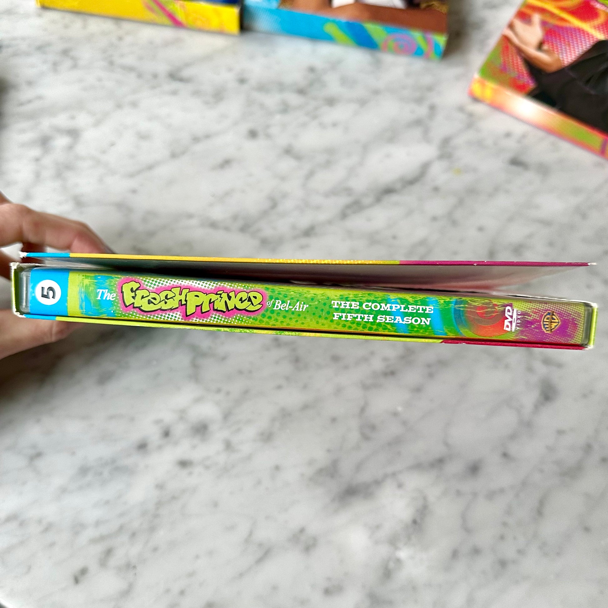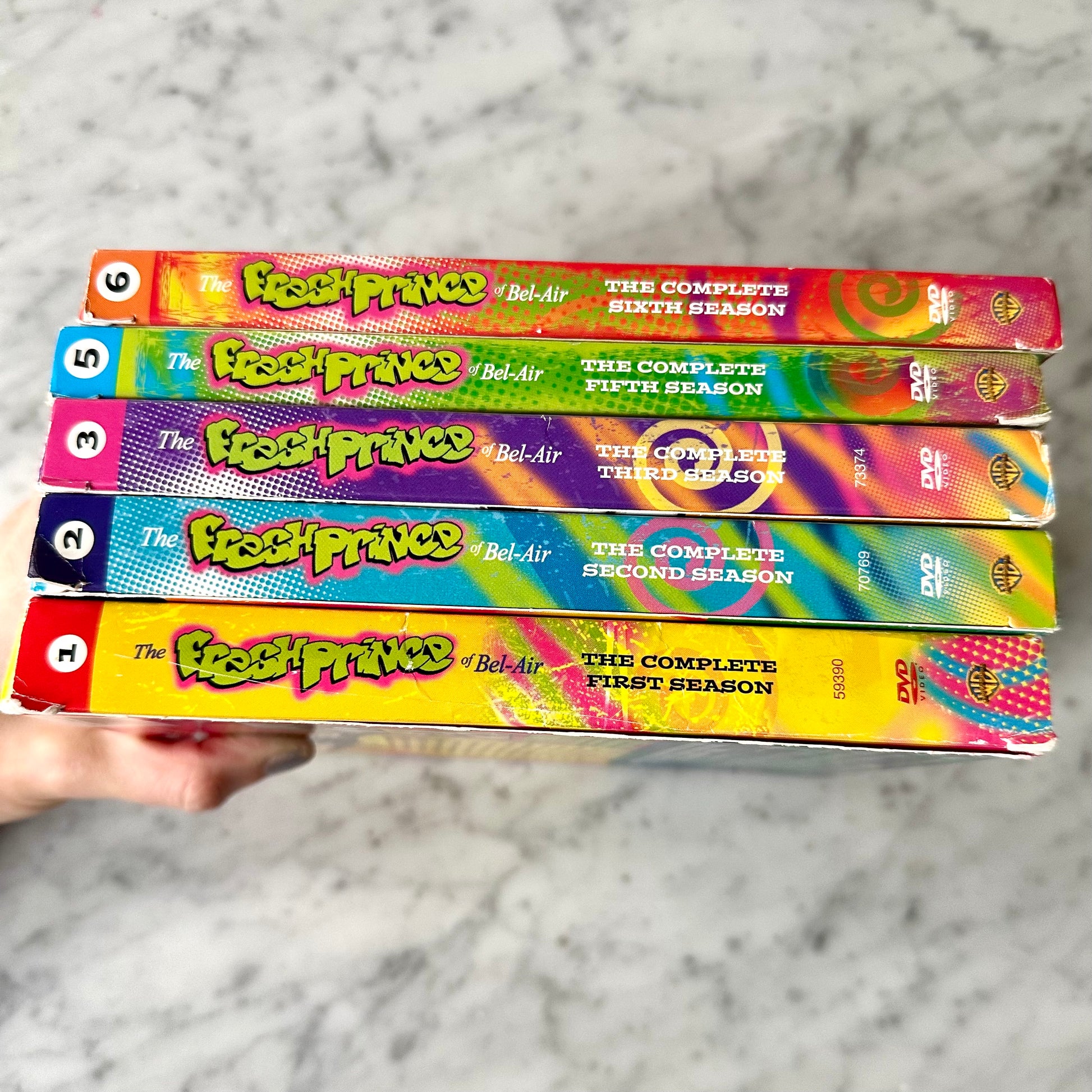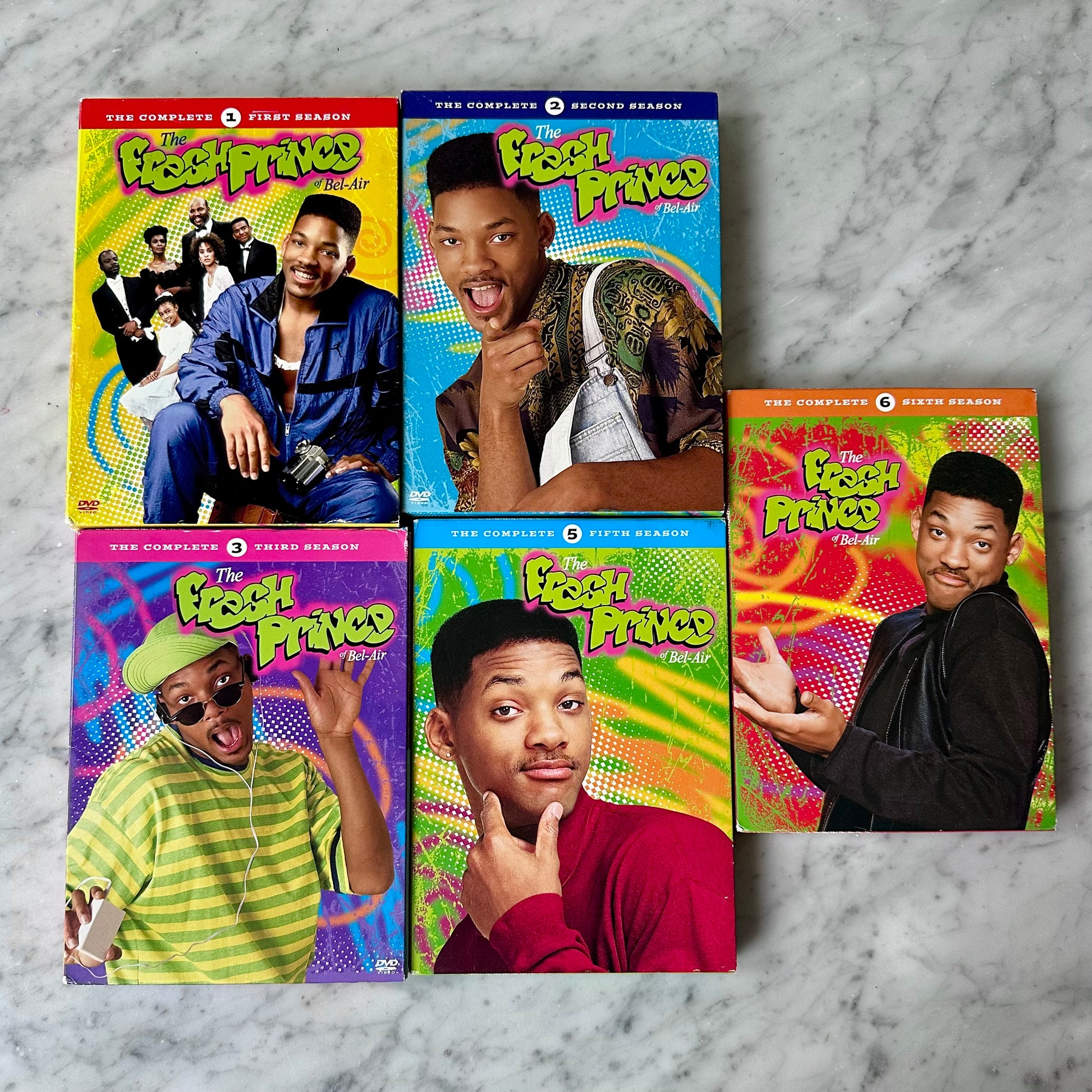 Fresh Prince of Bel-Air Seasons 1, 2, 3, 5, & 6 DVDs. These are in good condition with light surface scratching that doesn’t affect the way that they play. The season 1 disc 2 has a crack in the center plastic but it plays fine. The back of the box on season 5 is torn. Please see photos for details.