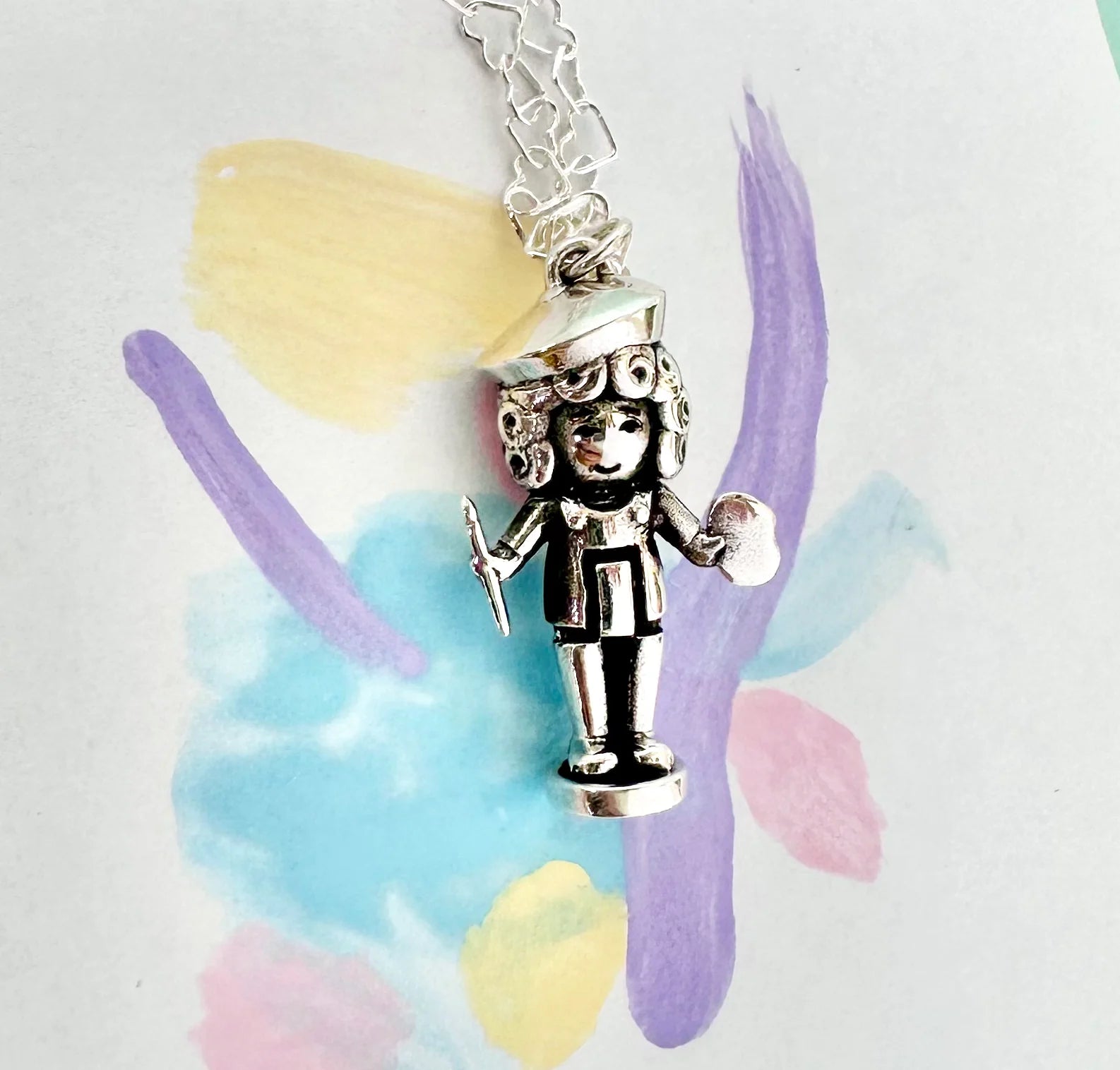 Super adorable sterling silver hand cast Polly Pocket artist doll hanging from a 17” sterling silver heart link chain.