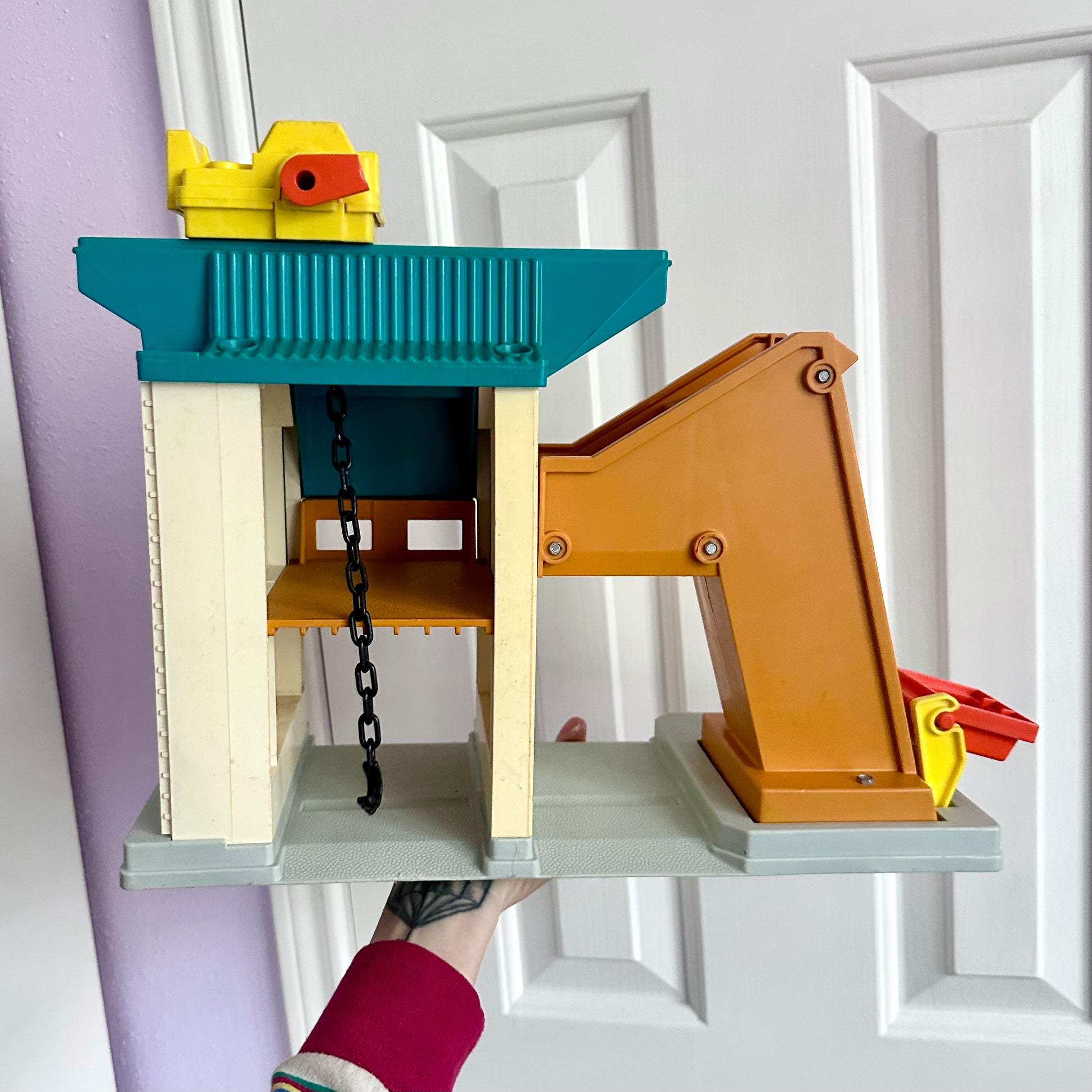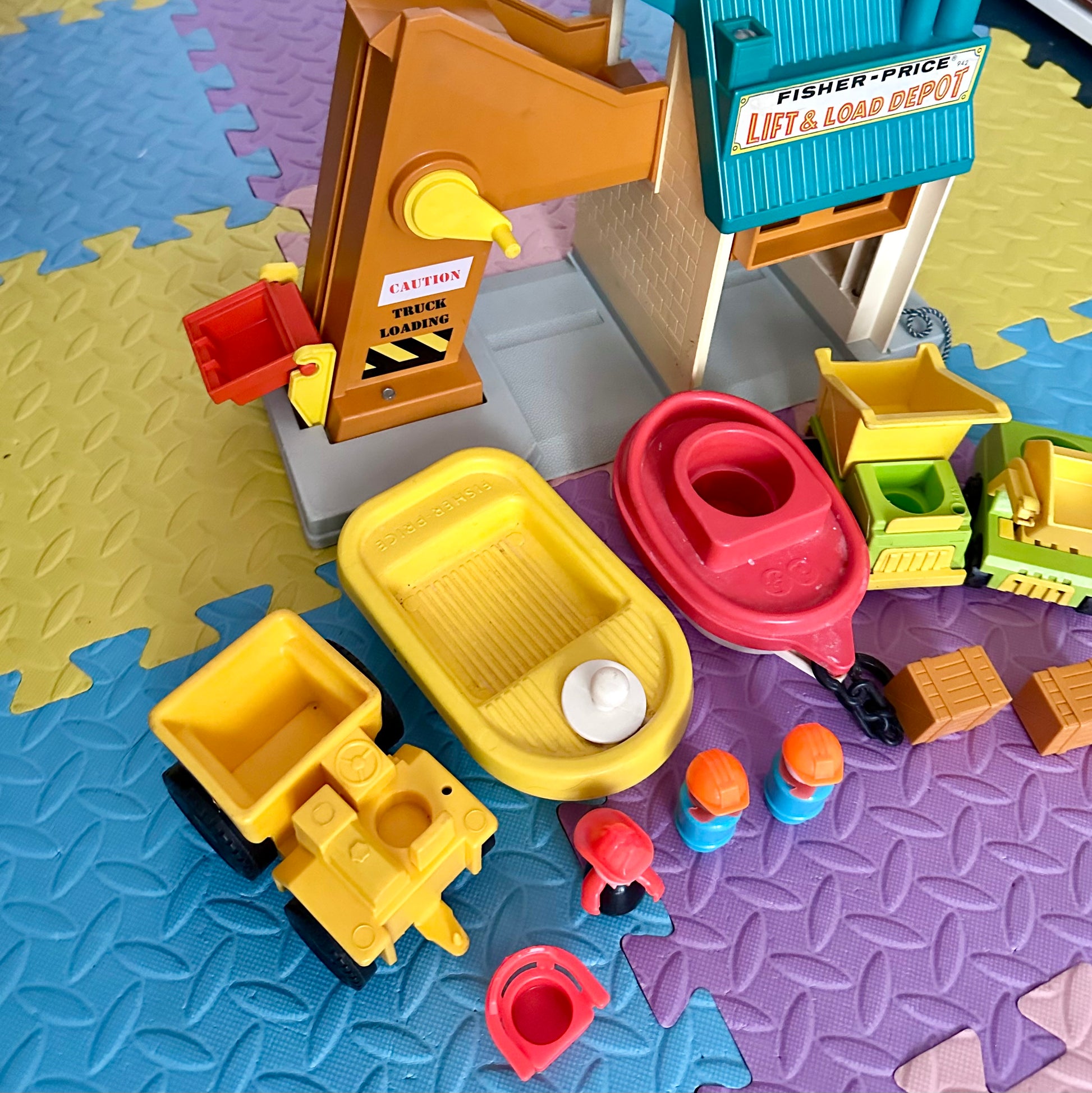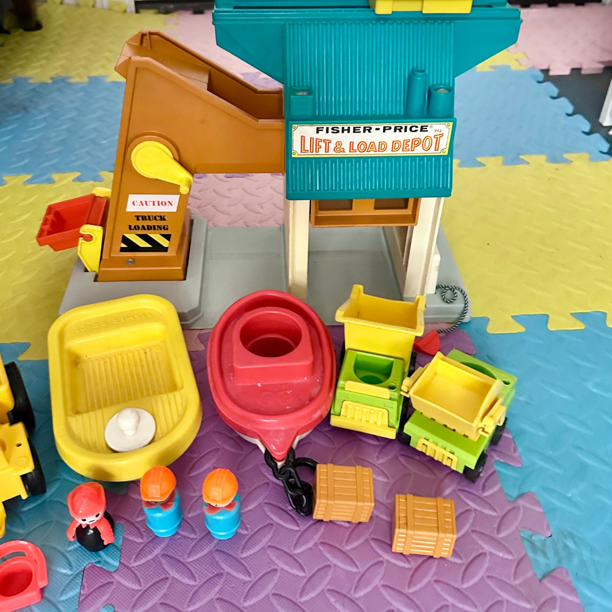 Vintage Fisher Price Lift & Load Depot. This comes with everything seen here. The bright red crank is broken but still works. Please see all photos as part of the description.