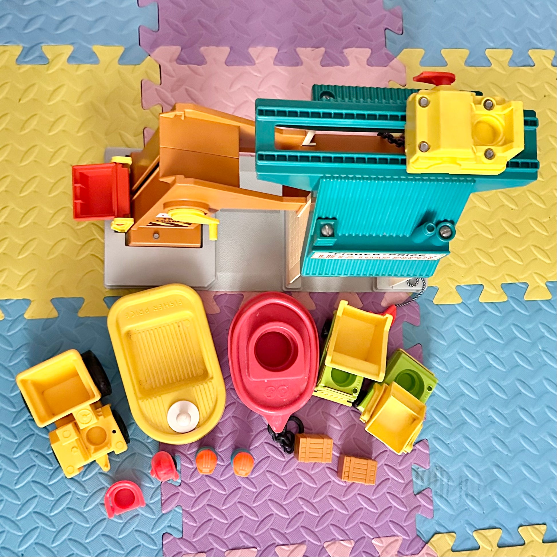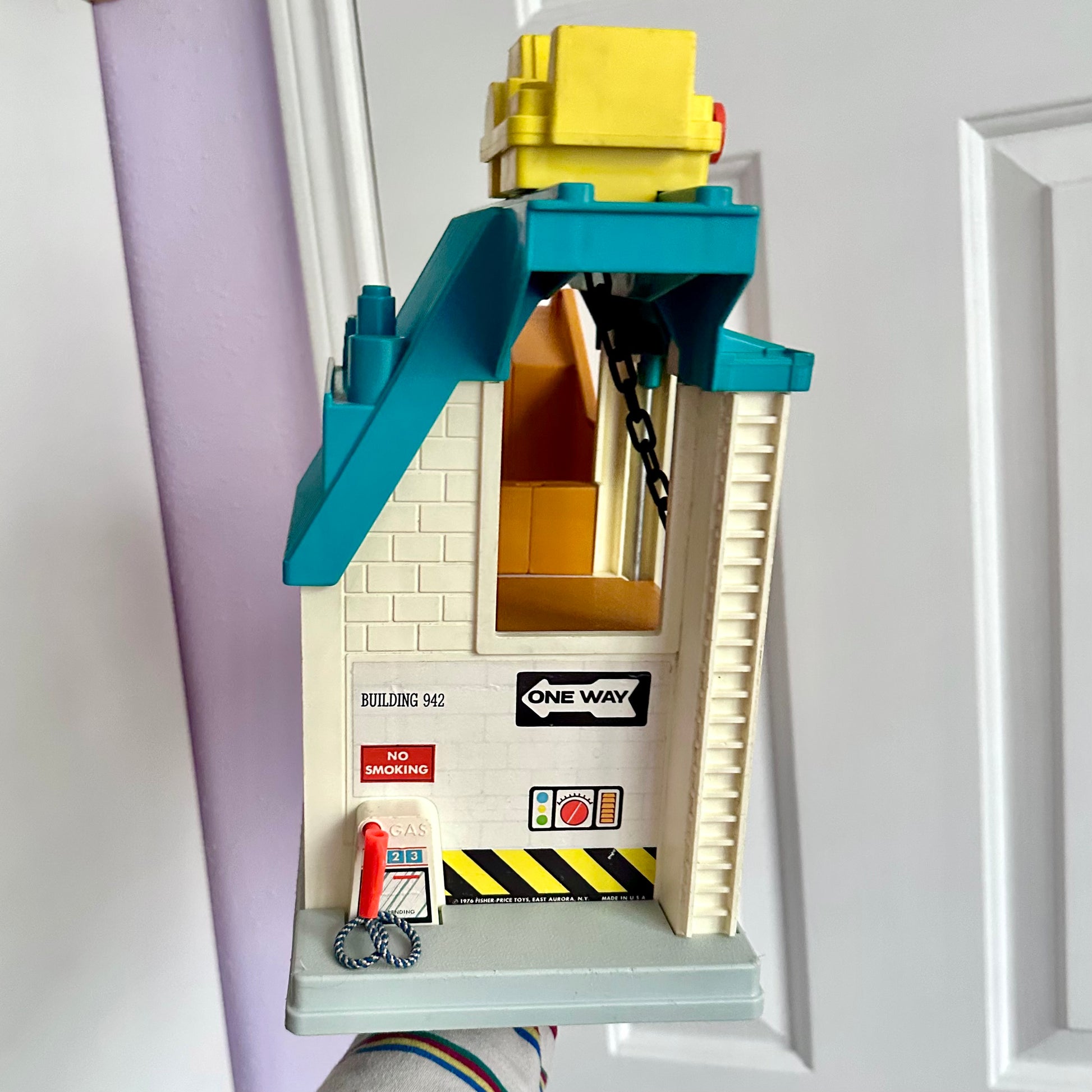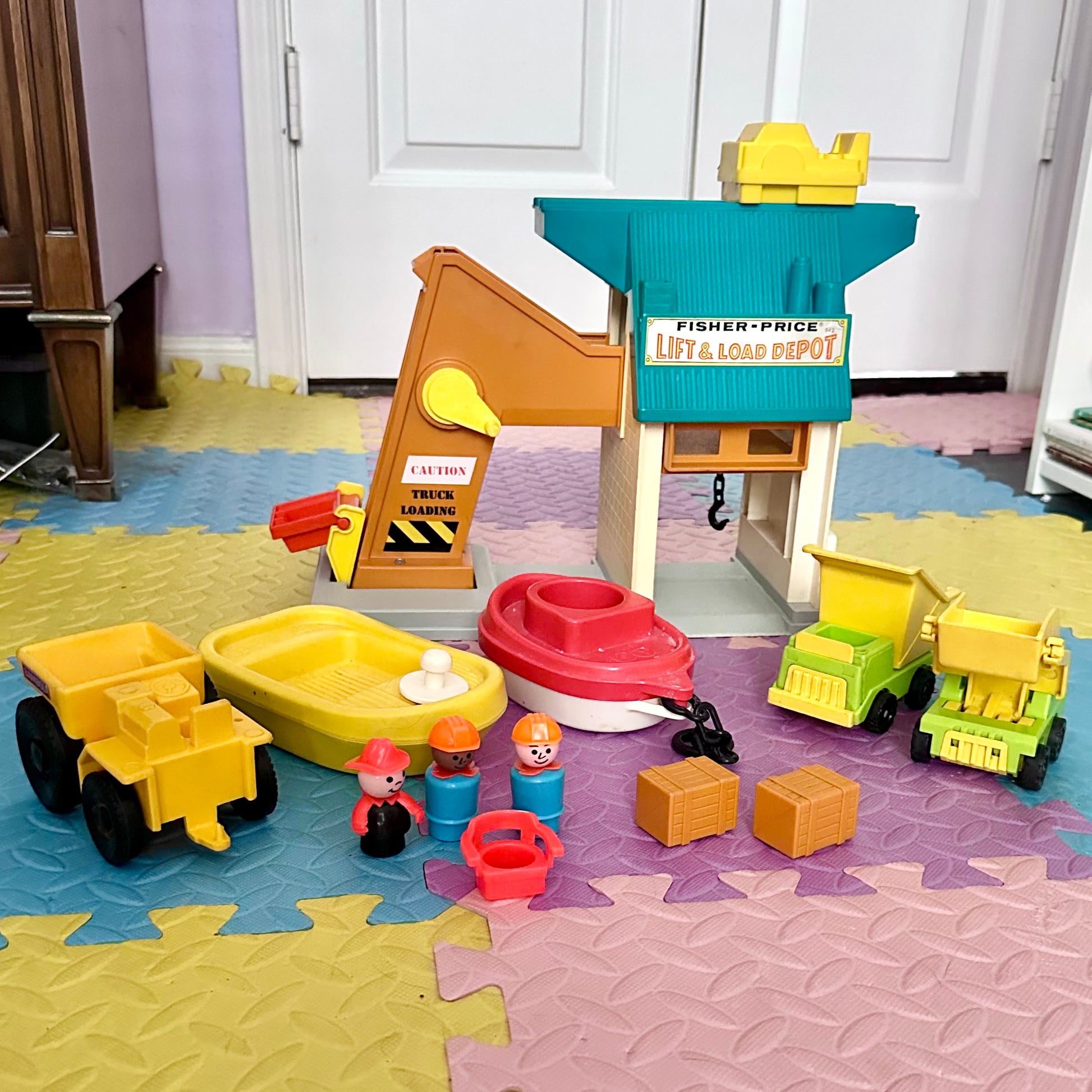 Vintage Fisher Price Lift & Load Depot. This comes with everything seen here. The bright red crank is broken but still works. Please see all photos as part of the description.