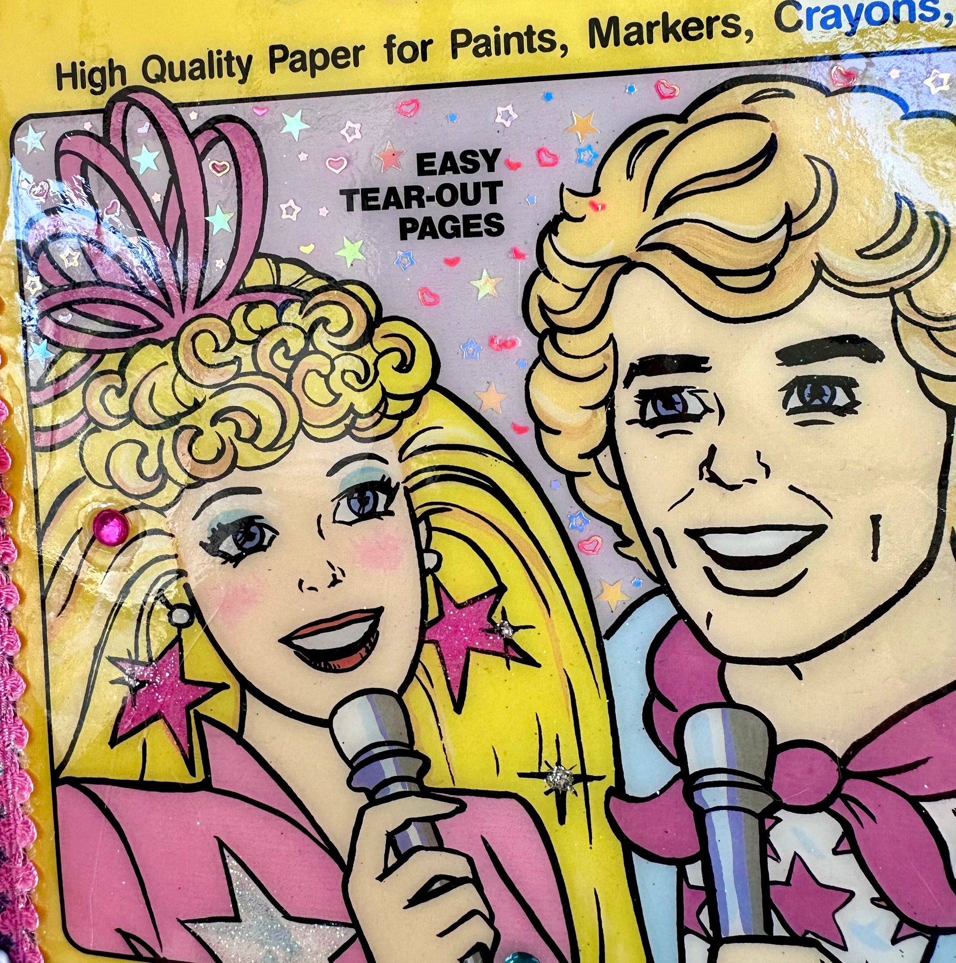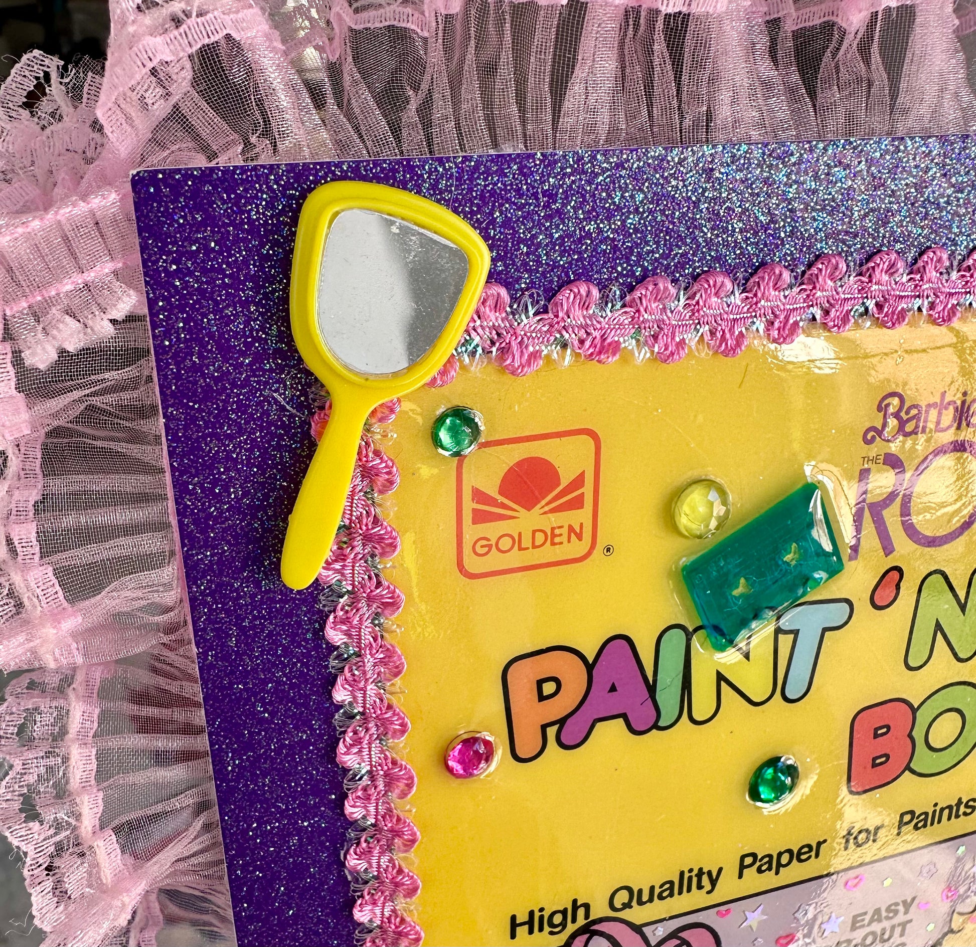 Vintage 80’s Barbie Paint n’ Marker book cover decorated with glitter and cabochons and securely covered in clear resin. This comes in a ribbon “frame” with adhesive Velcro for easy wall hanging.