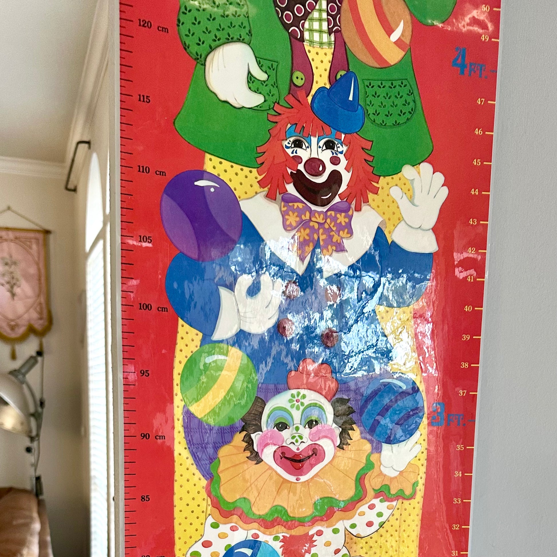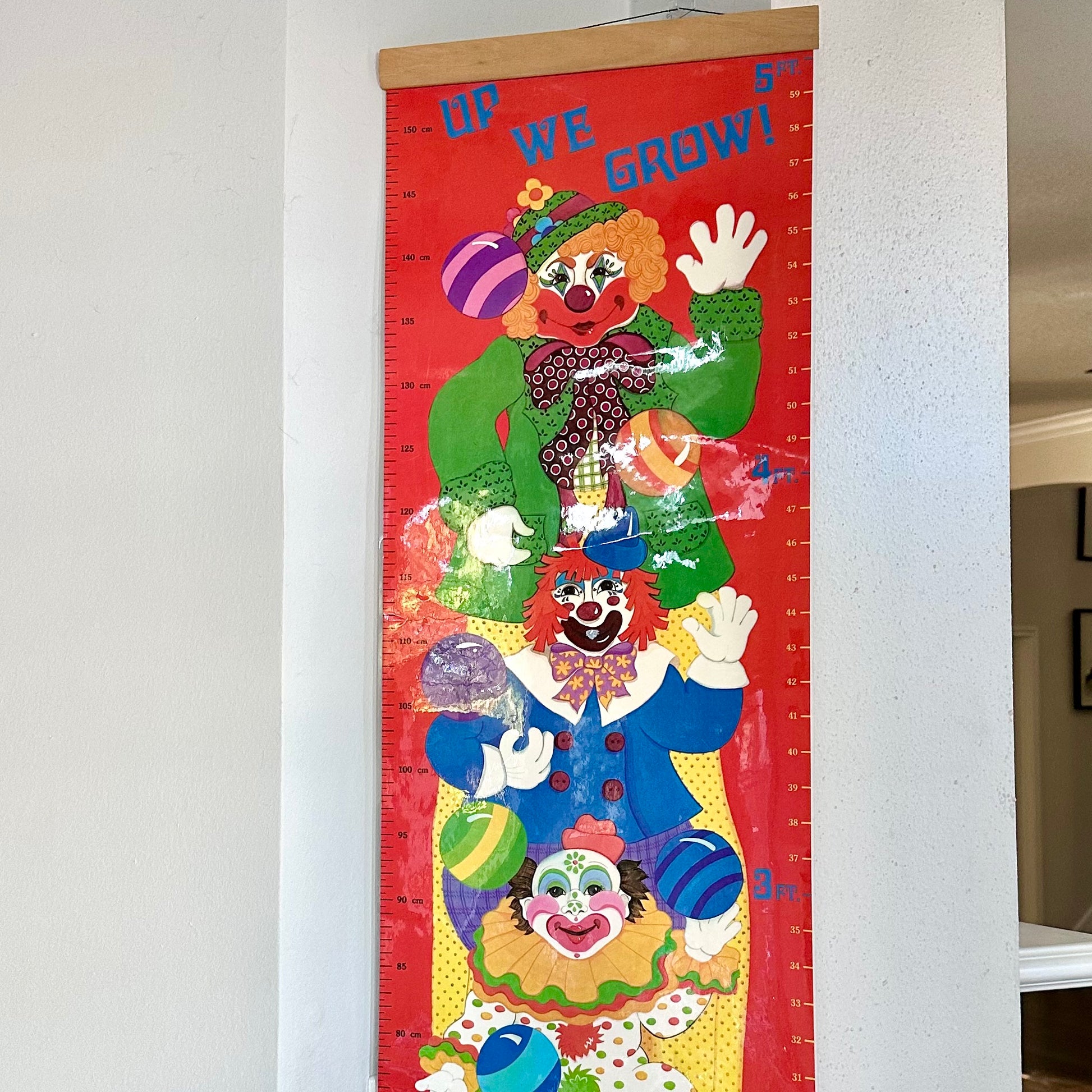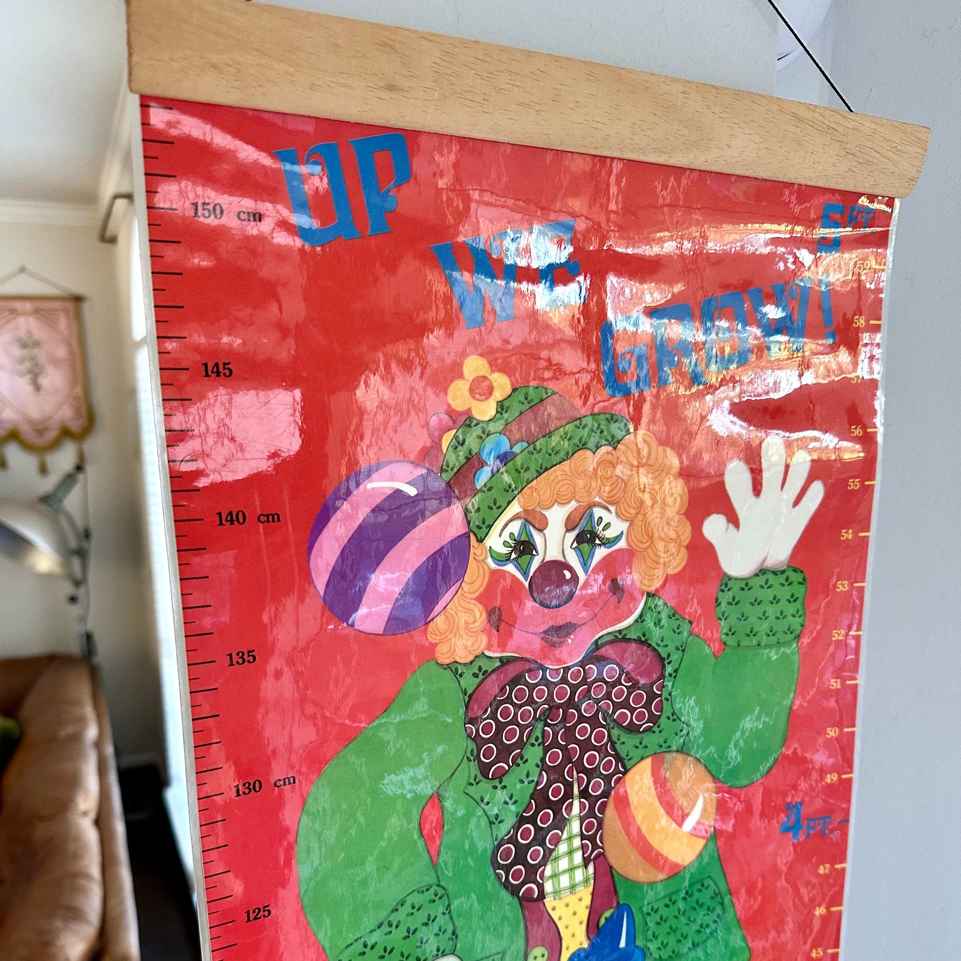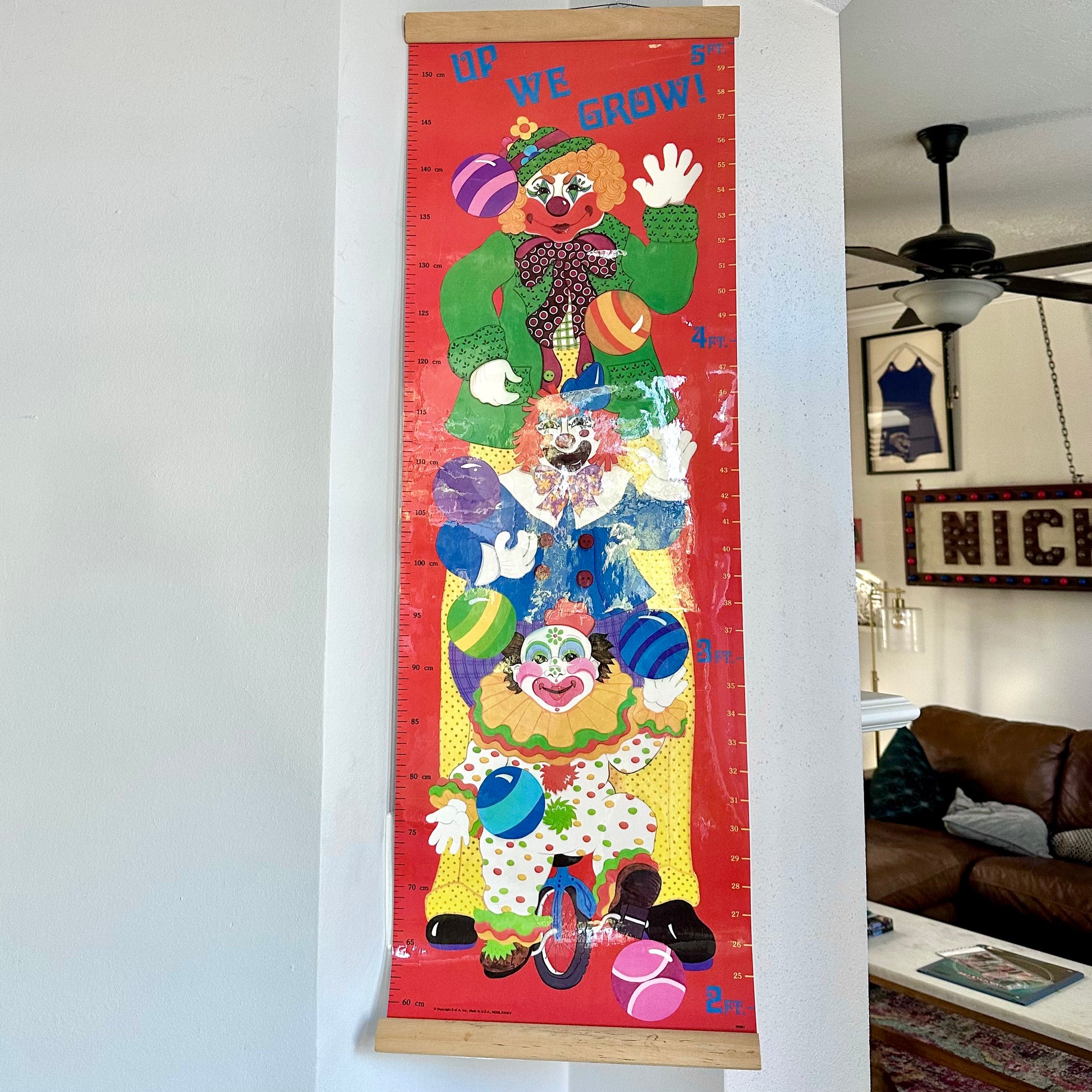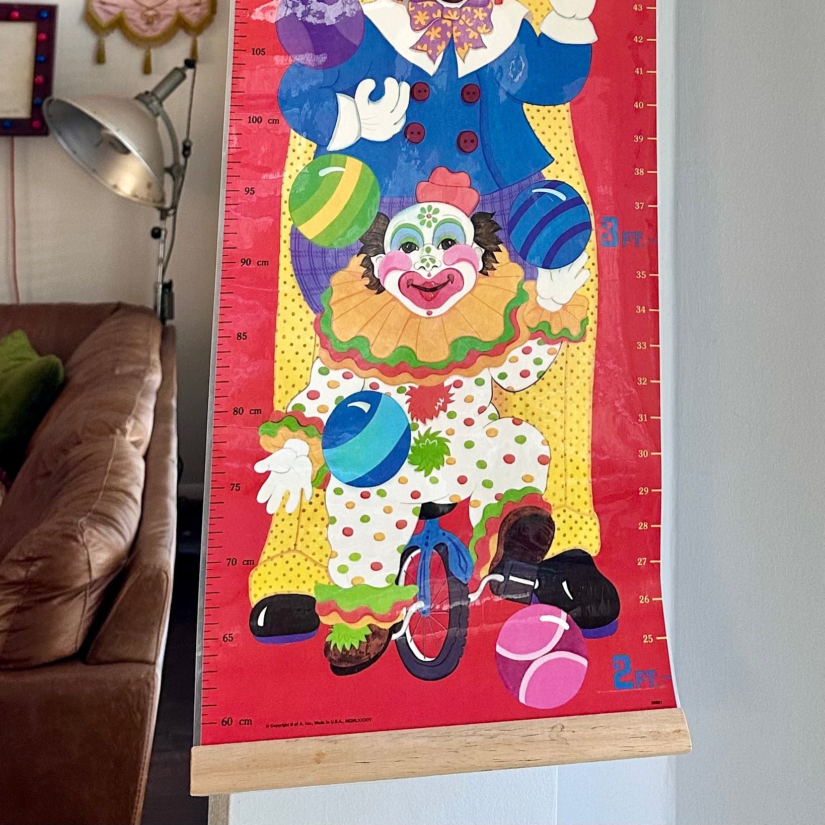 Vintage clown height chart. This chart is in fantastic condition. The chart itself is laminated and secured with wood on wither end with a string for hanging.