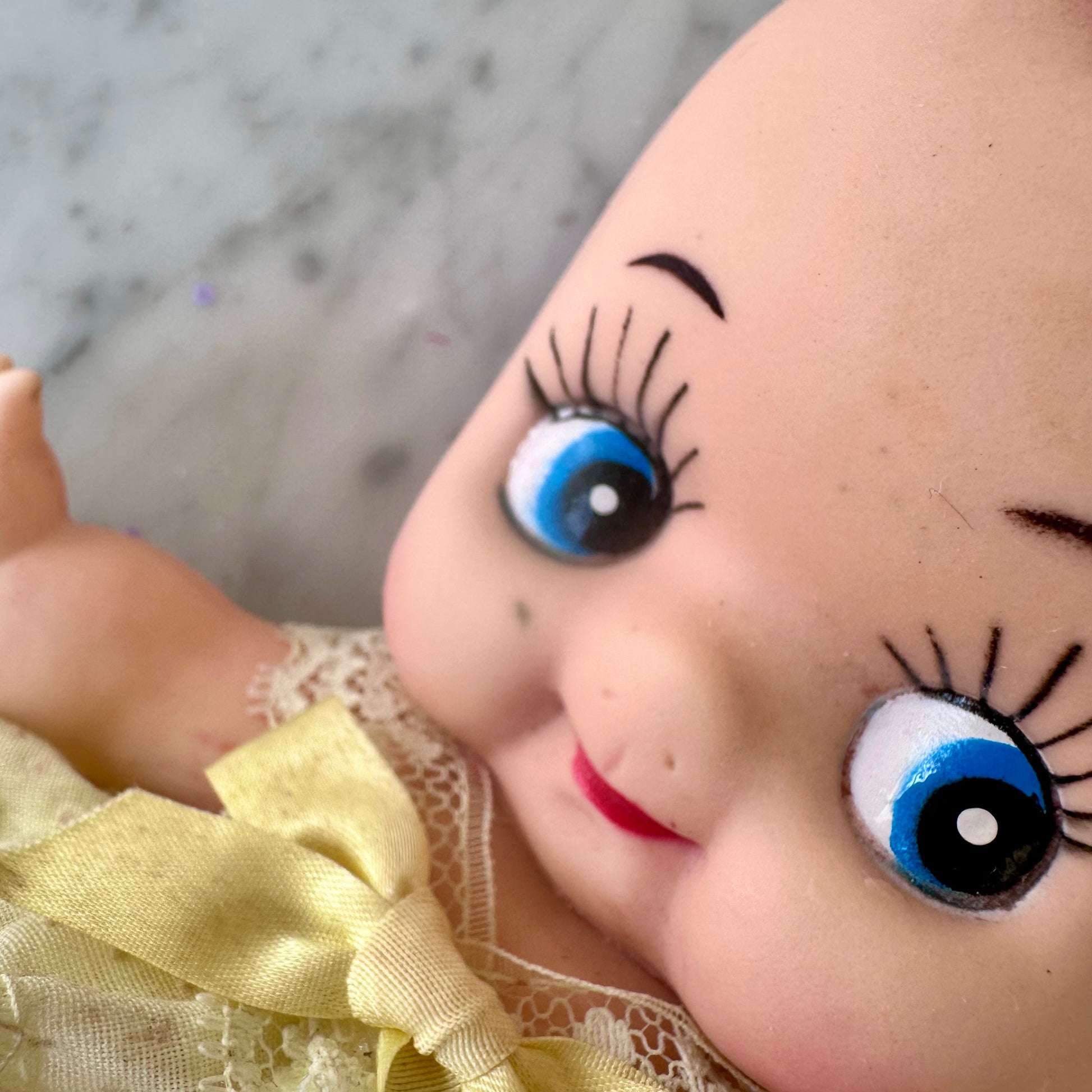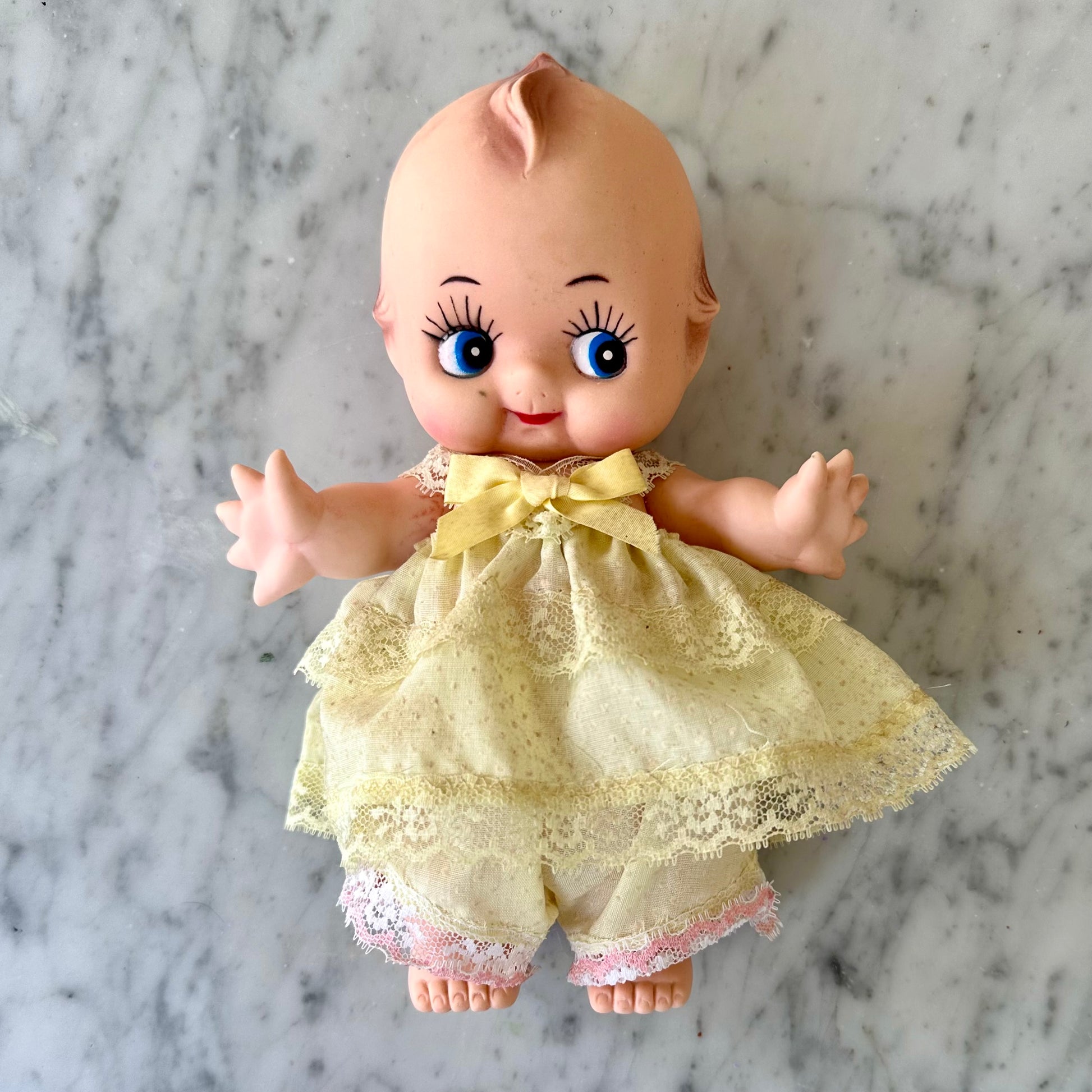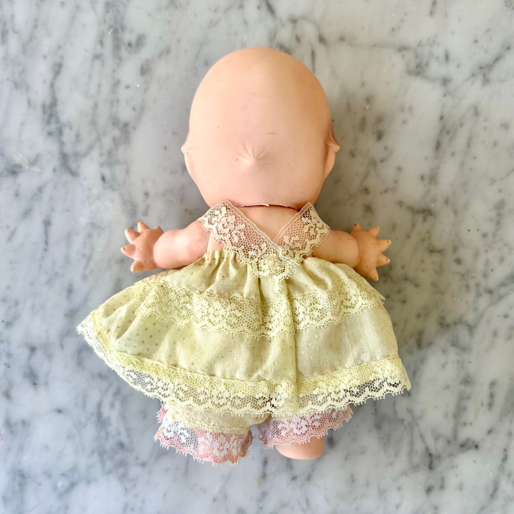 Vintage Rubber Kewpie doll in a precious yellow dress and bloomers. This doll has a few spots, please see photos for details.